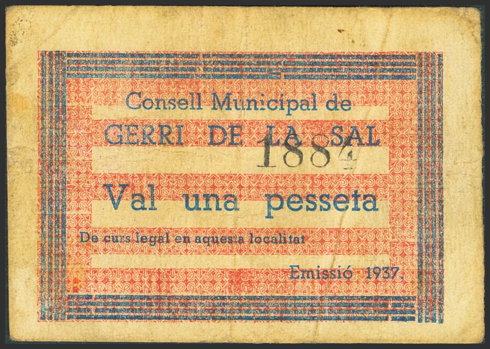 GERRI DE LA SAL (LERIDA). 1 Peseta. (1937ca). (González: 8019). Raro. MBC.