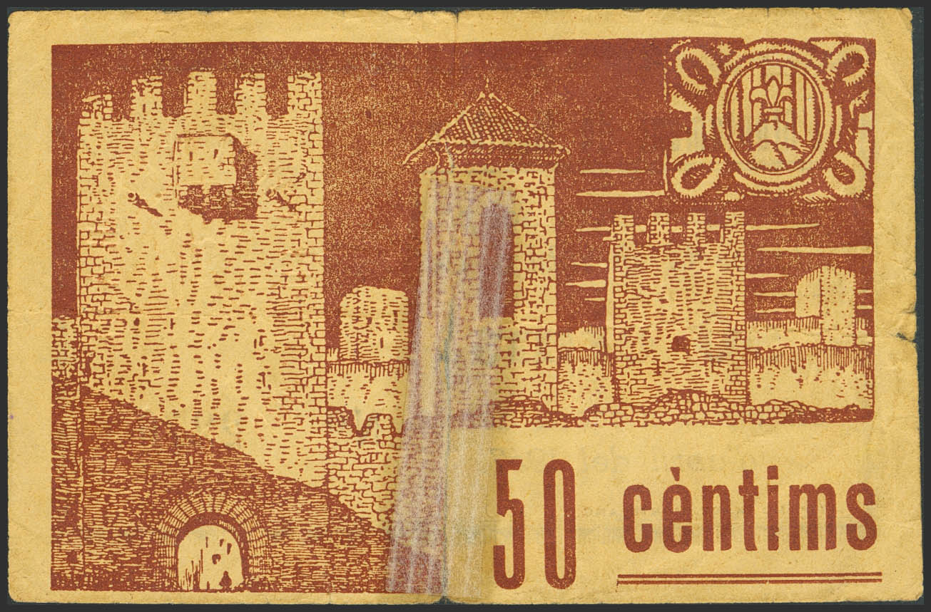 MONTBLANC (TARRAGONA). 50 Céntimos. 26 de Abril de 1937. (González: 8747). Inusual, presencia de cinta adhesiva. BC.
