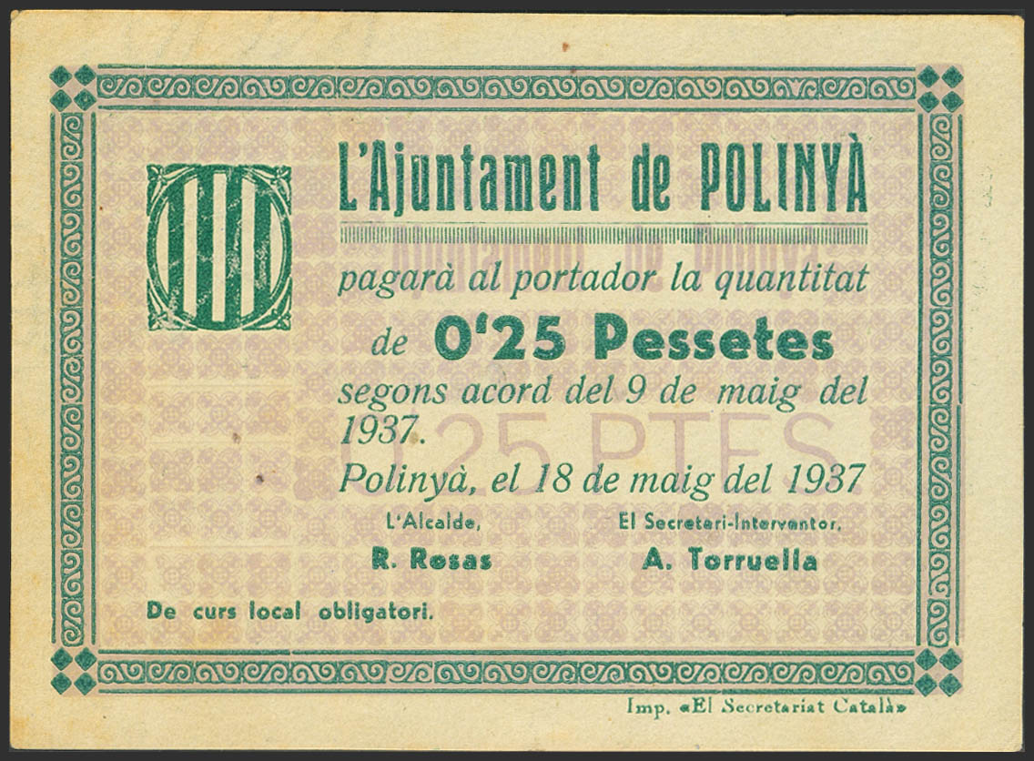 POLINYA (BARCELONA). 25 Céntimos. 18 de Mayo de 1937. (González: 9360). Inusual, especialmente en esta calidad. SC--.