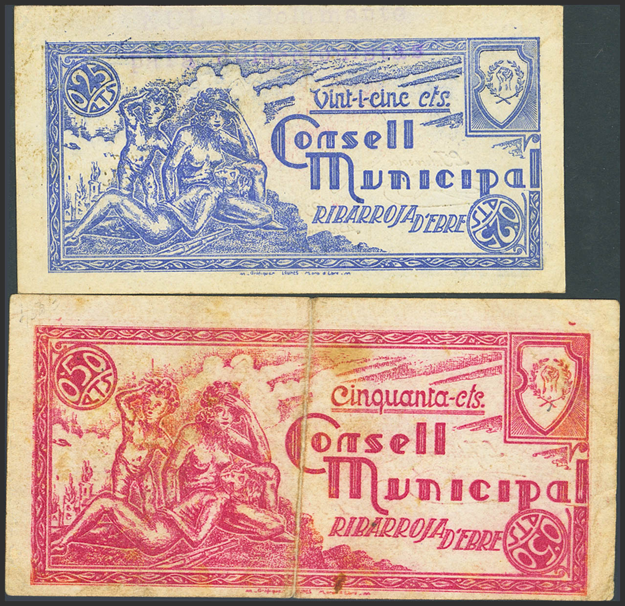 RIBARROJA DE EBRE (TARRAGONA). 25 Céntimos y 50 Céntimos. (1937ca). (González: 9606, 9607). Inusuales. MBC-.
