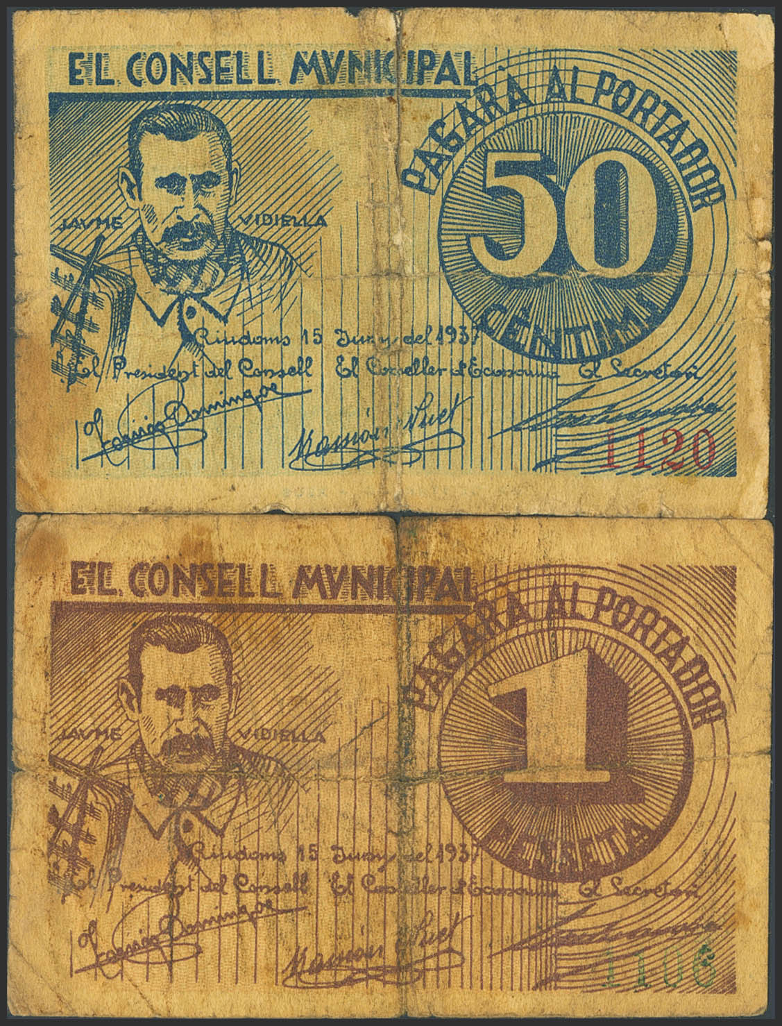 RIUDOMS (TARRAGONA). 50 Céntimos y 1 Peseta. 15 de Junio de 1937. (González: 9696/97). Rara serie completa. BC-.