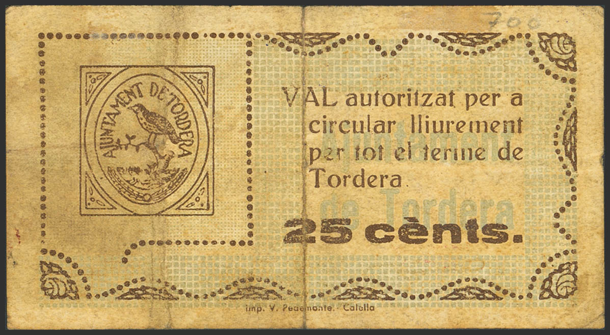TORDERA (BARCELONA). 25 Céntimos. 8 de Septiembre de 1937. Serie C. (González: 10306). Inusual. MBC-.