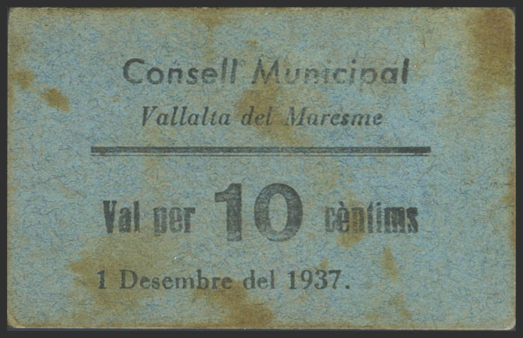 VALLALTA DEL MARESME (BARCELONA). 10 Céntimos. 1 de Diciembre de 1937. (González: 10486). Raro. EBC.