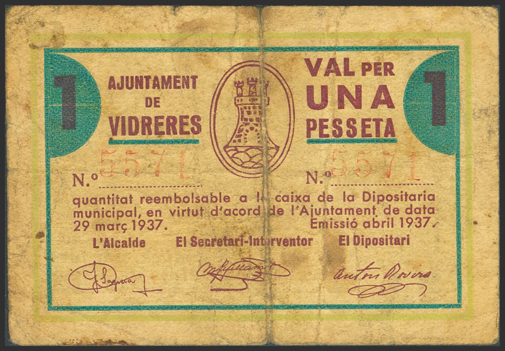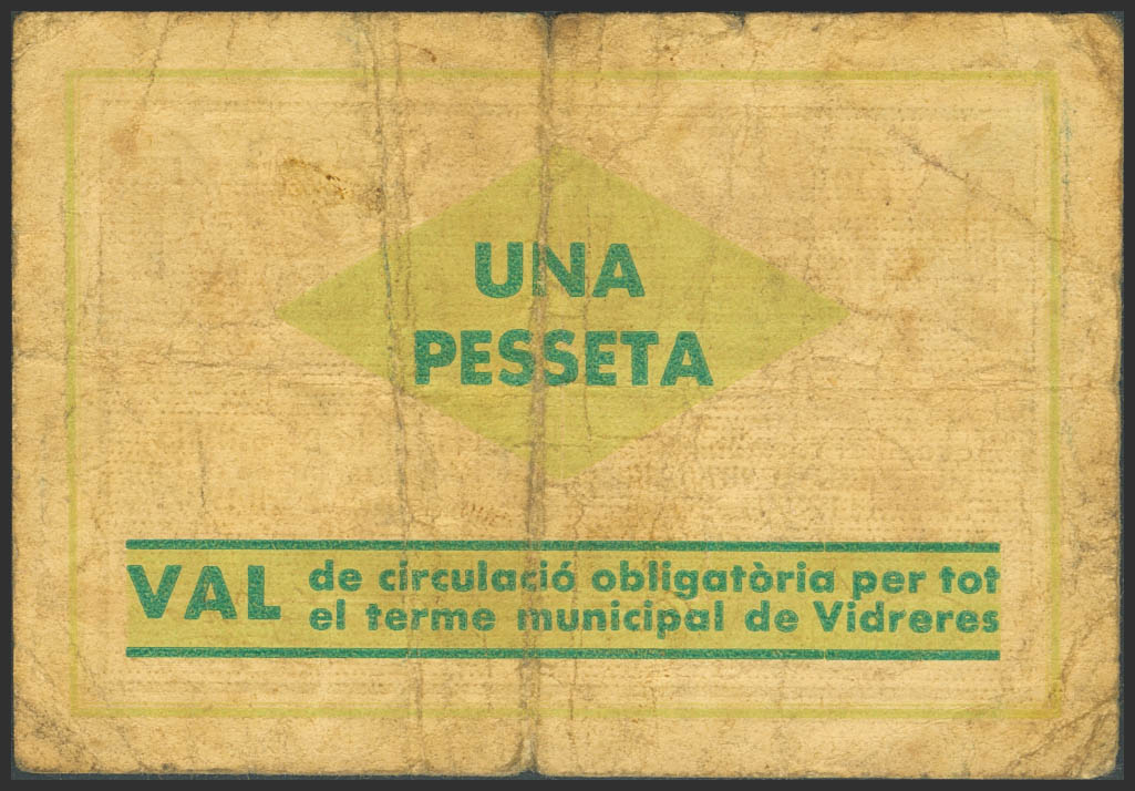 VIDRERES (GERONA). 1 Peseta. Abril de 1937. (González: 10647). Raro. BC+.