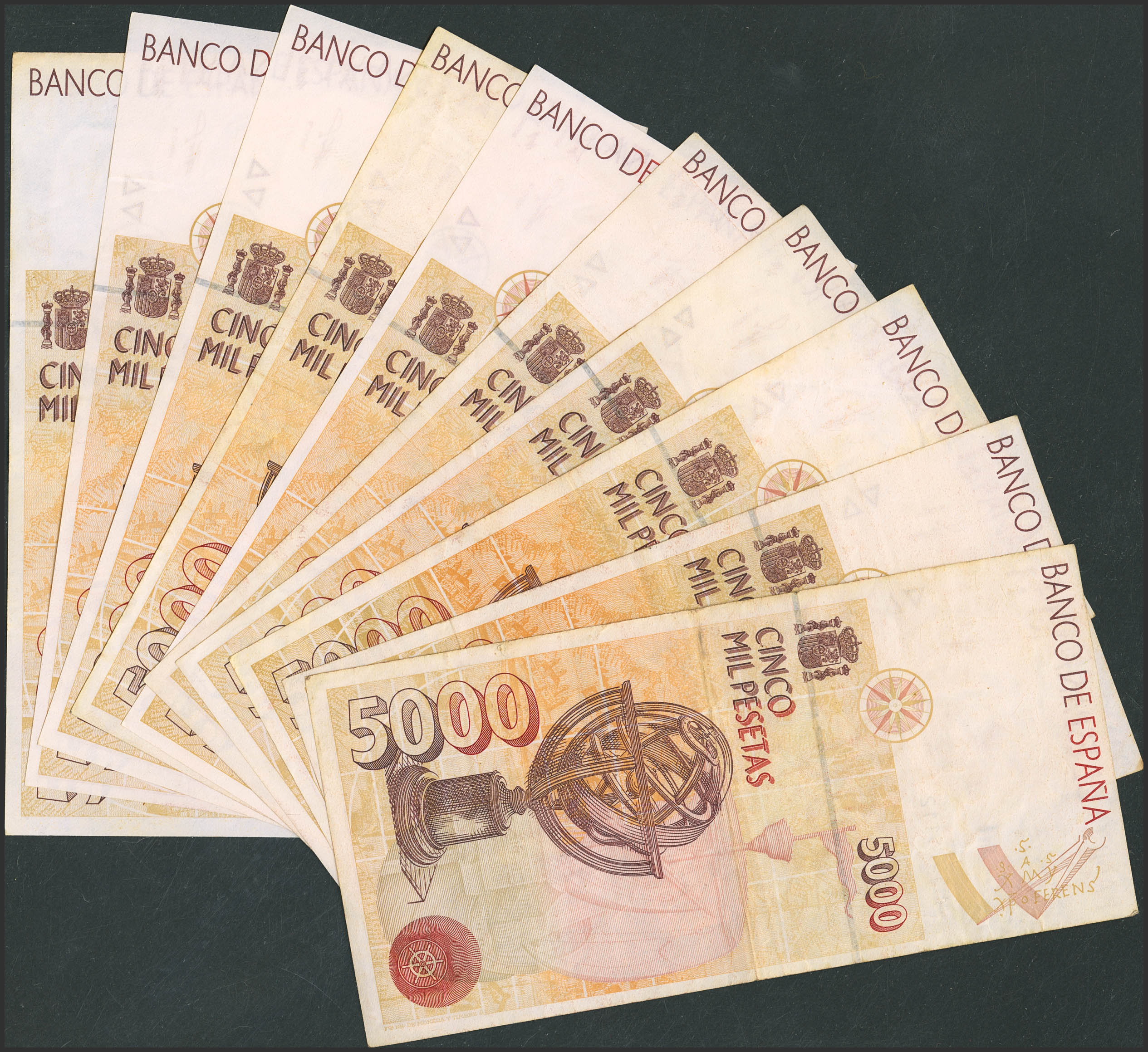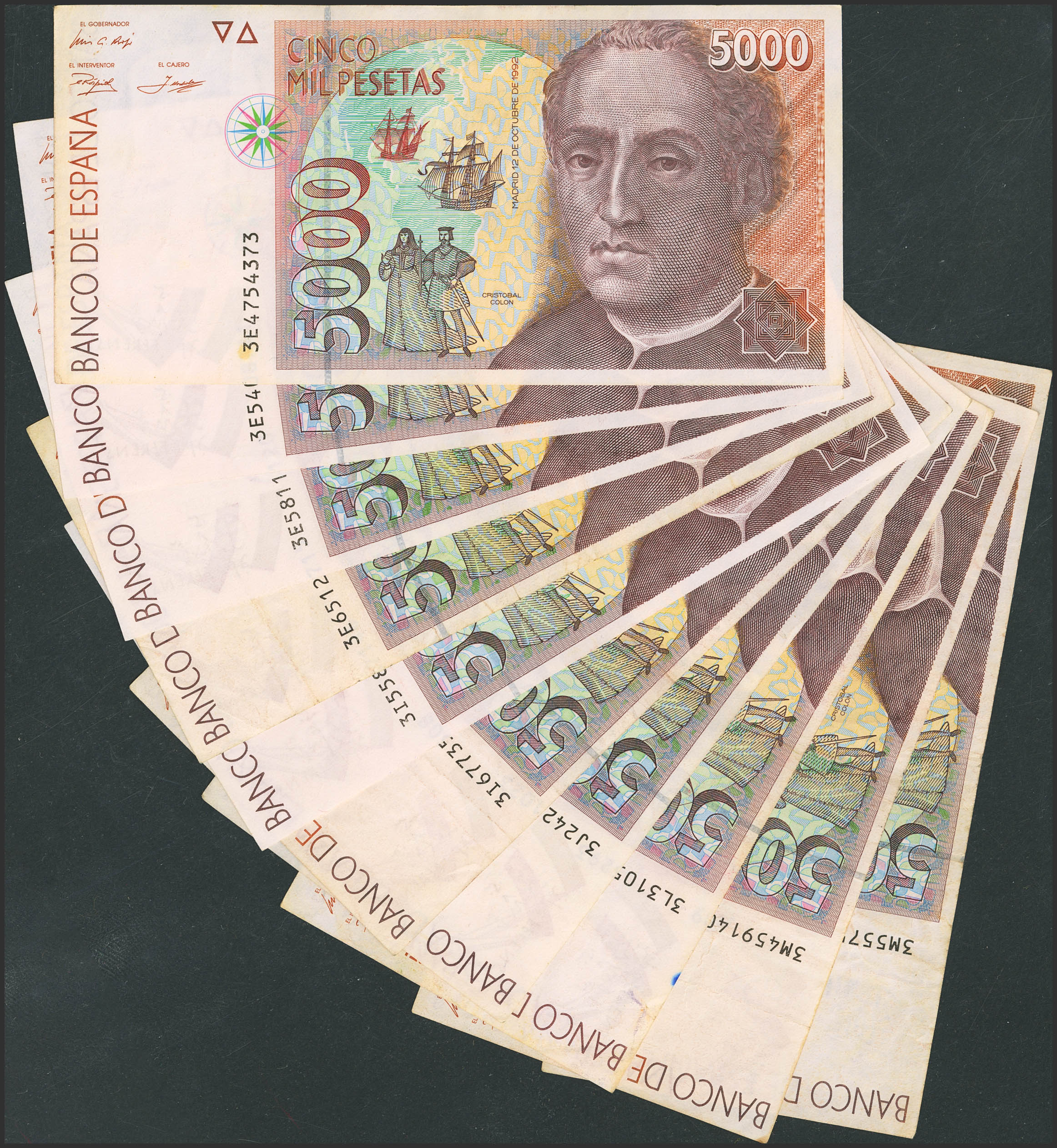 Conjunto de 10 billetes de 5000 Pesetas emitidos el 12 de Diciembre de 1992, diversas series. (Edifil 2023: 484a). A EXAMINAR,