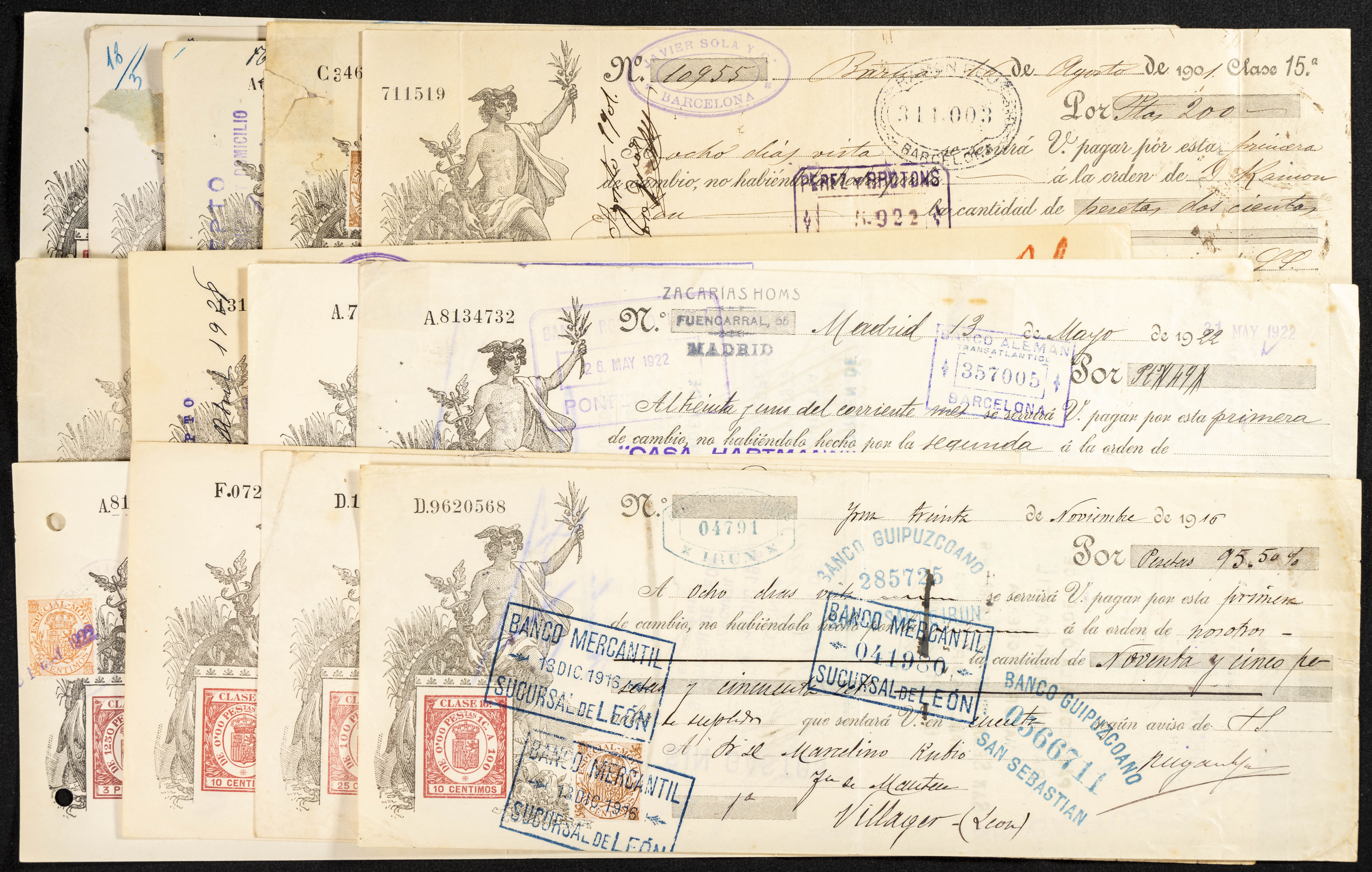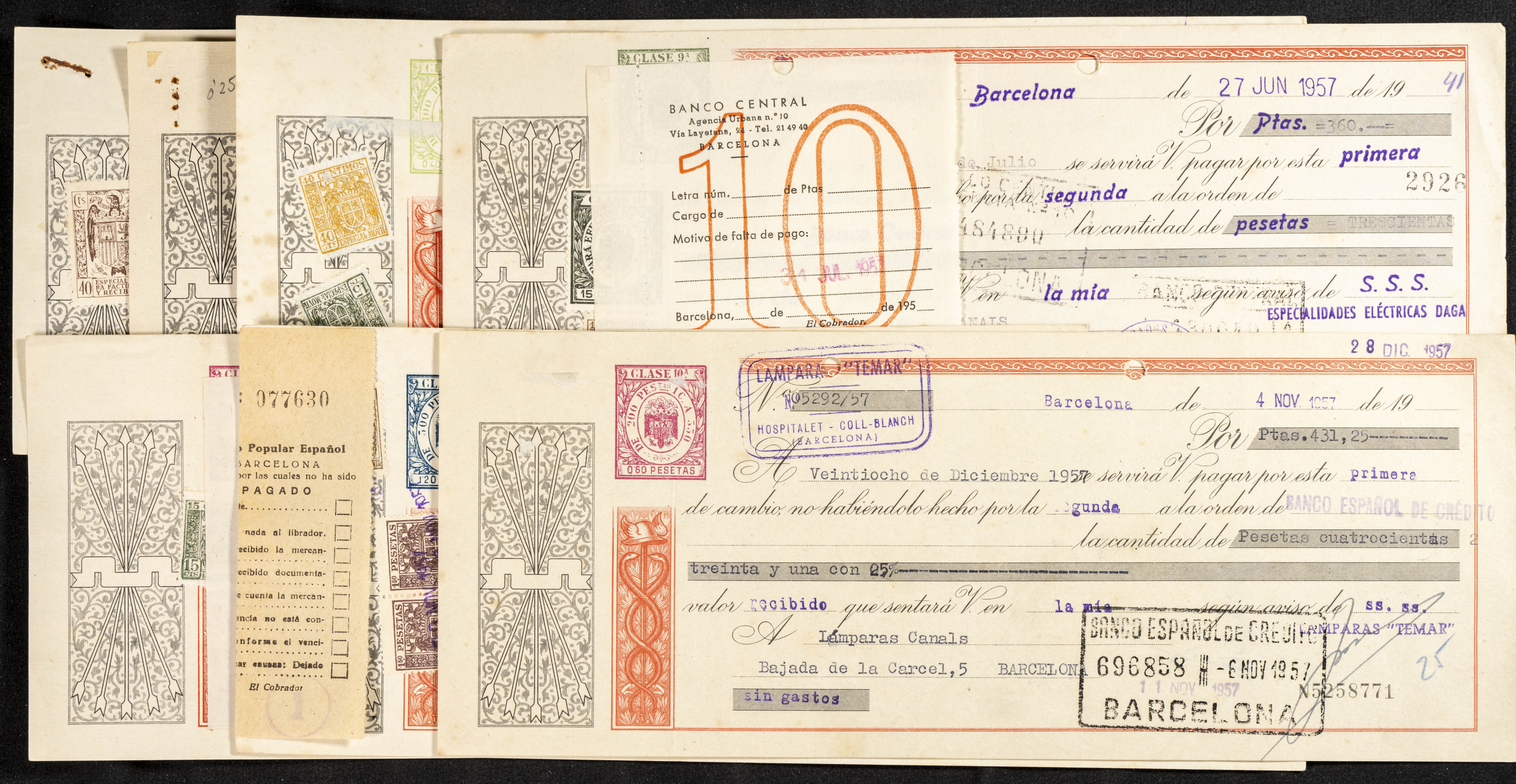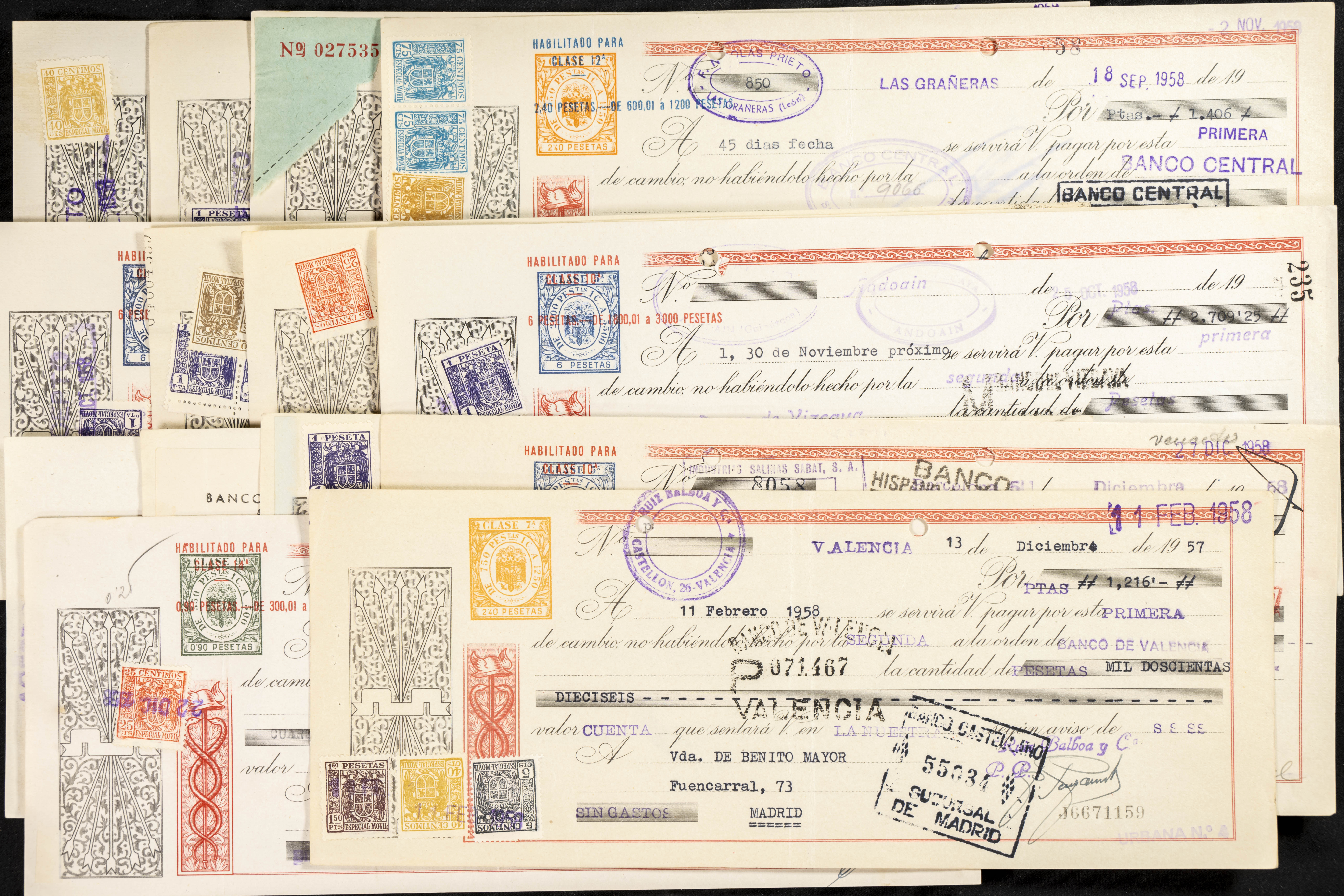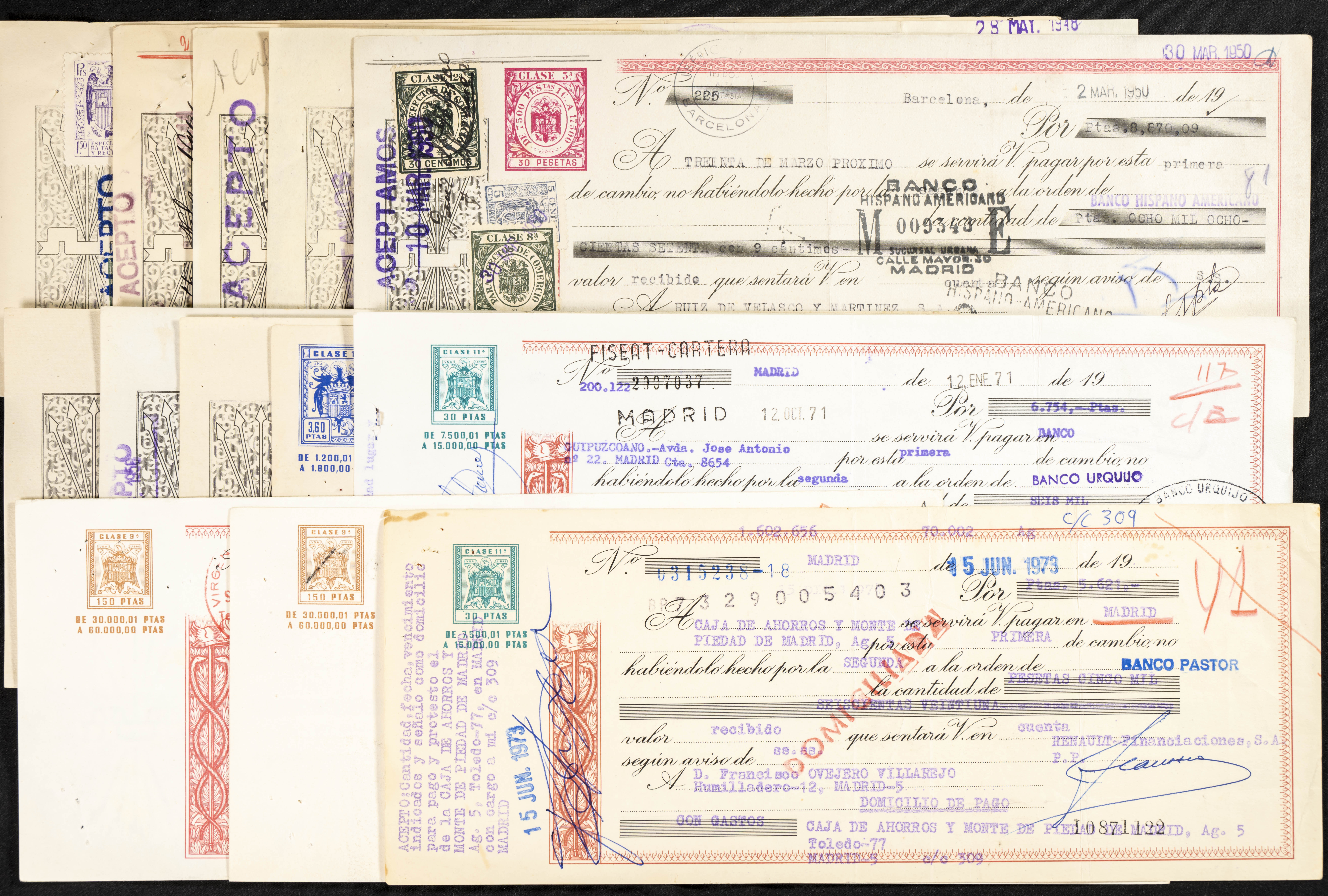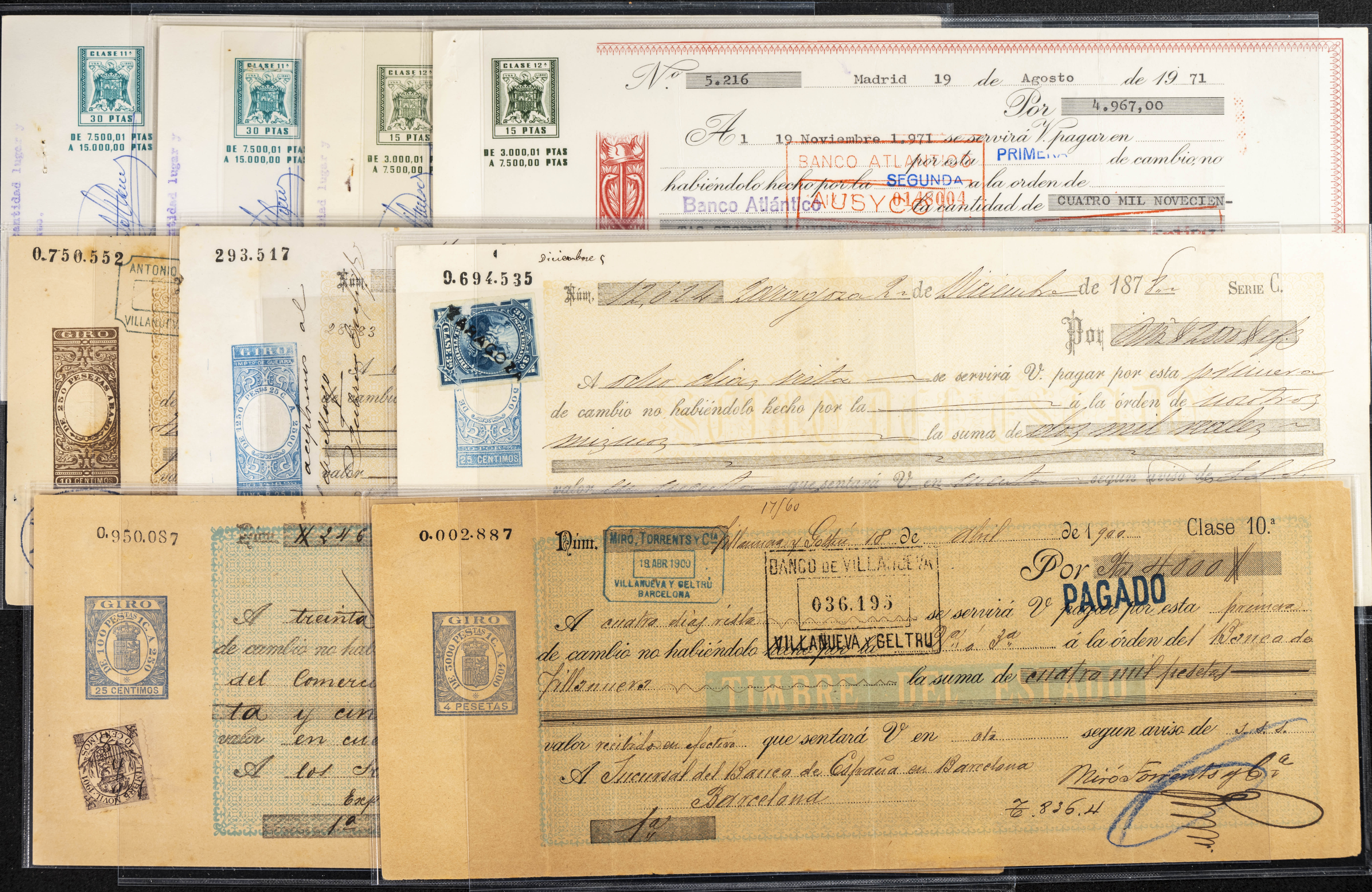 Interesante y muy amplio conjunto formado por cientos de pagarés, letras o cheques emitidos en España a lo largo de los siglos XIX y XX, su emisión corresponde, principalmente, a entidades privadas aunque encontramos también ejemplares emitidos por el Banco de España y presentando, una buena parte de ellos, sellos fiscales impresos o adheridos, diferentes estados de conservación. A EXAMINAR.