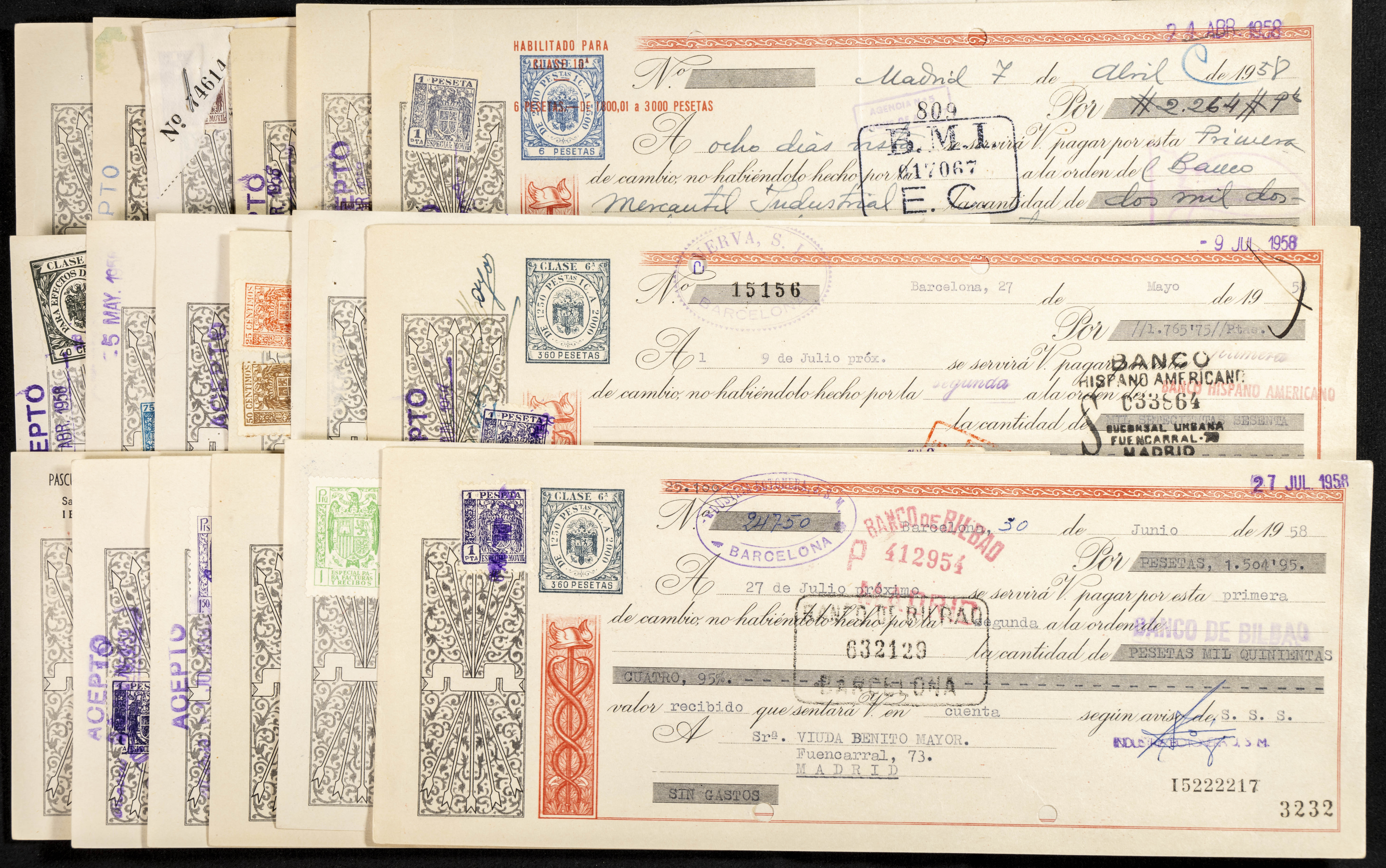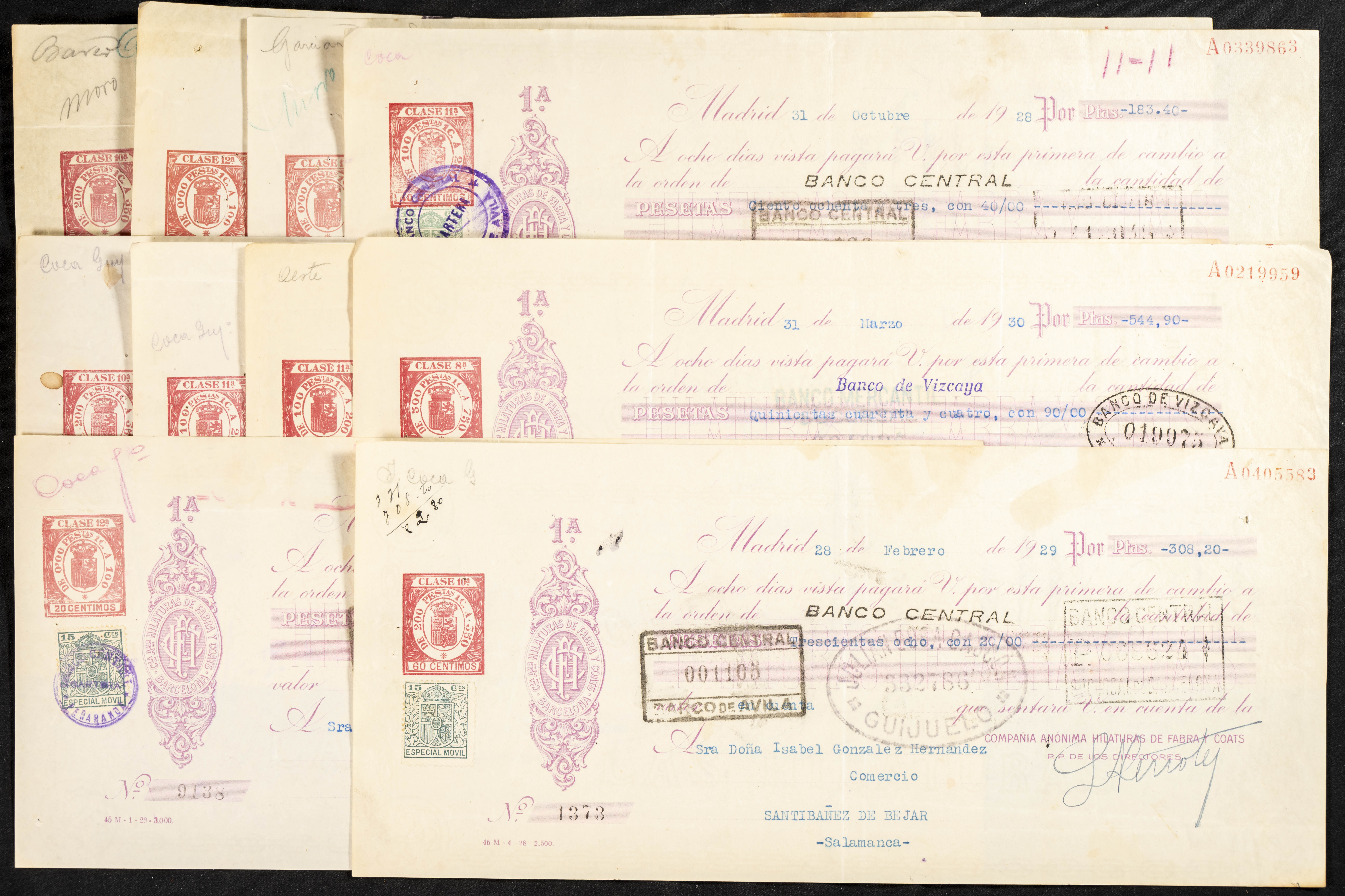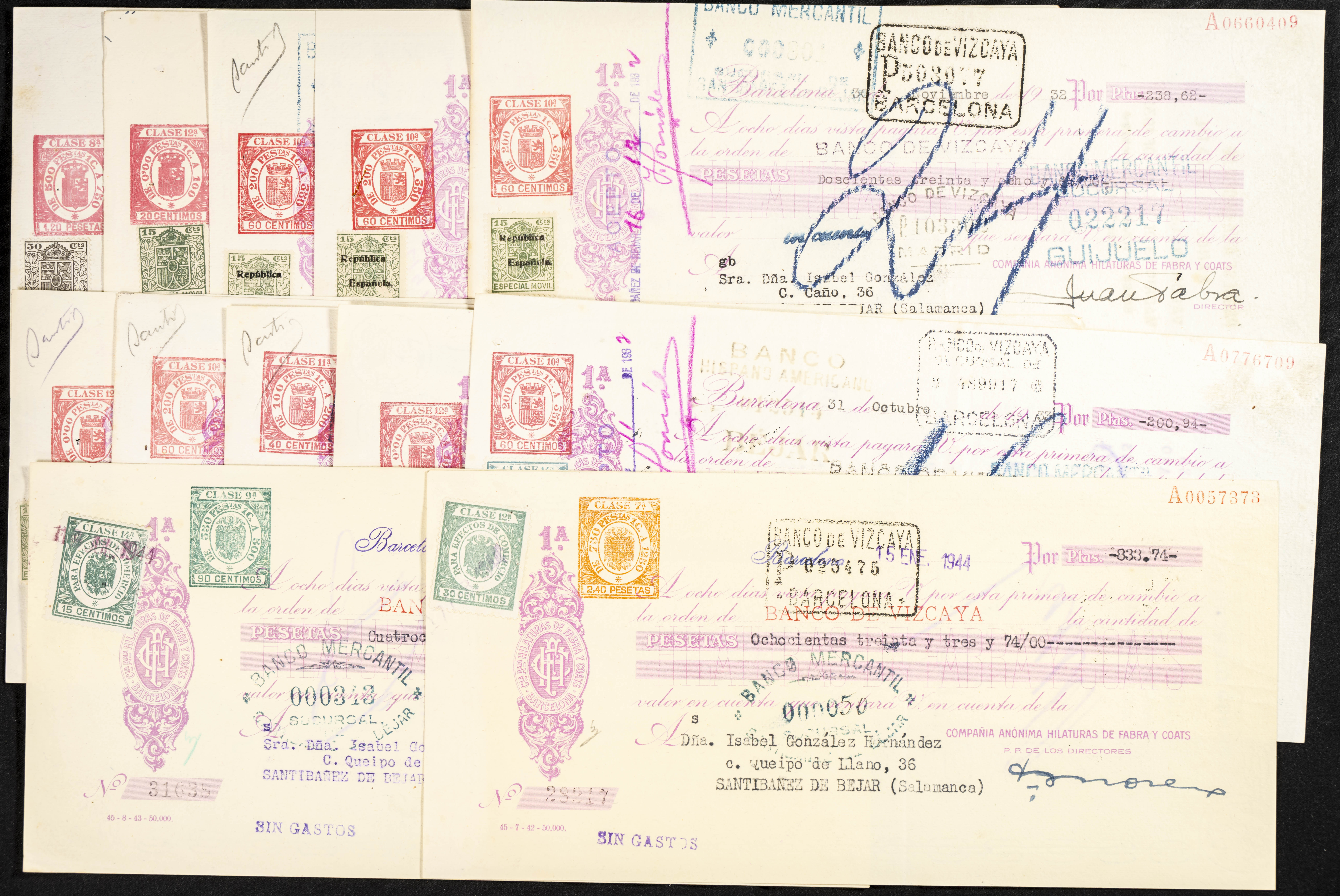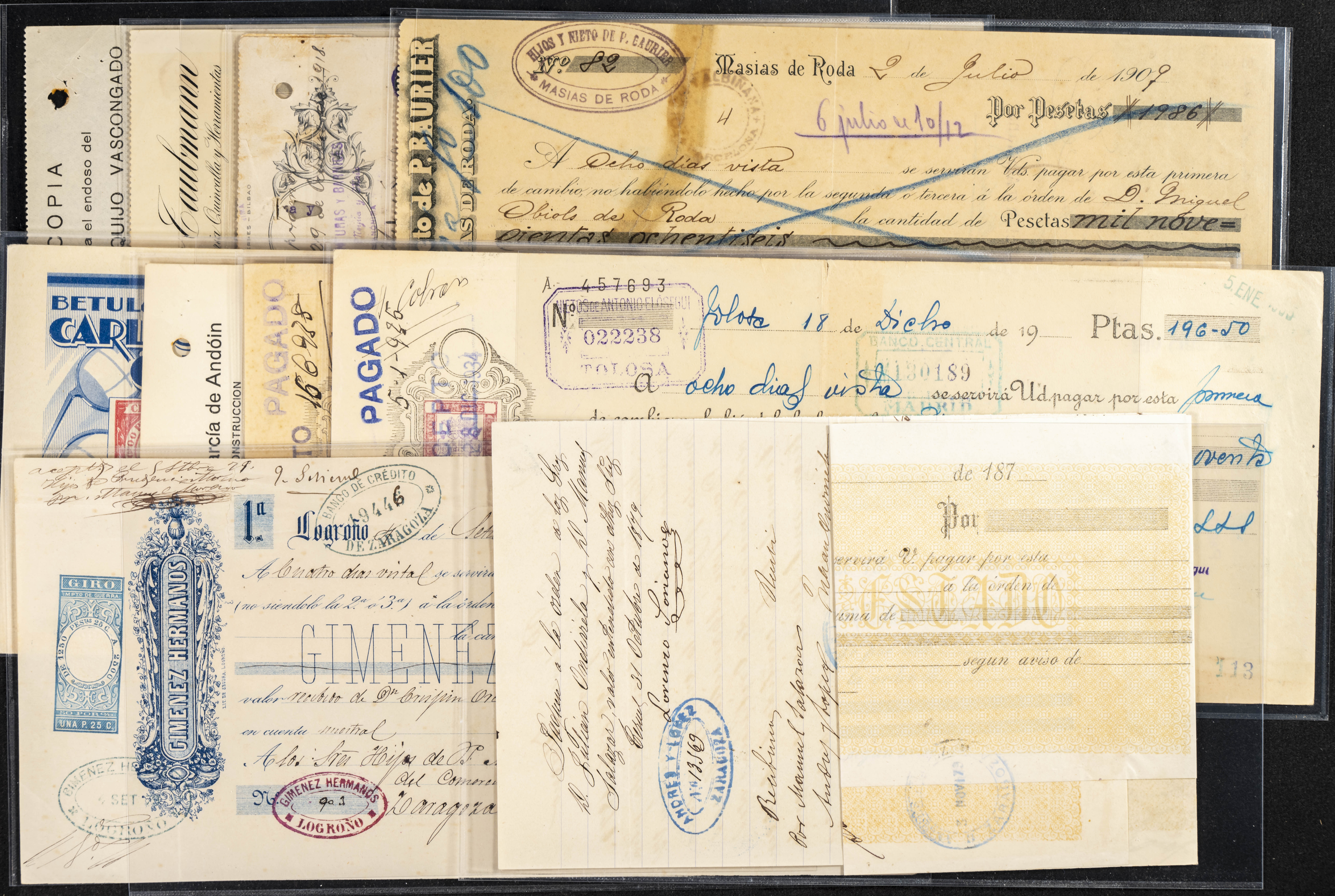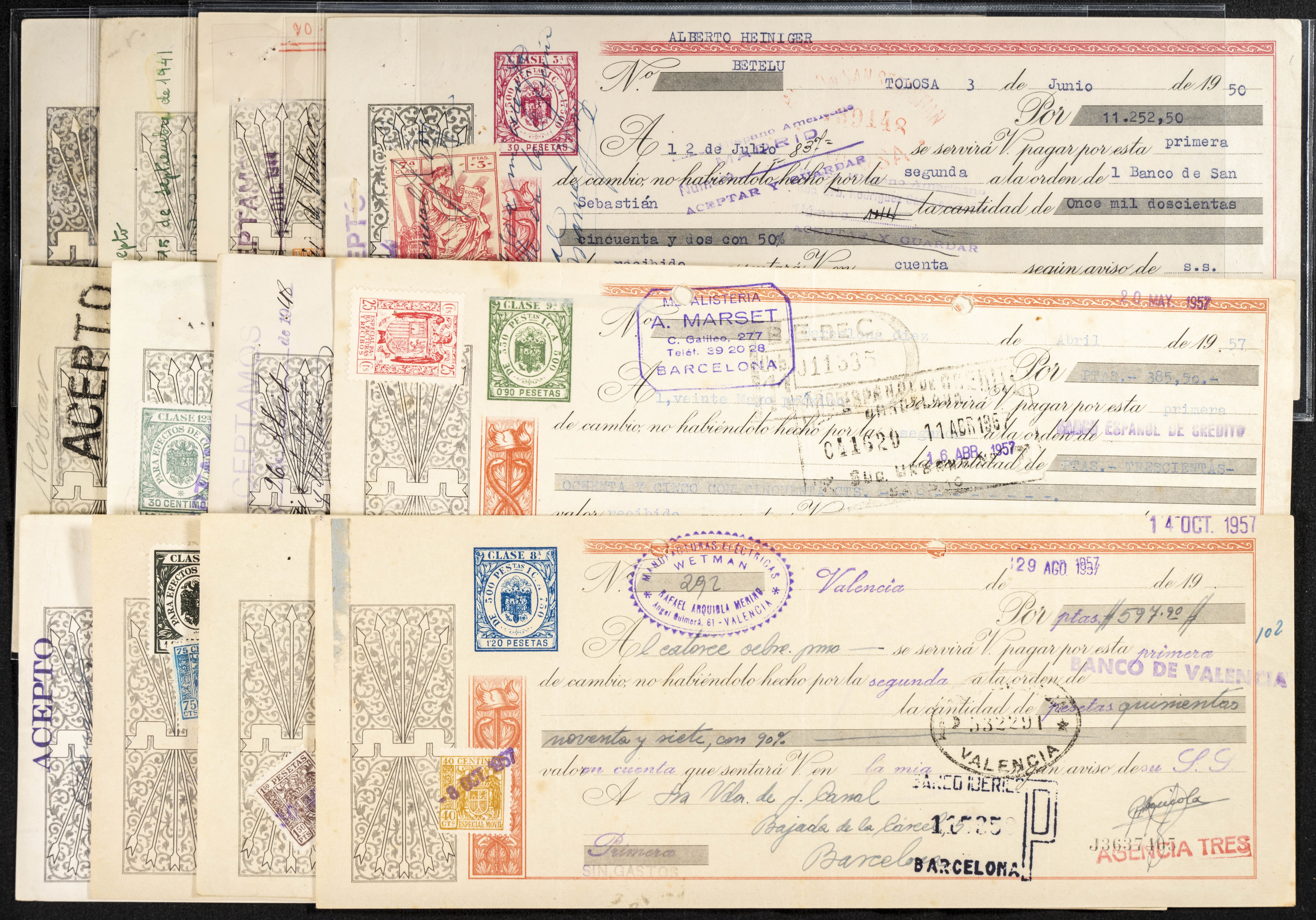 Interesante y muy amplio conjunto formado por cientos de pagarés, letras o cheques emitidos en España a lo largo de los siglos XIX y XX, su emisión corresponde, principalmente, a entidades privadas aunque encontramos también ejemplares emitidos por el Banco de España y presentando, una buena parte de ellos, sellos fiscales impresos o adheridos, diferentes estados de conservación. A EXAMINAR.