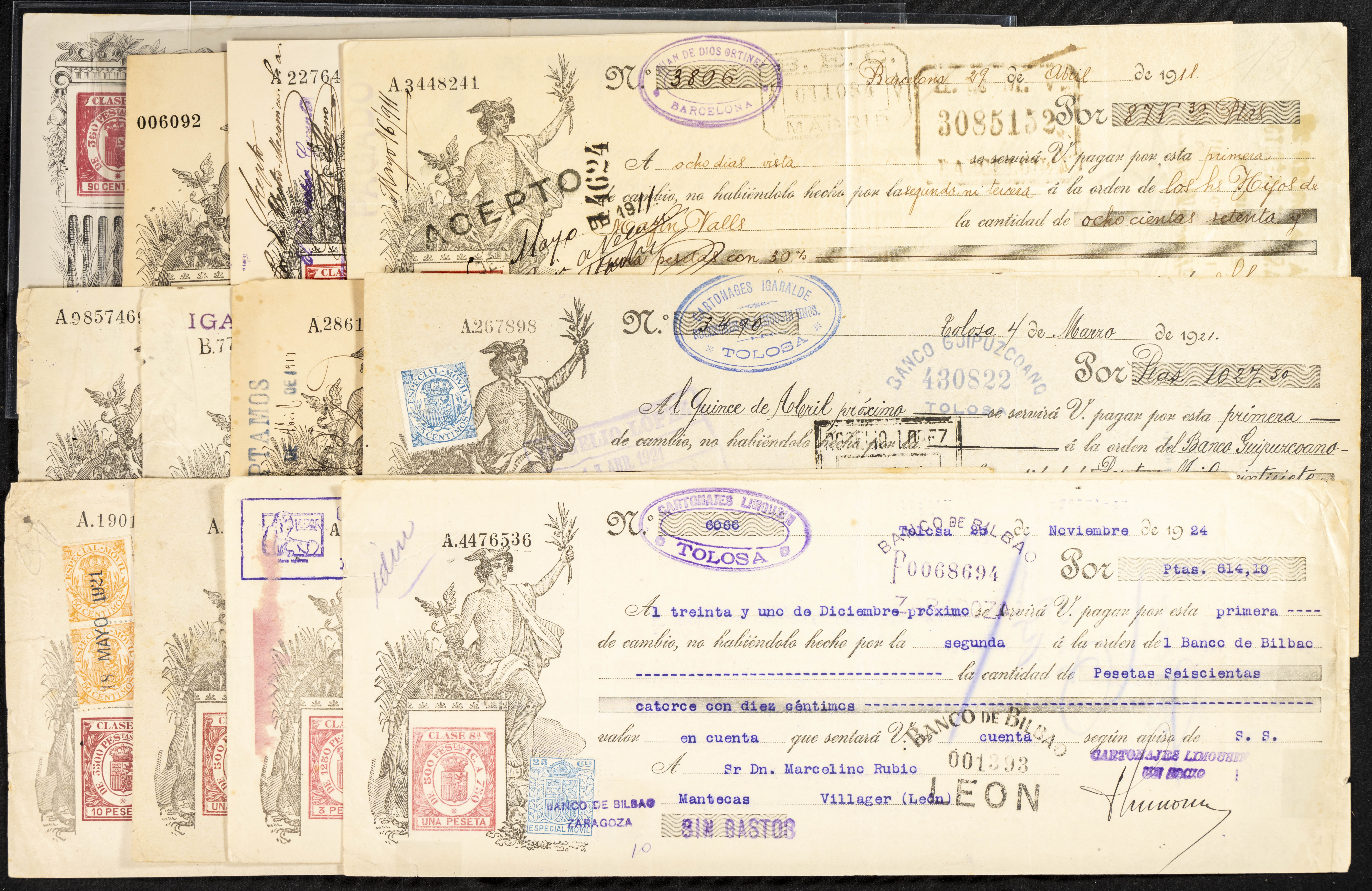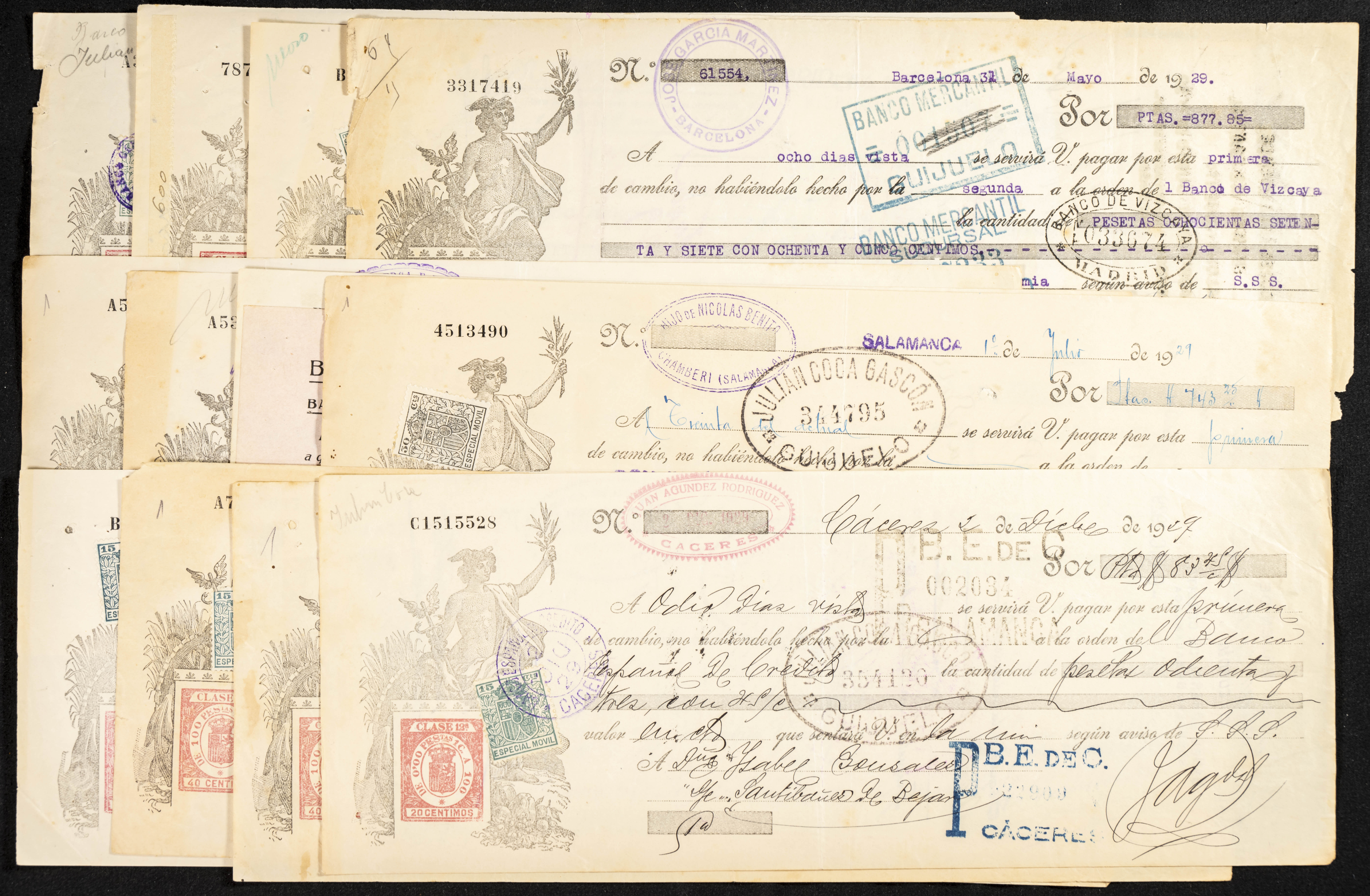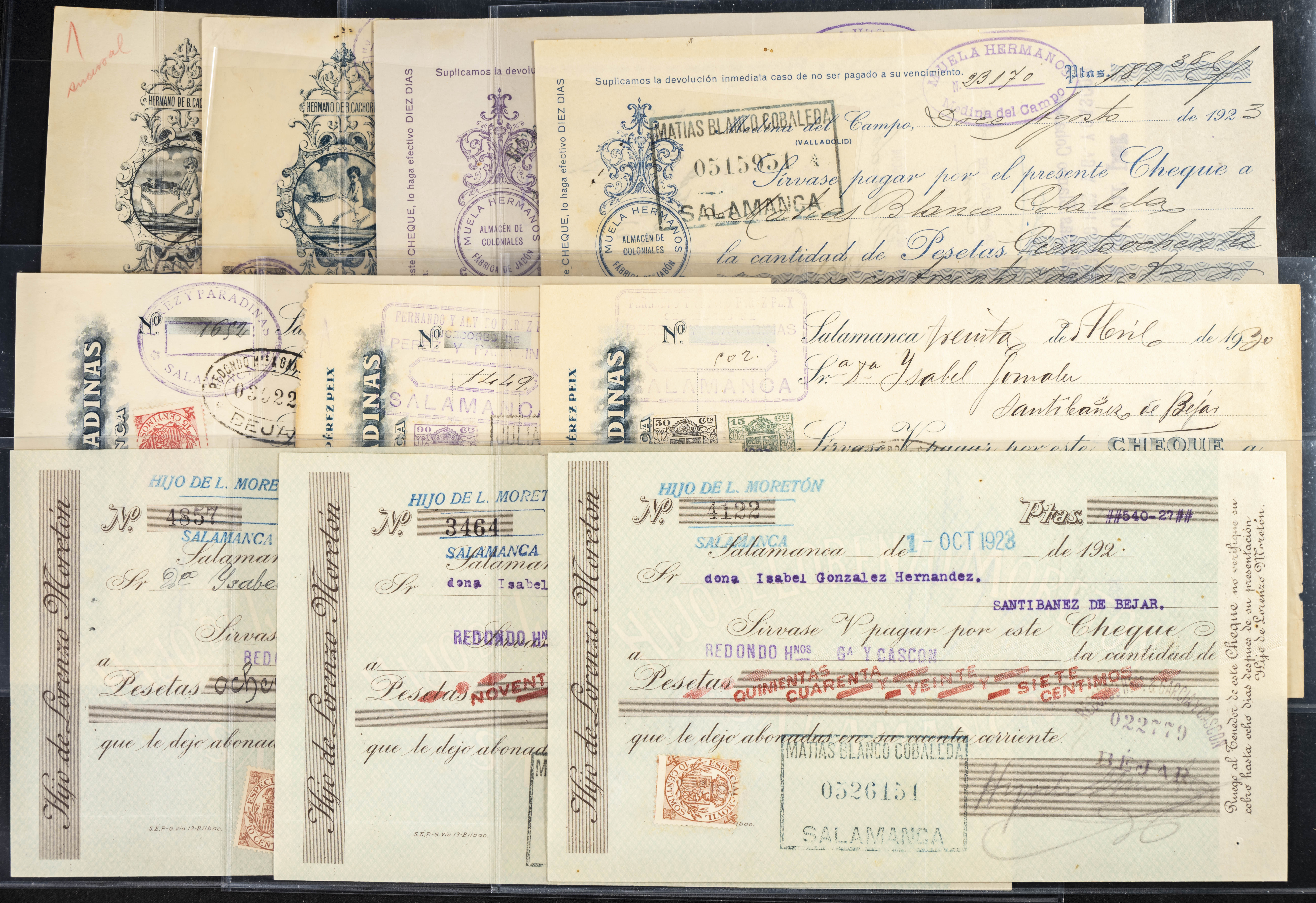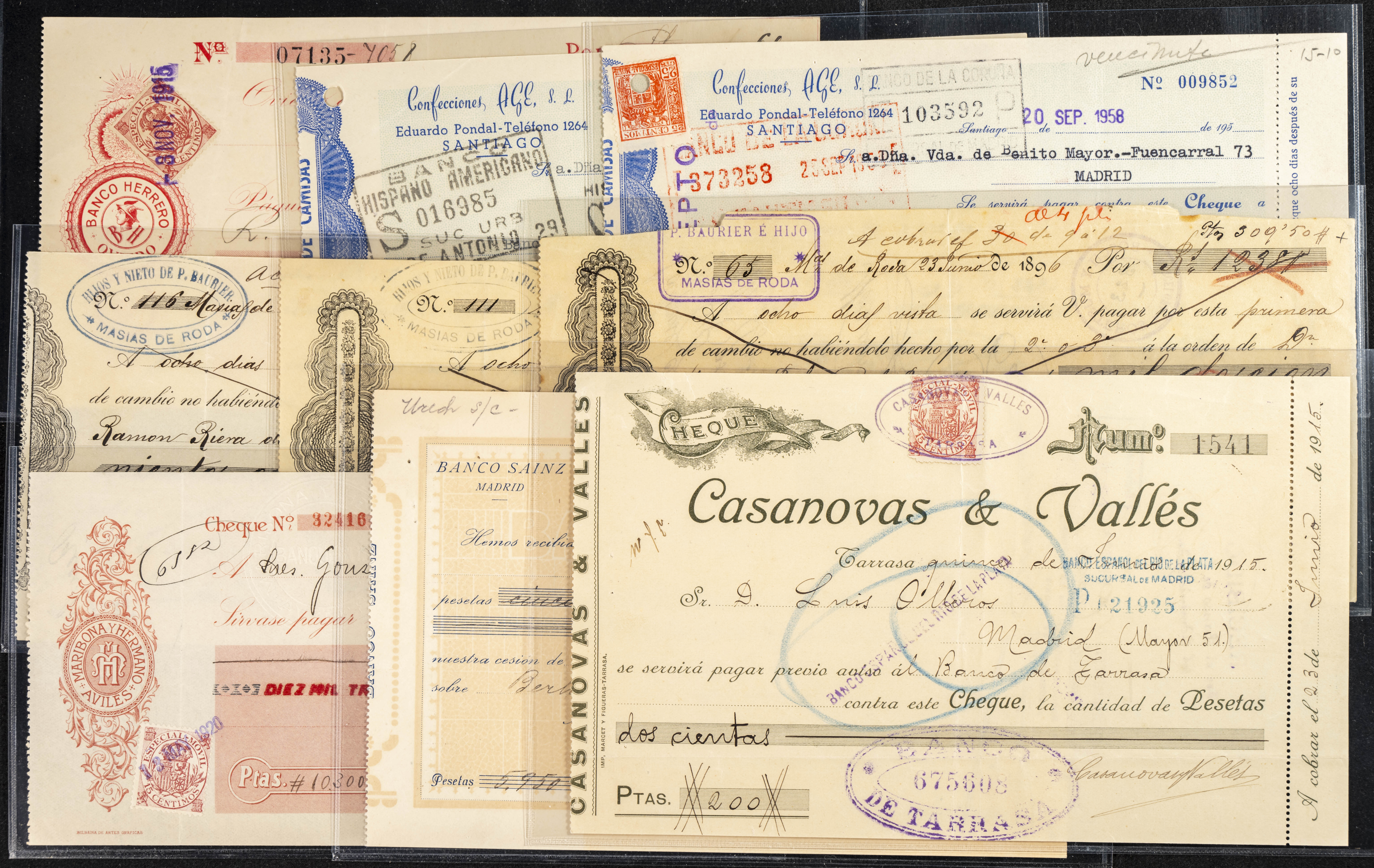 Interesante y muy amplio conjunto formado por cientos de pagarés, letras o cheques emitidos en España a lo largo de los siglos XIX y XX, su emisión corresponde, principalmente, a entidades privadas aunque encontramos también ejemplares emitidos por el Banco de España y presentando, una buena parte de ellos, sellos fiscales impresos o adheridos, diferentes estados de conservación. A EXAMINAR.