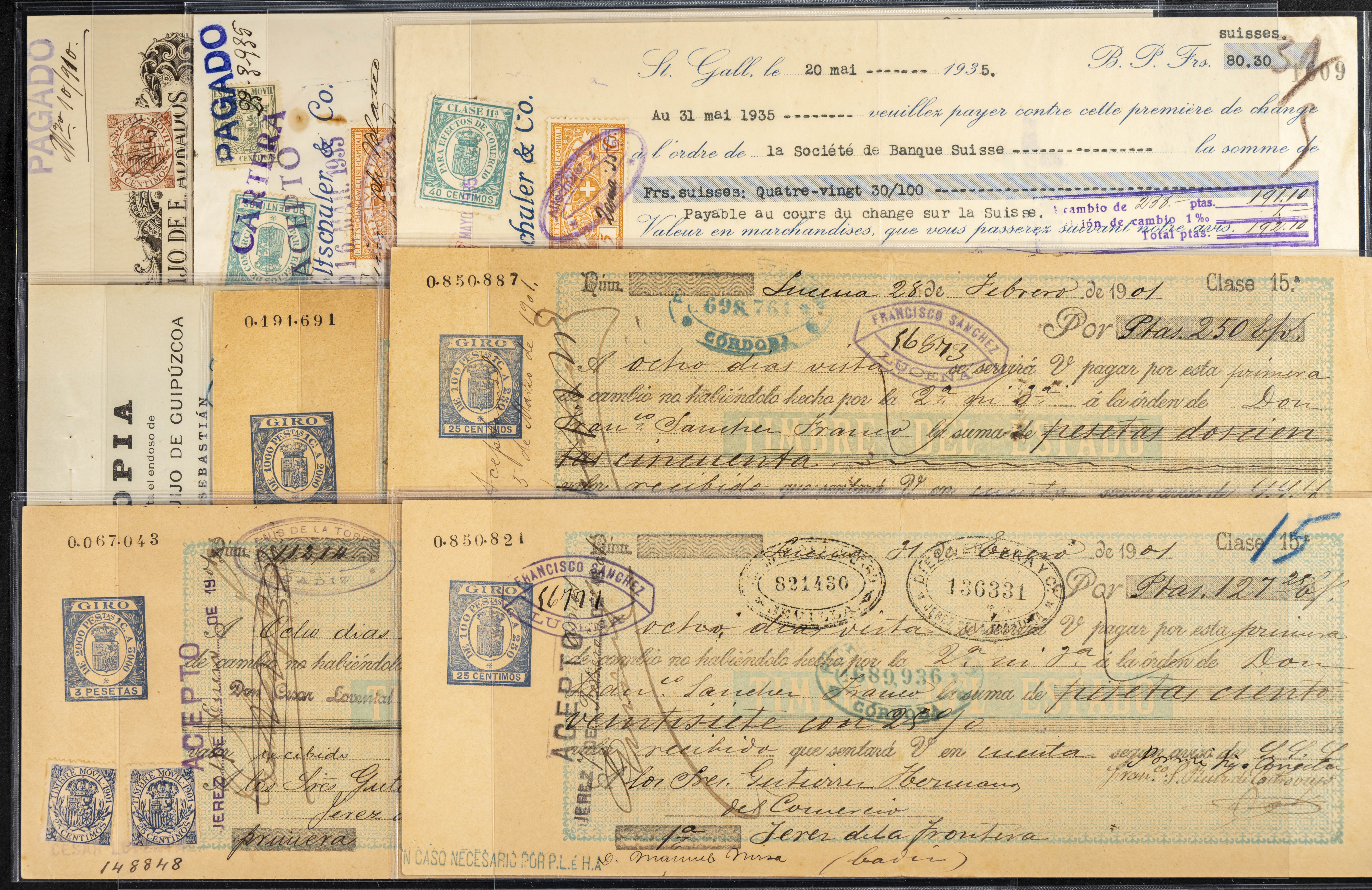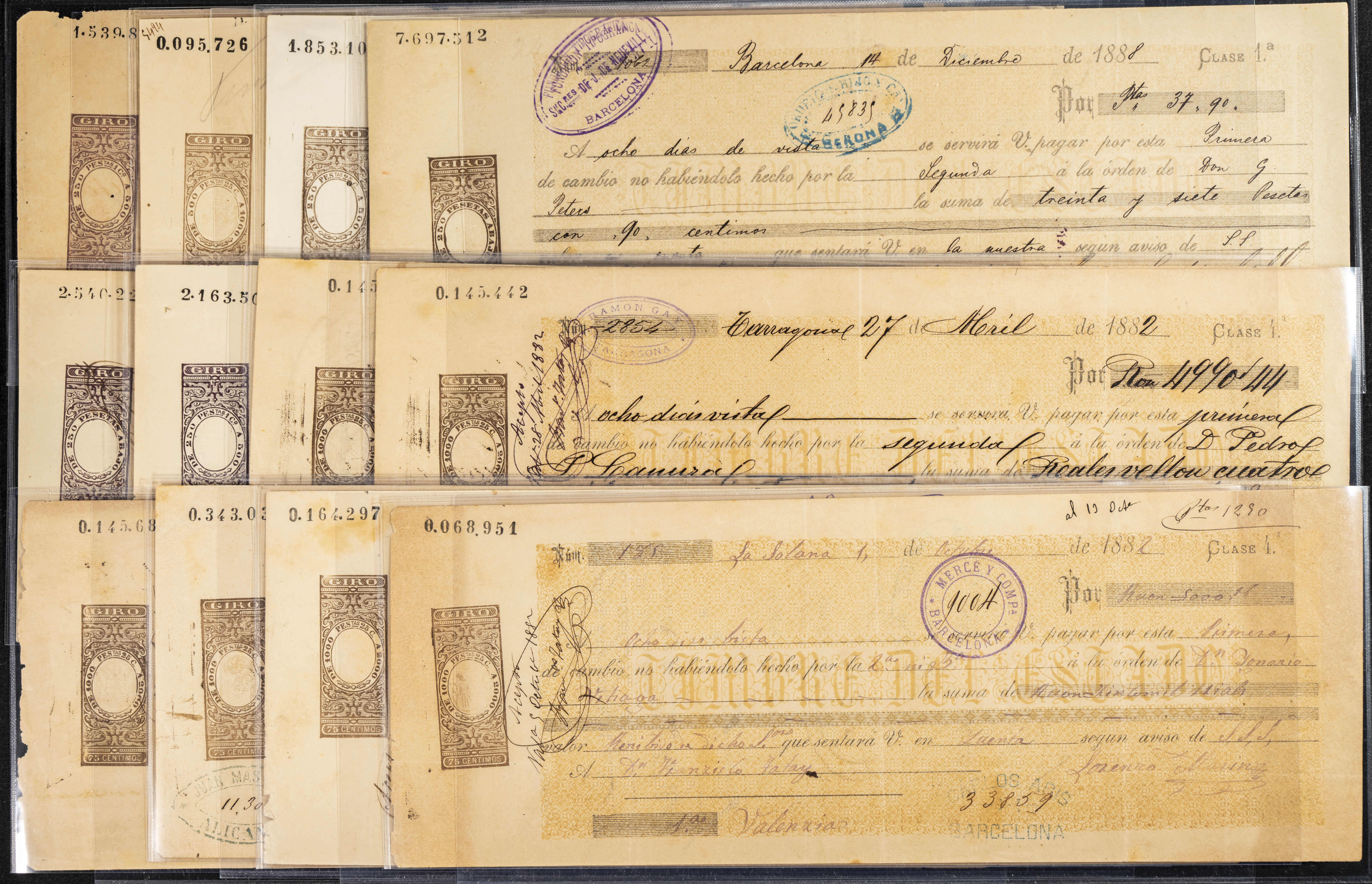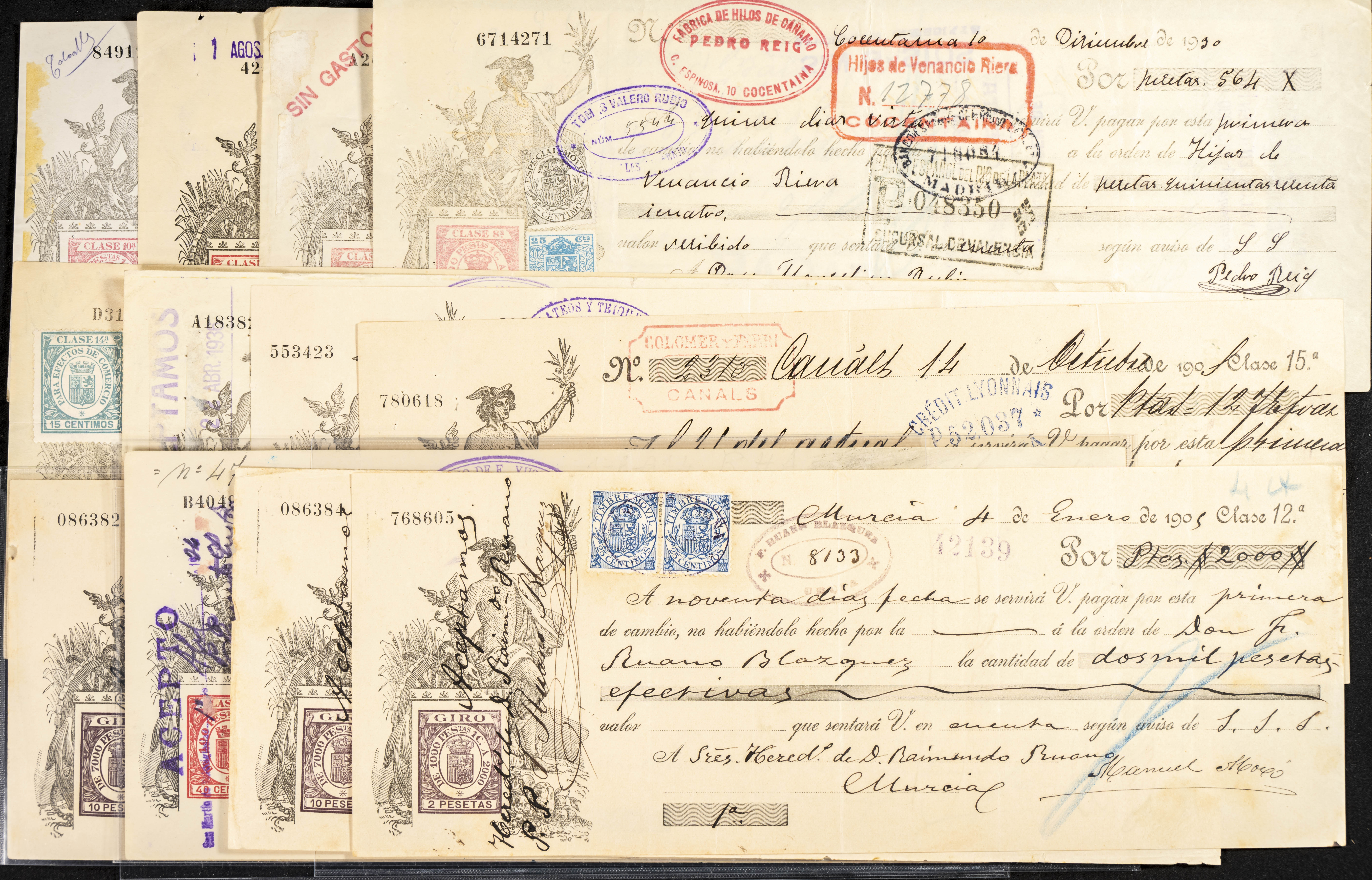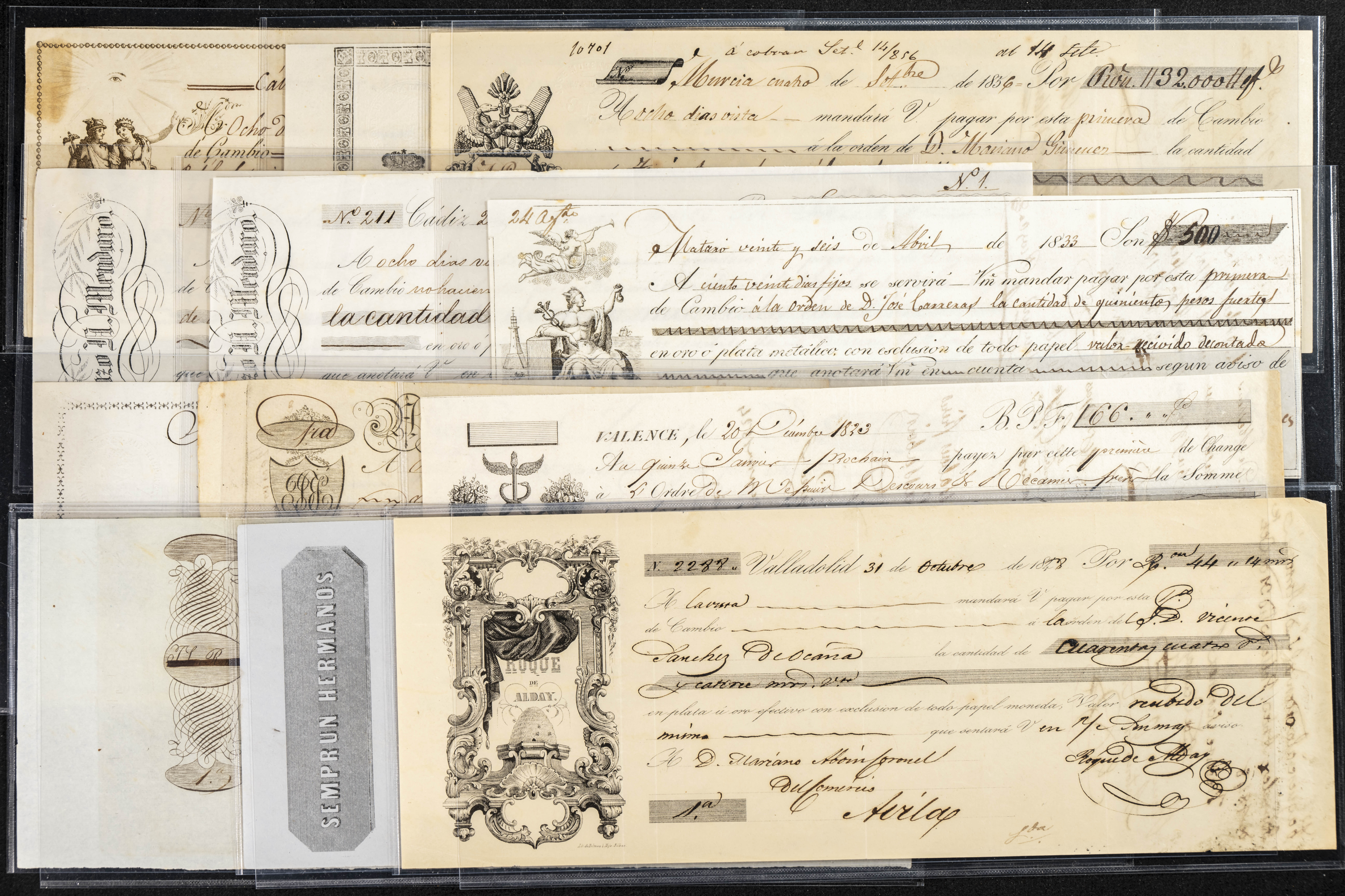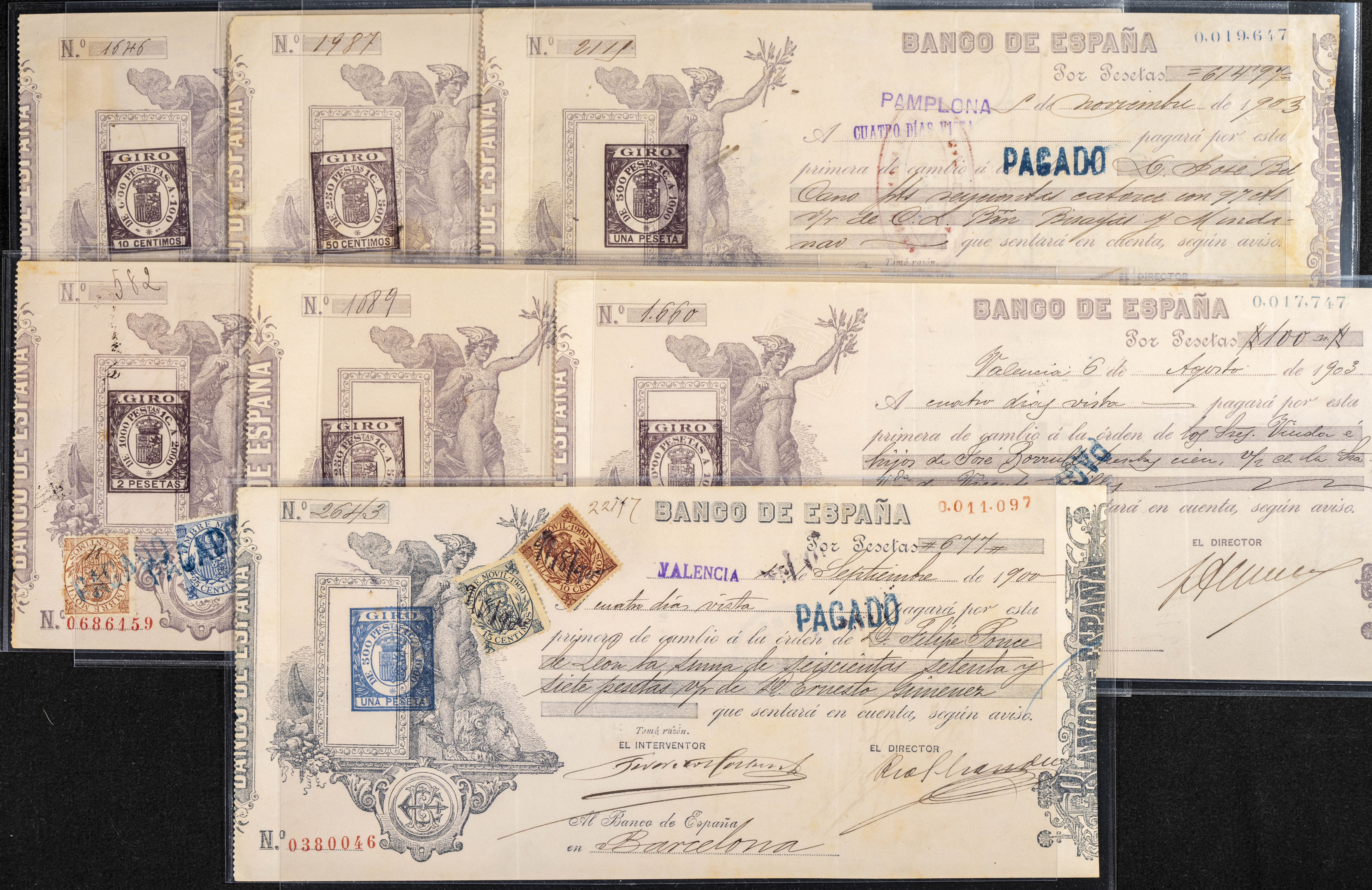 Interesante y muy amplio conjunto formado por cientos de pagarés, letras o cheques emitidos en España a lo largo de los siglos XIX y XX, su emisión corresponde, principalmente, a entidades privadas aunque encontramos también ejemplares emitidos por el Banco de España y presentando, una buena parte de ellos, sellos fiscales impresos o adheridos, diferentes estados de conservación. A EXAMINAR.