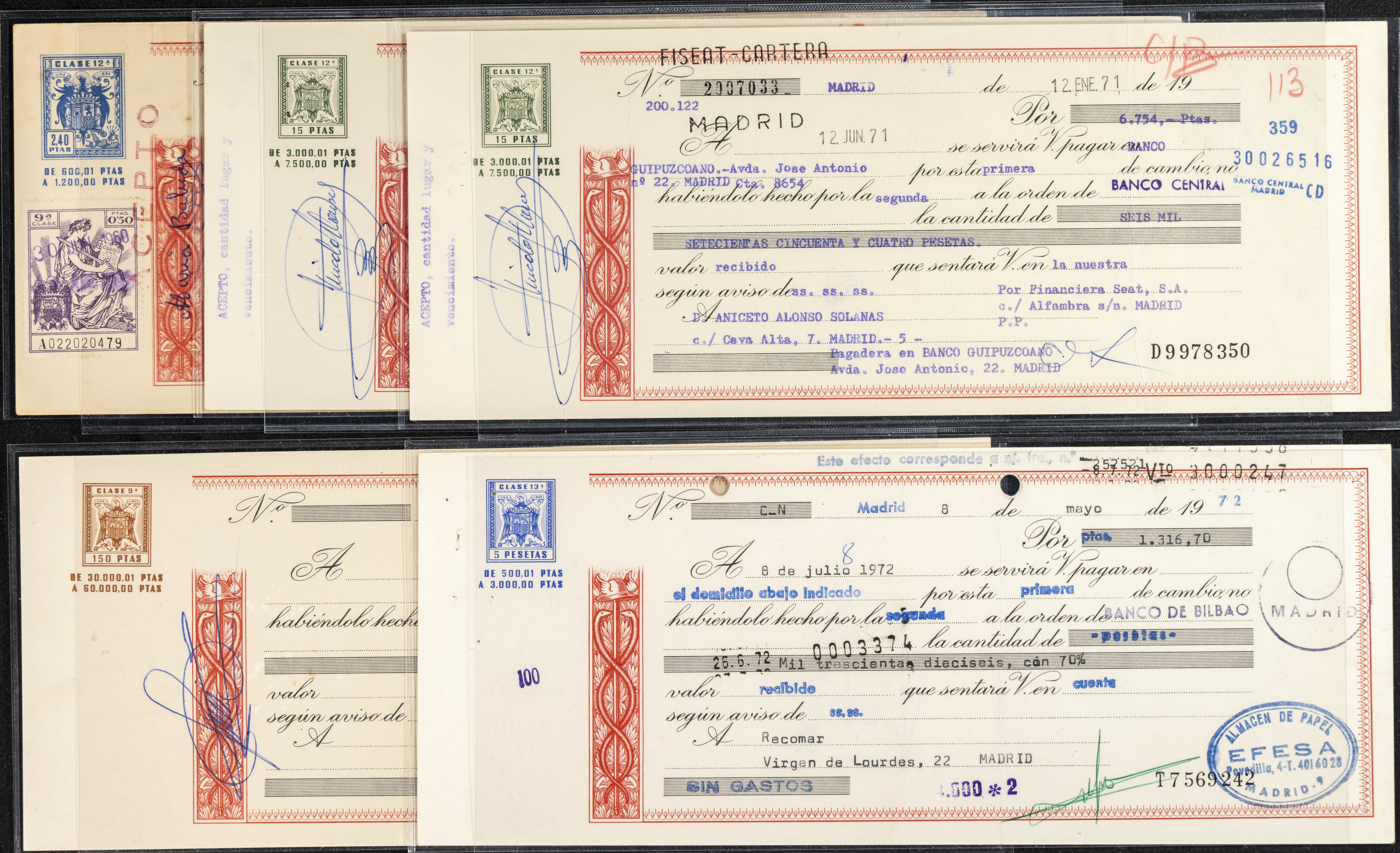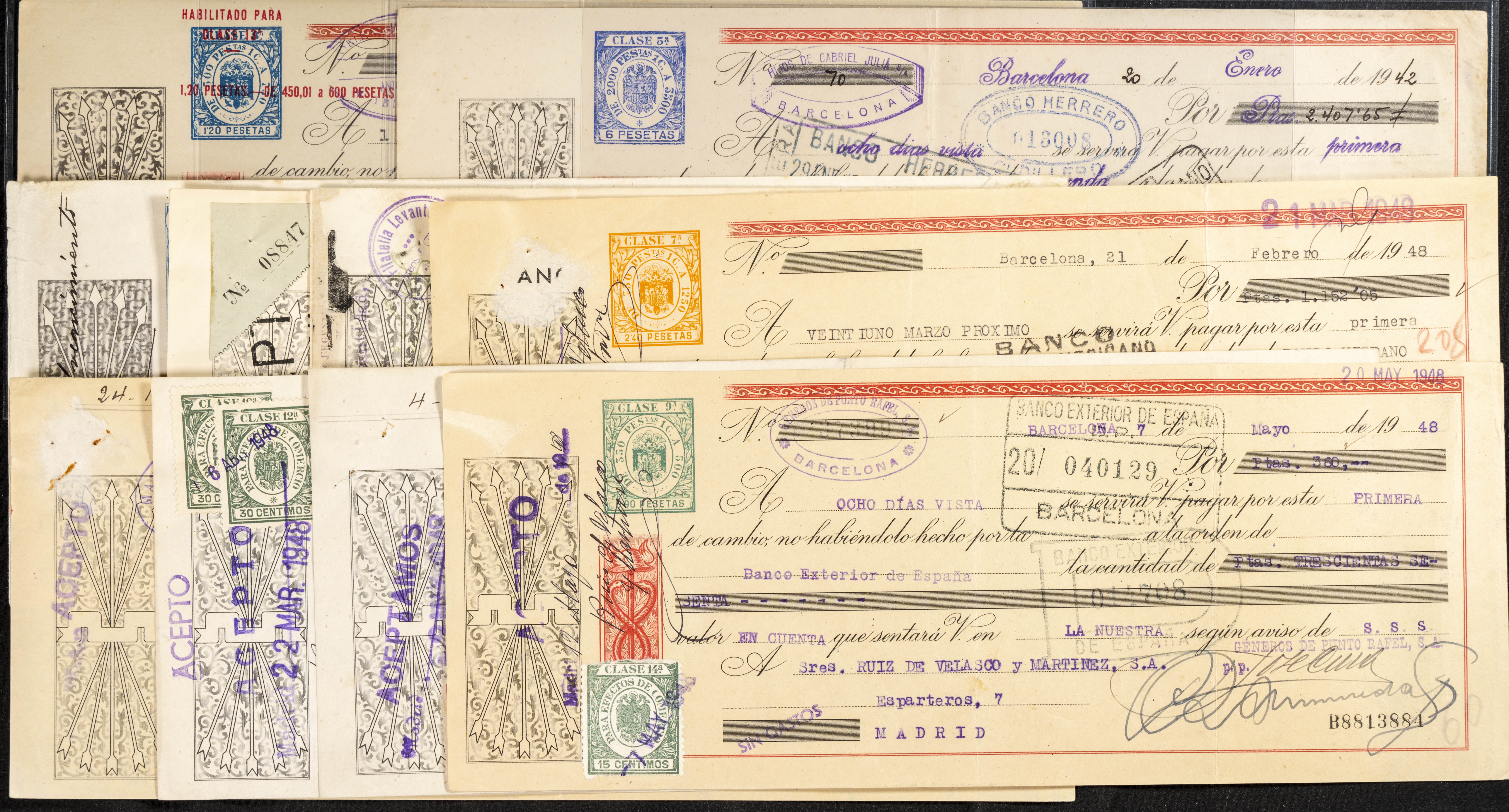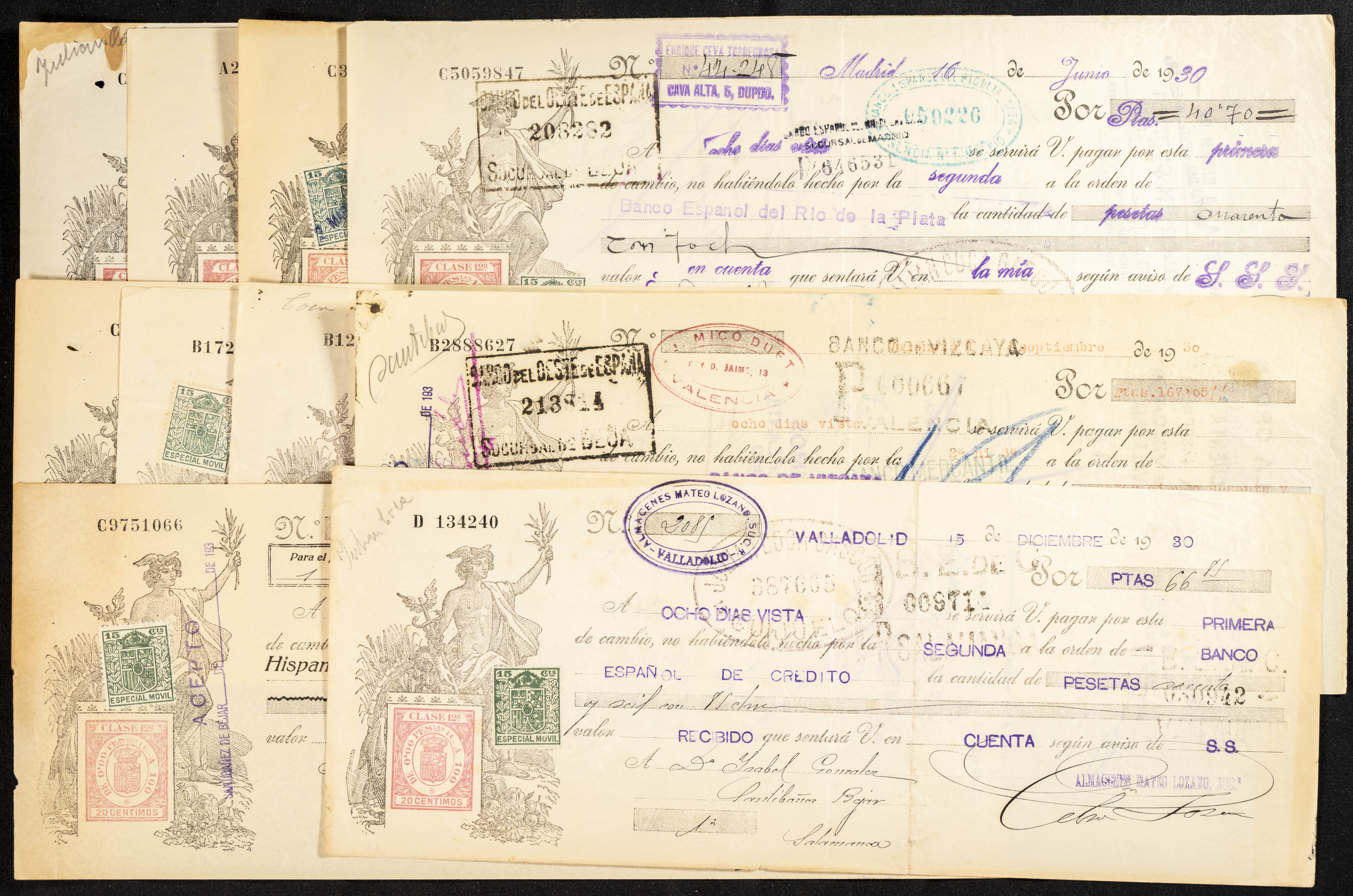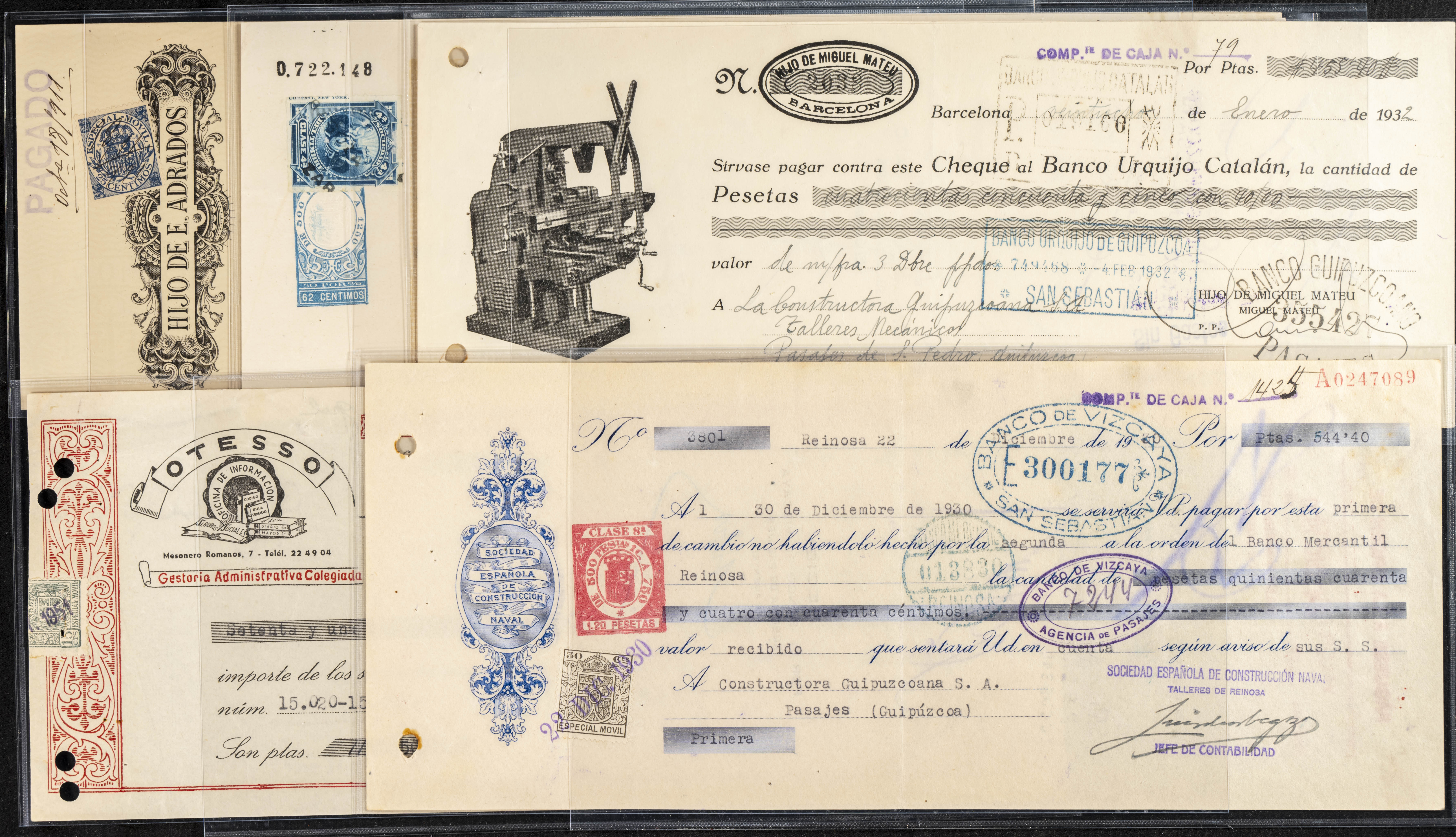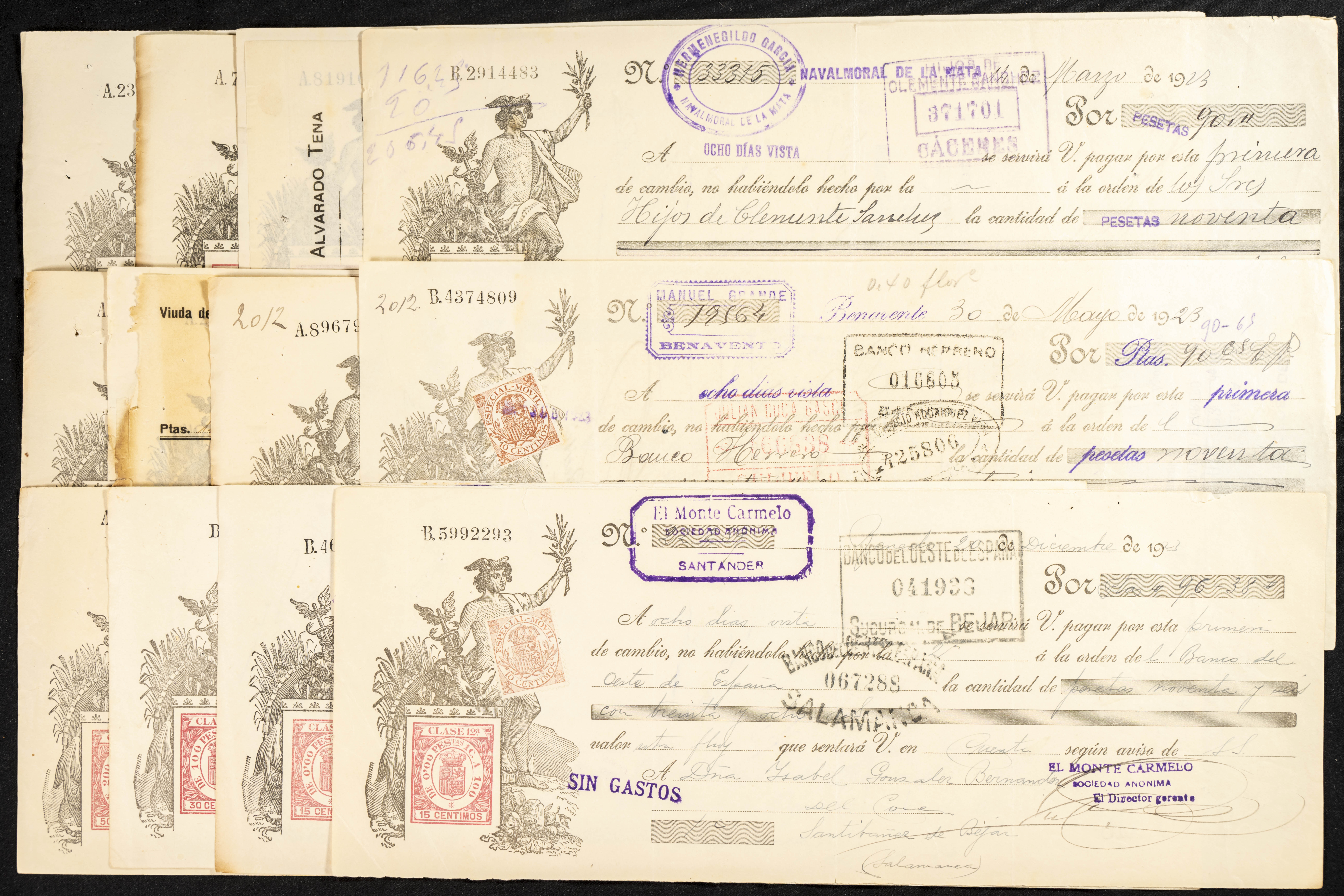 Interesante y muy amplio conjunto formado por cientos de pagarés, letras o cheques emitidos en España a lo largo de los siglos XIX y XX, su emisión corresponde, principalmente, a entidades privadas aunque encontramos también ejemplares emitidos por el Banco de España y presentando, una buena parte de ellos, sellos fiscales impresos o adheridos, diferentes estados de conservación. A EXAMINAR.