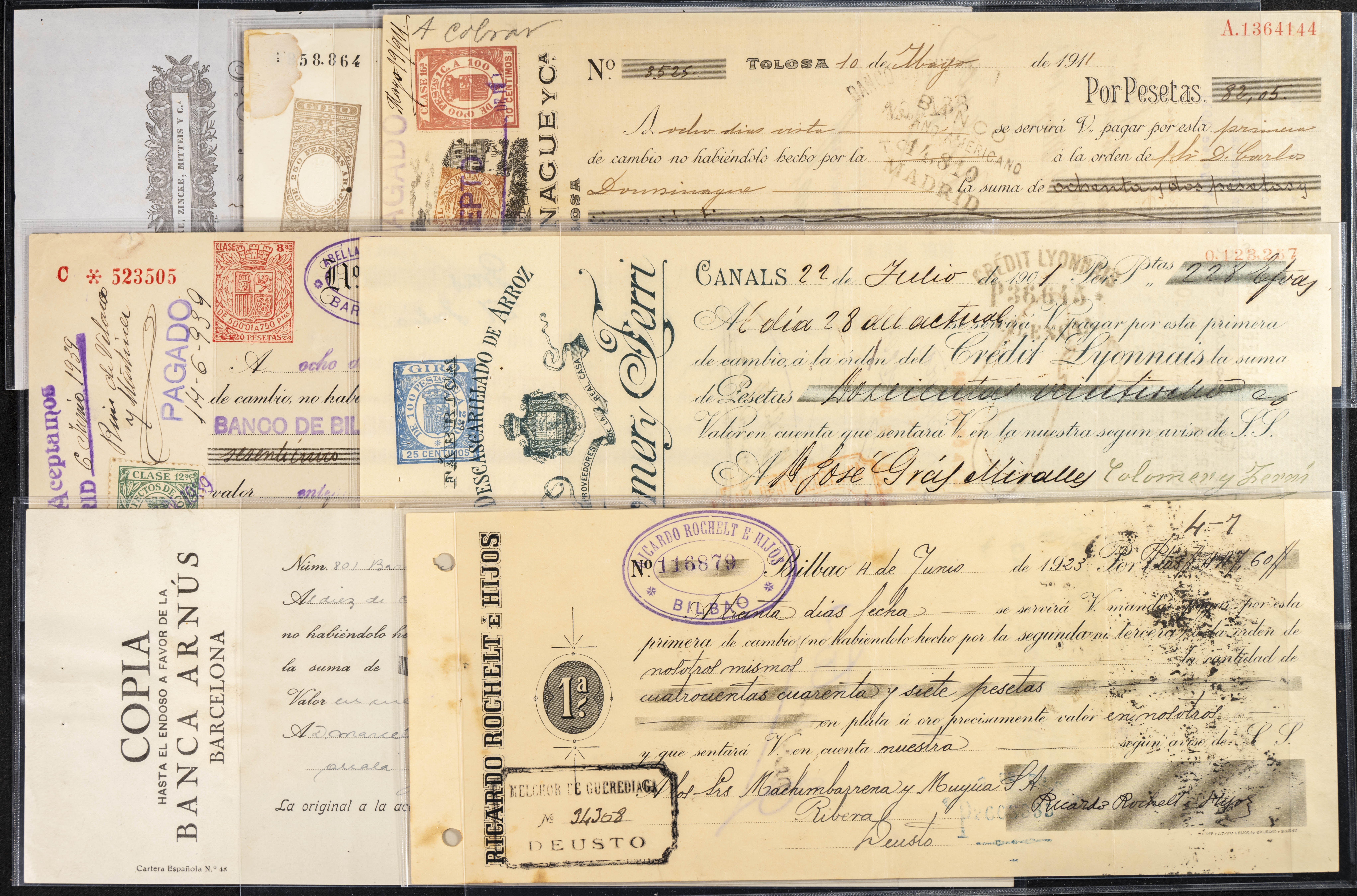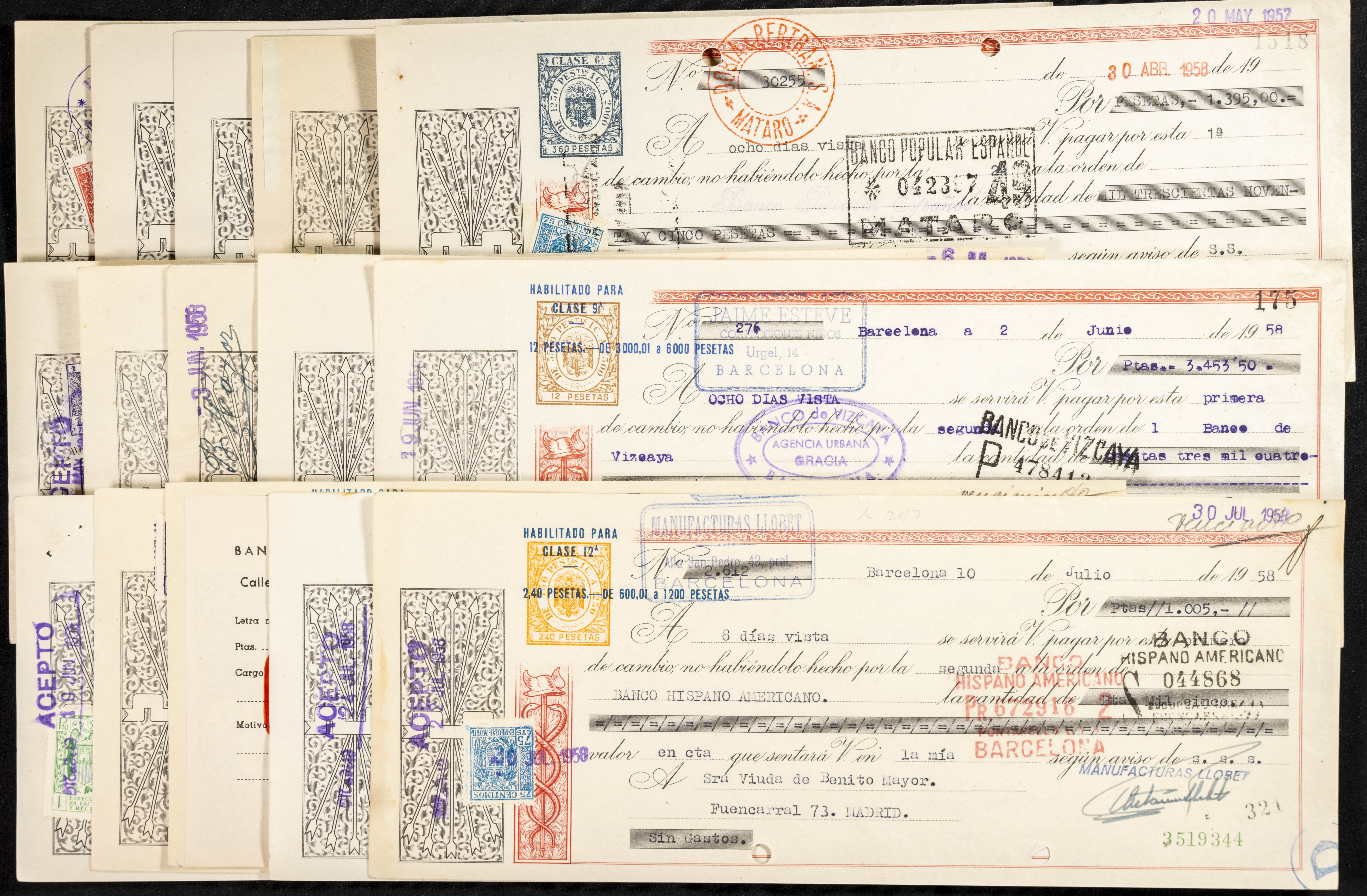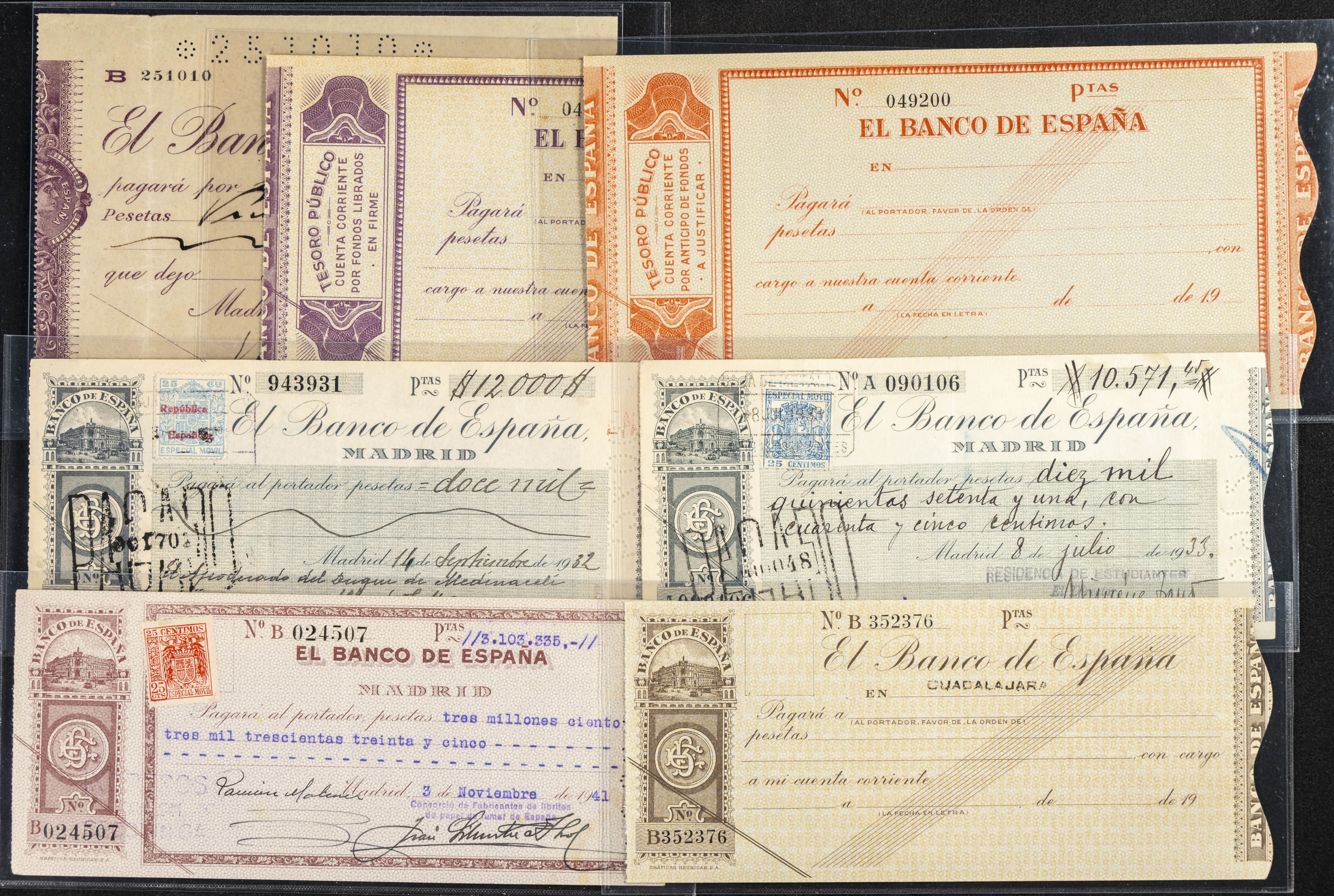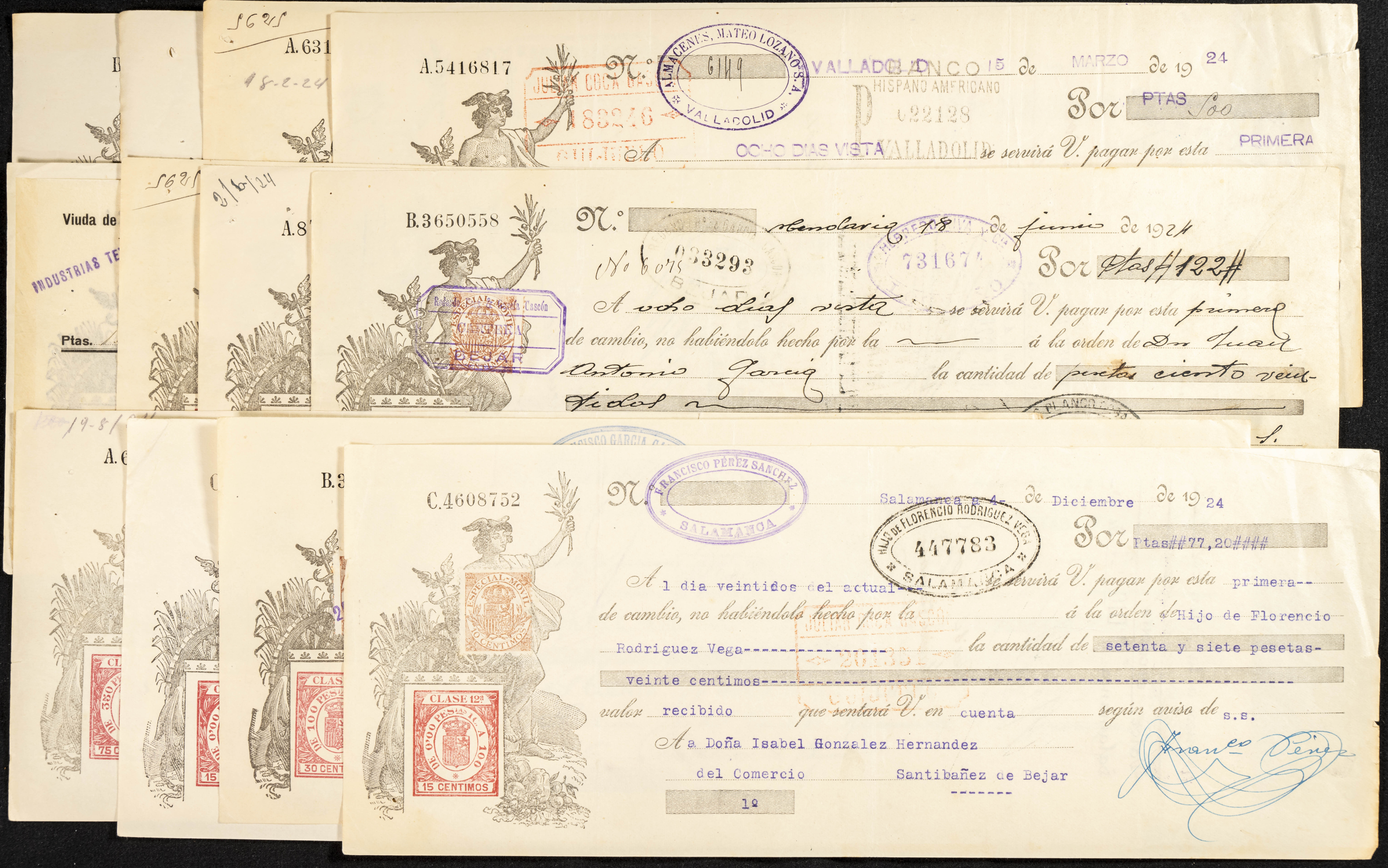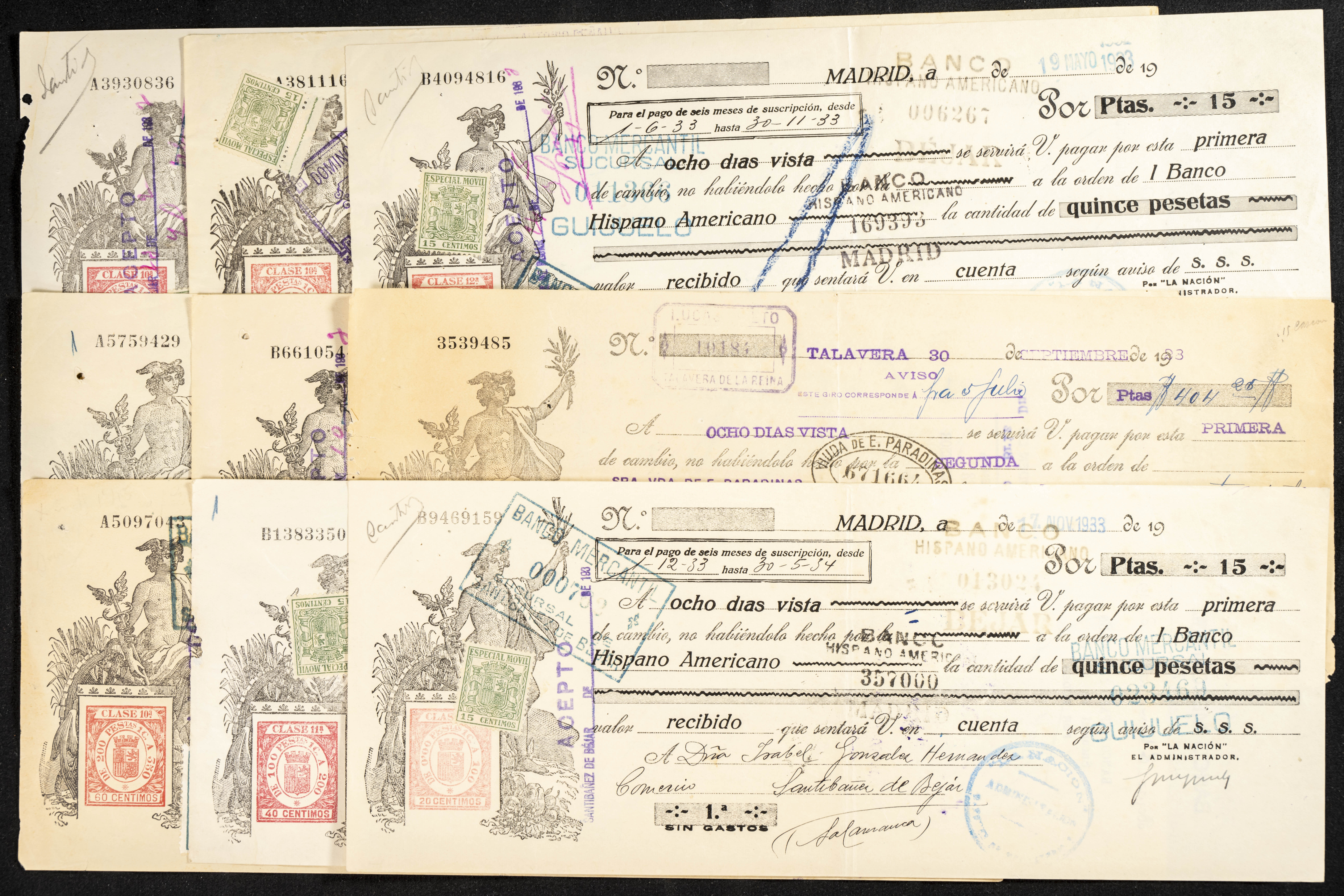 Interesante y muy amplio conjunto formado por cientos de pagarés, letras o cheques emitidos en España a lo largo de los siglos XIX y XX, su emisión corresponde, principalmente, a entidades privadas aunque encontramos también ejemplares emitidos por el Banco de España y presentando, una buena parte de ellos, sellos fiscales impresos o adheridos, diferentes estados de conservación. A EXAMINAR.