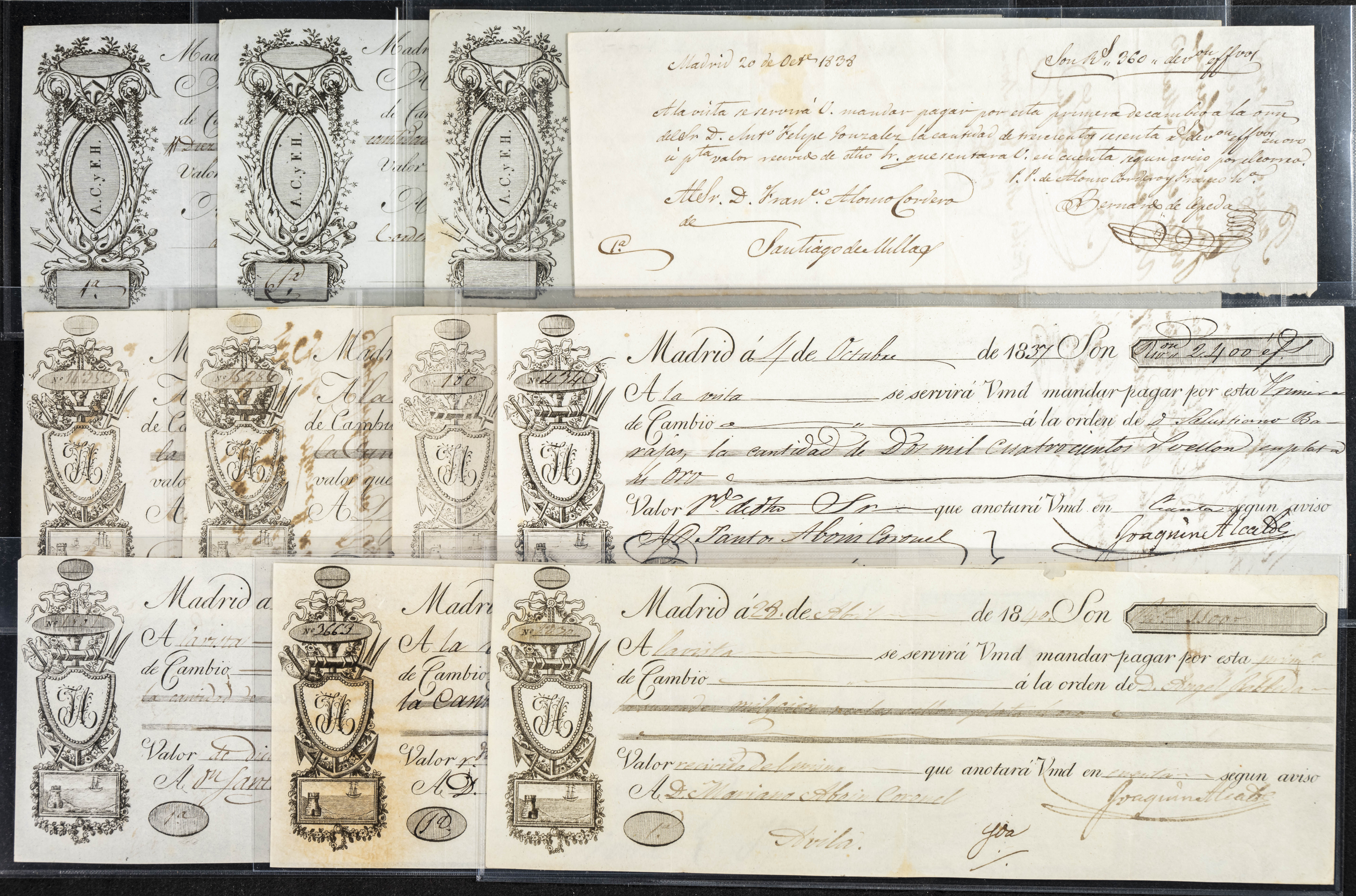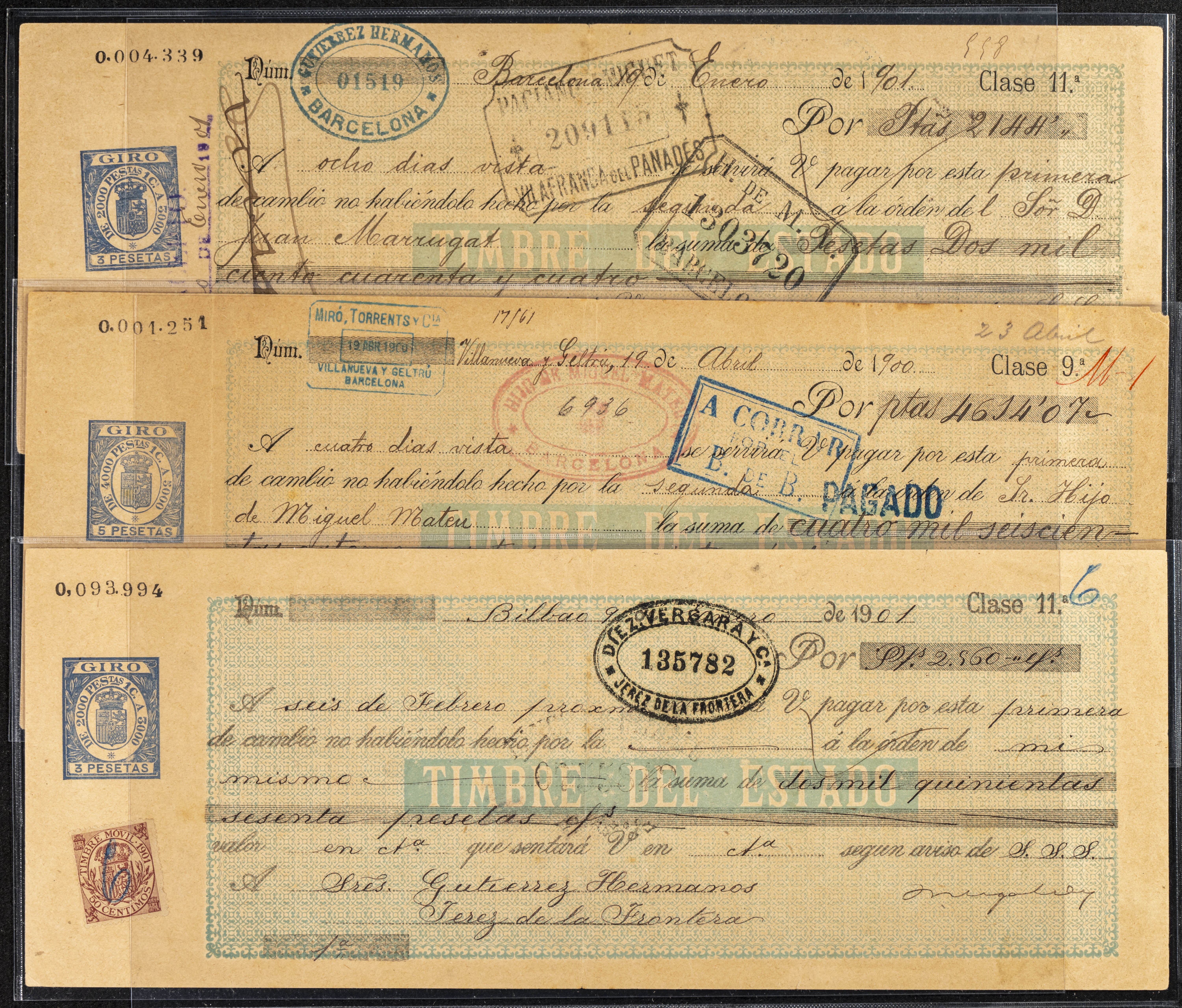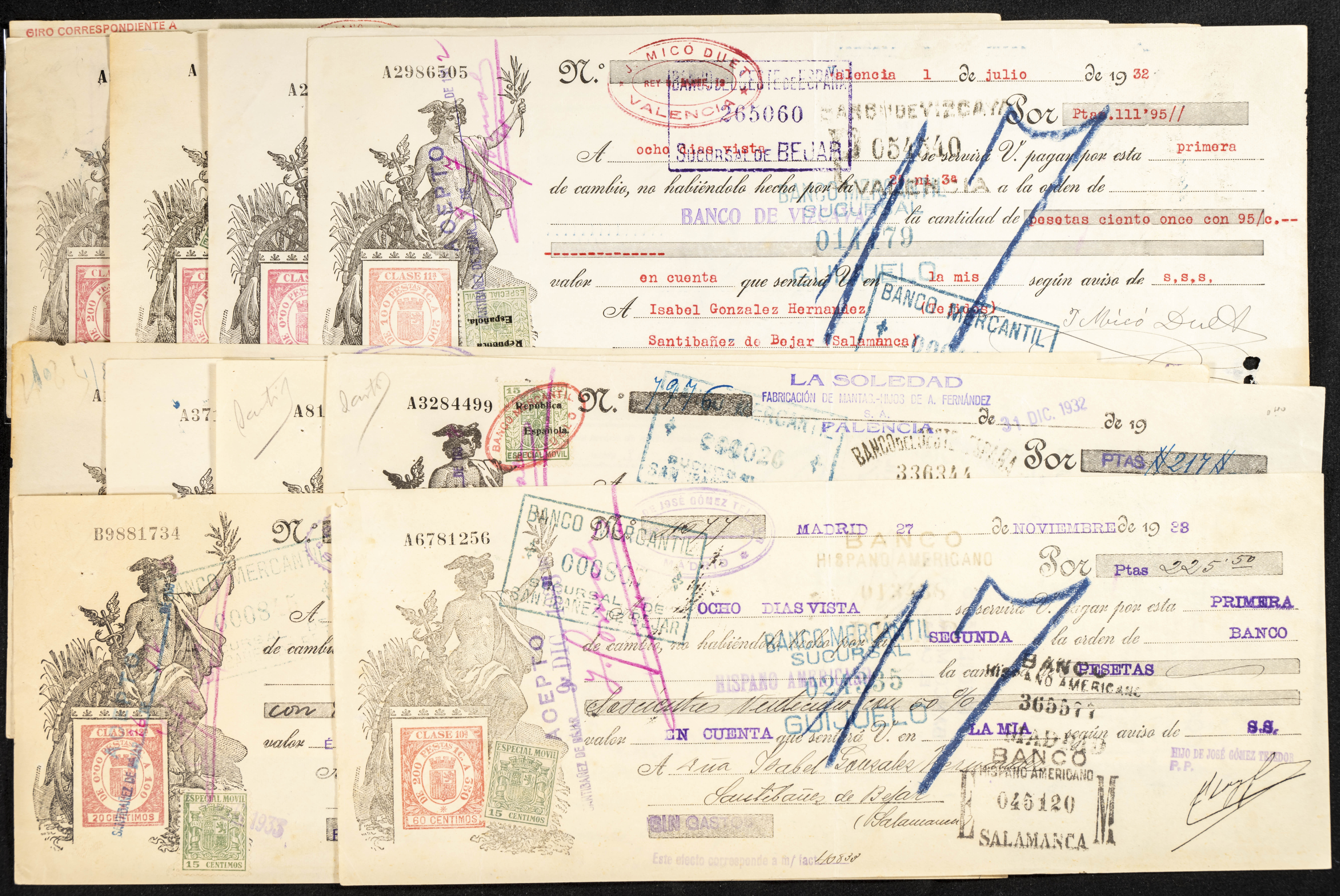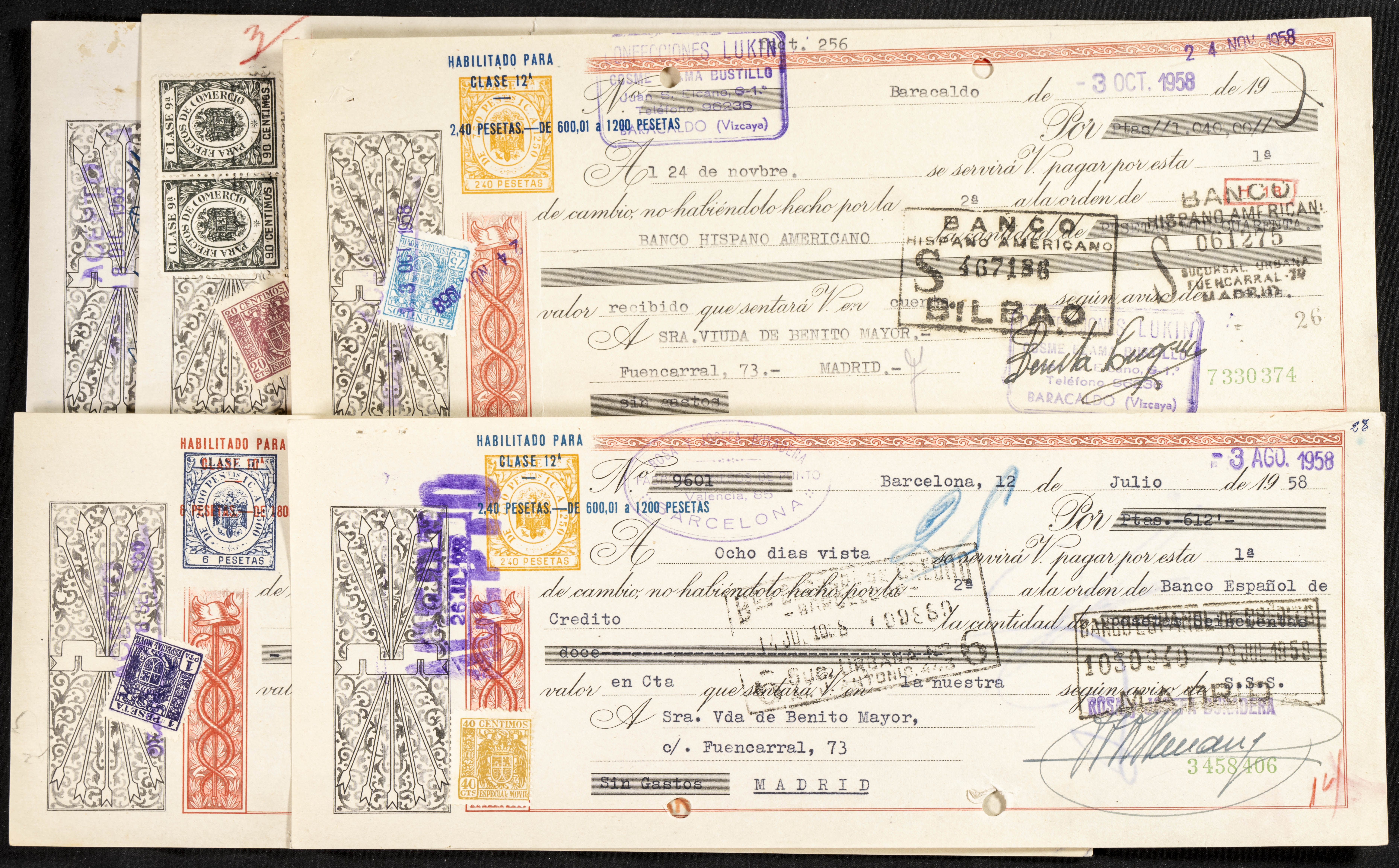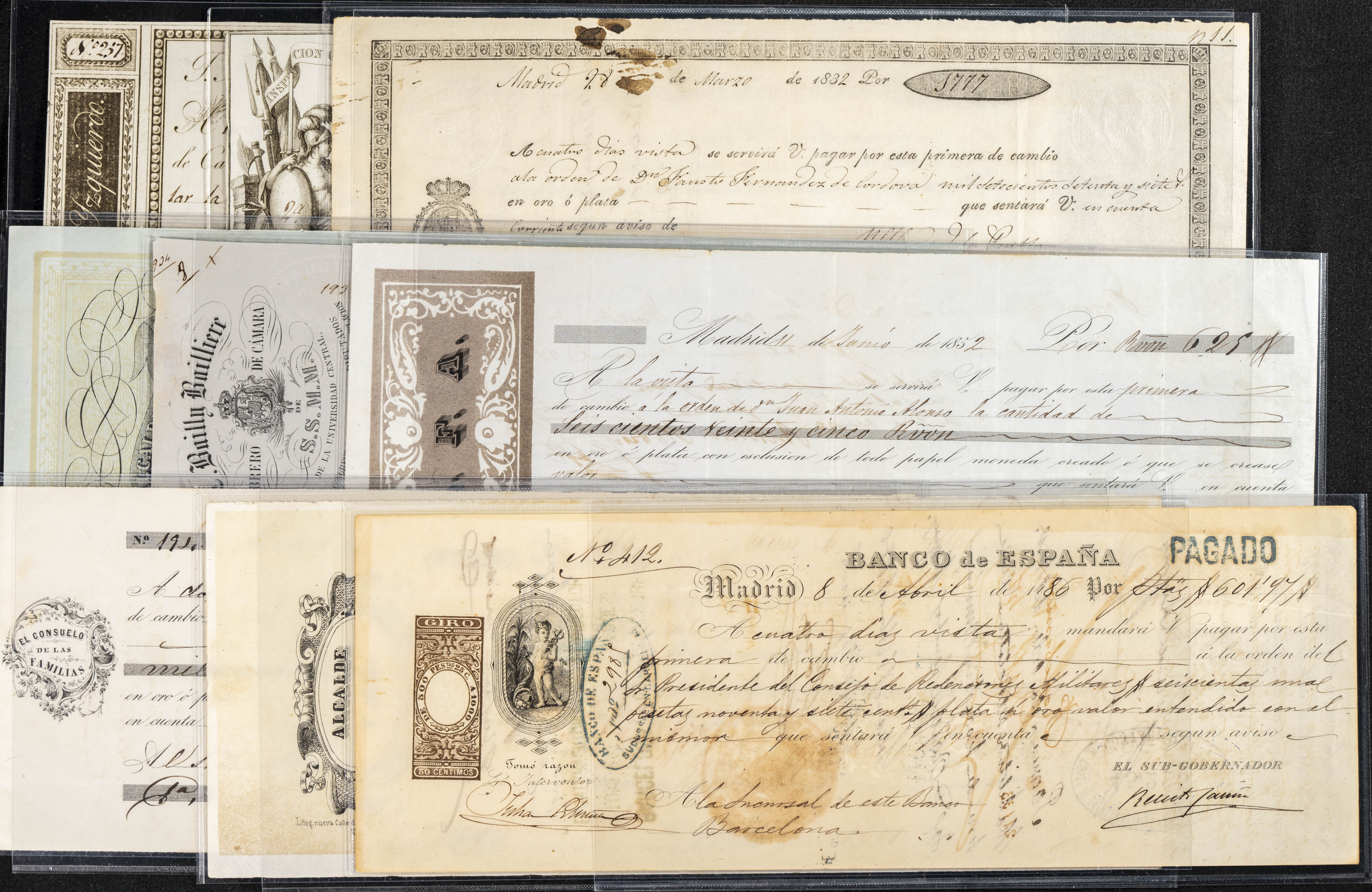 Interesante y muy amplio conjunto formado por cientos de pagarés, letras o cheques emitidos en España a lo largo de los siglos XIX y XX, su emisión corresponde, principalmente, a entidades privadas aunque encontramos también ejemplares emitidos por el Banco de España y presentando, una buena parte de ellos, sellos fiscales impresos o adheridos, diferentes estados de conservación. A EXAMINAR.