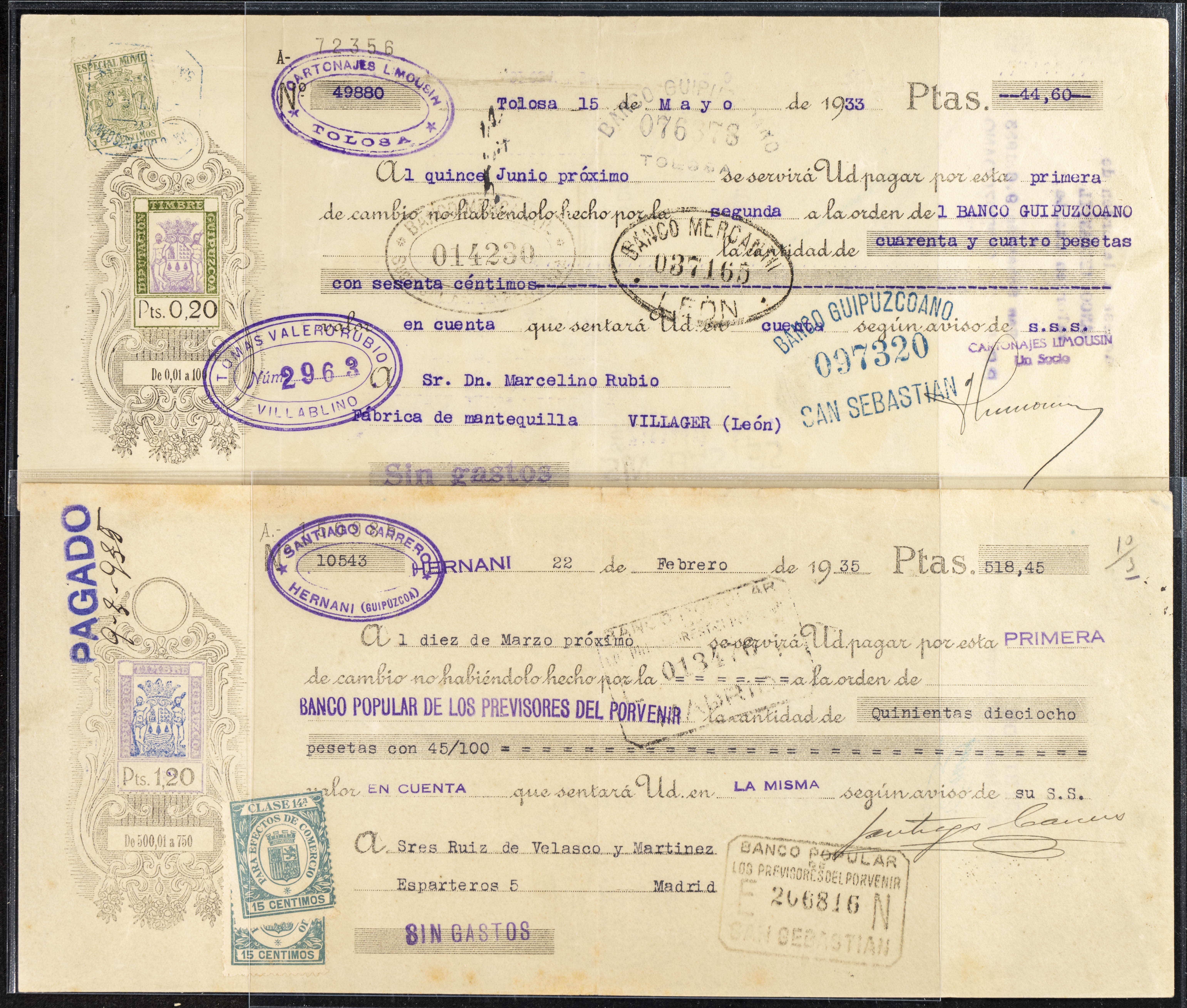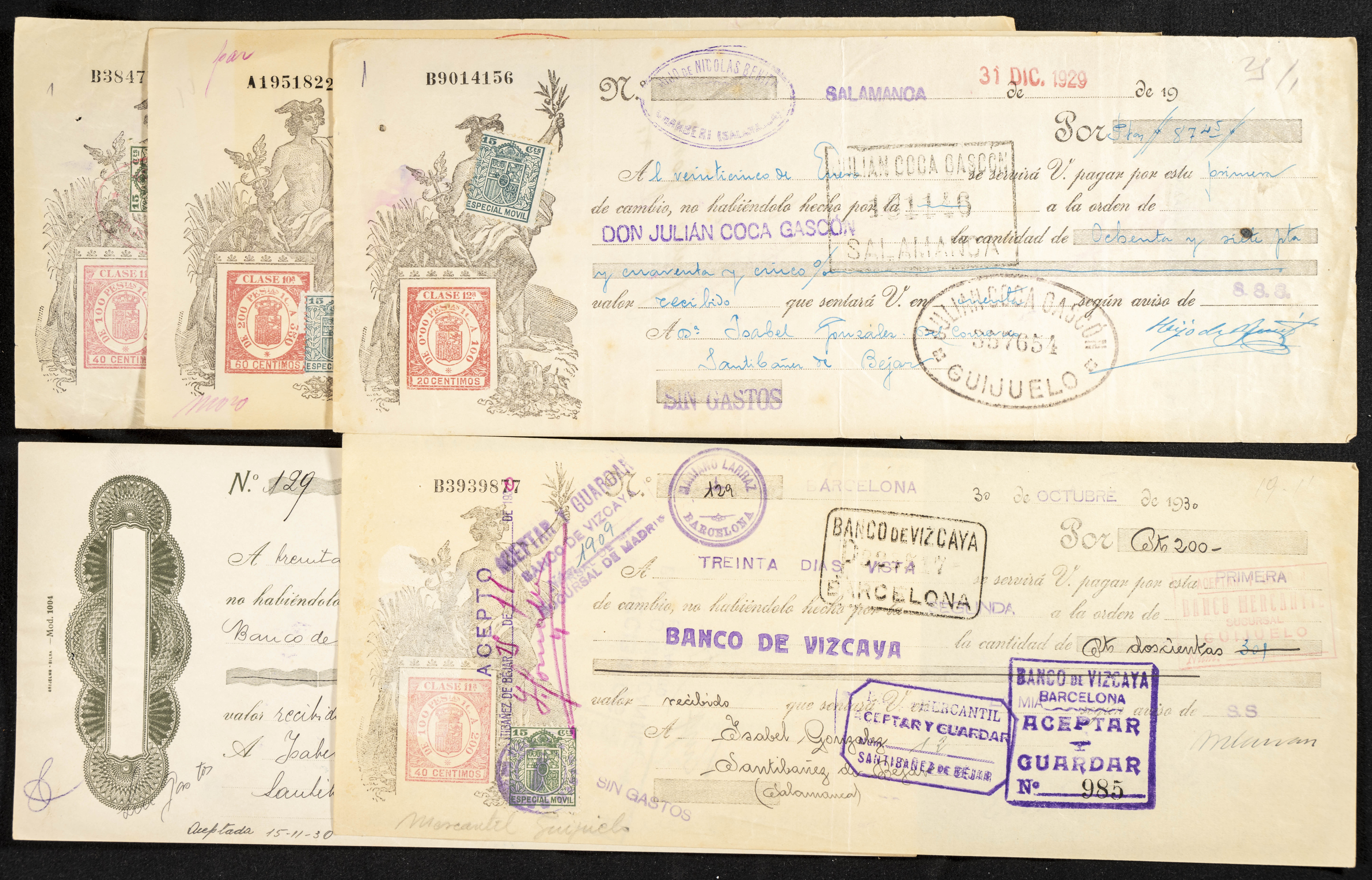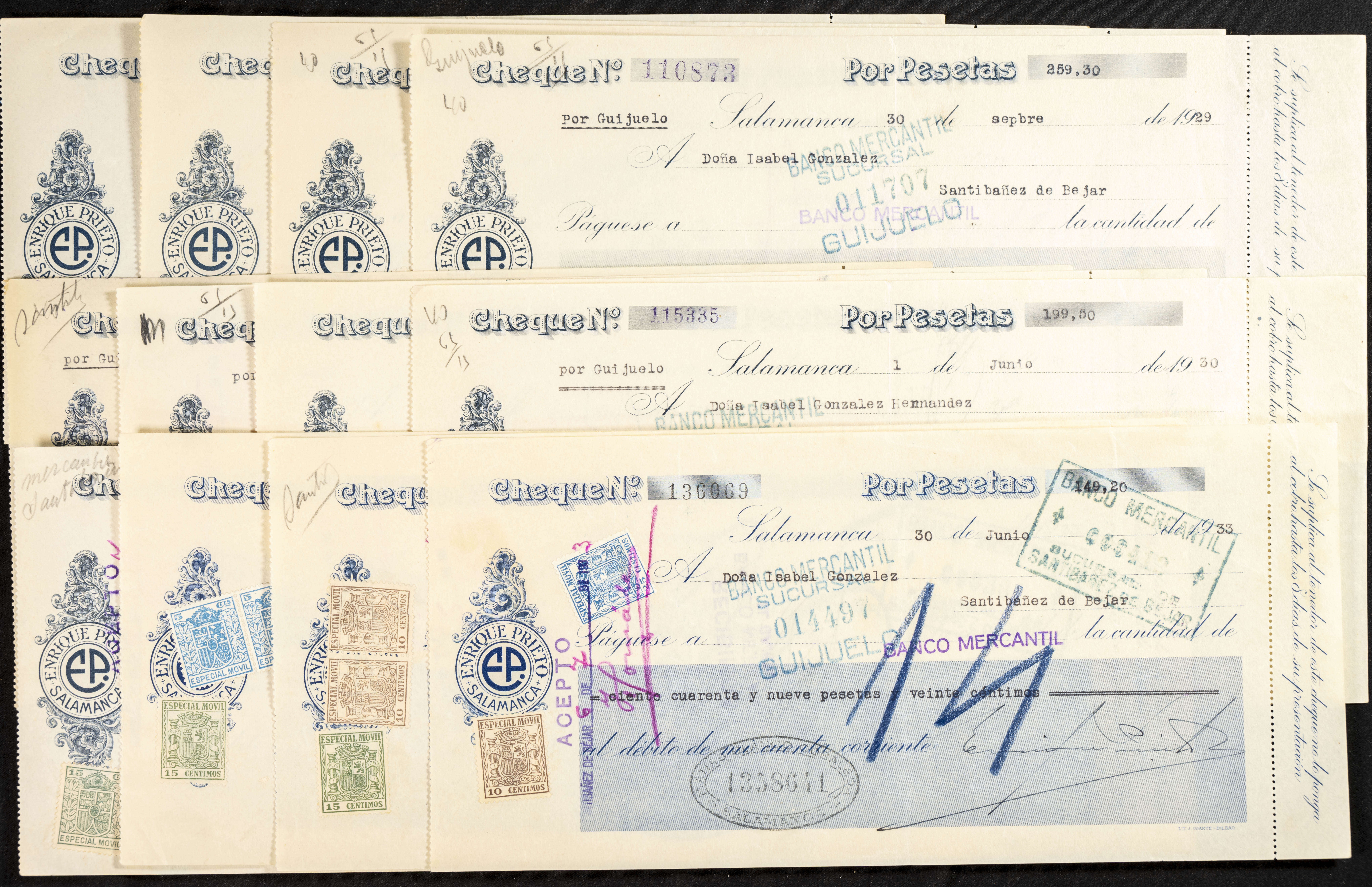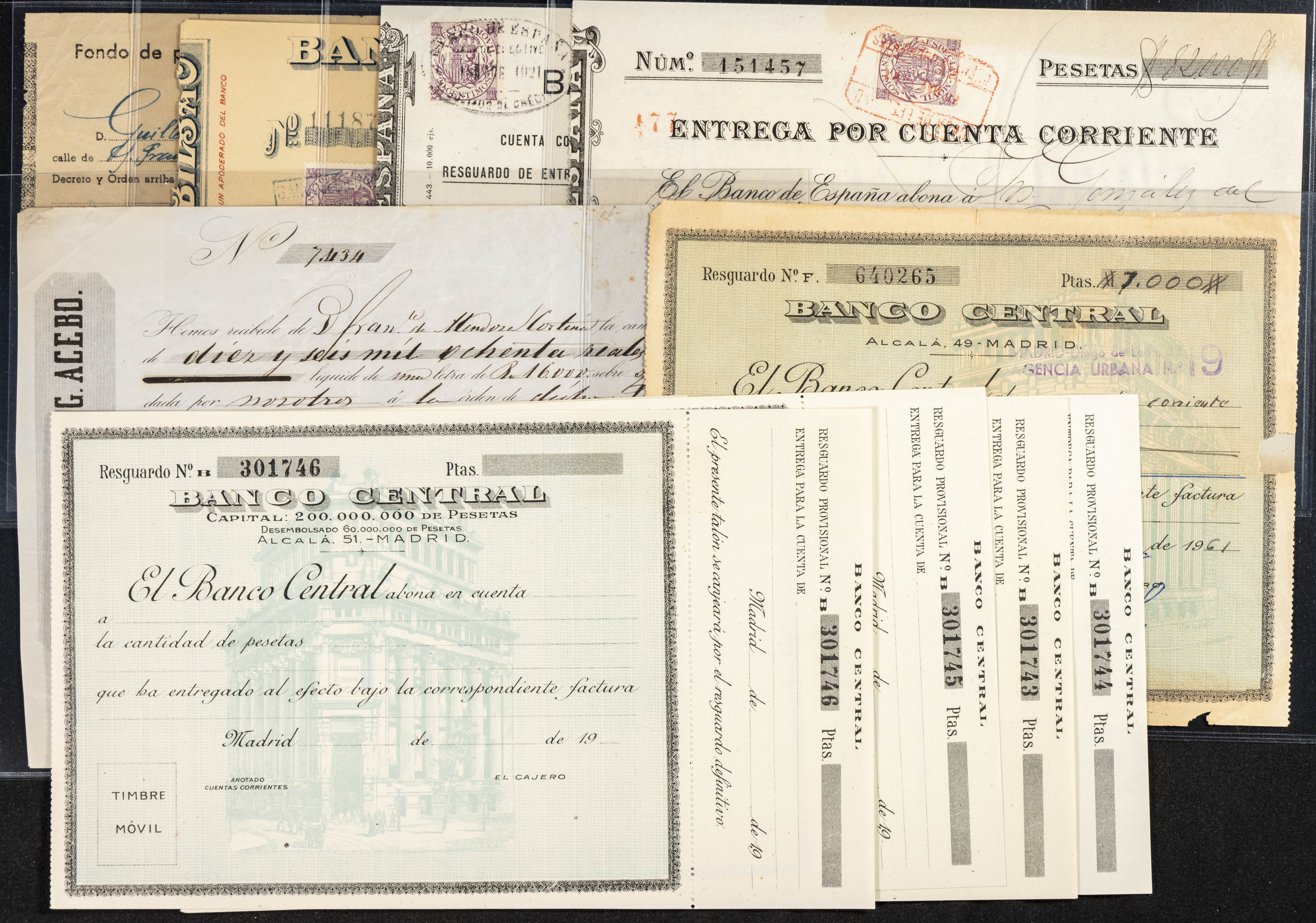 Interesante y muy amplio conjunto formado por cientos de pagarés, letras o cheques emitidos en España a lo largo de los siglos XIX y XX, su emisión corresponde, principalmente, a entidades privadas aunque encontramos también ejemplares emitidos por el Banco de España y presentando, una buena parte de ellos, sellos fiscales impresos o adheridos, diferentes estados de conservación. A EXAMINAR.