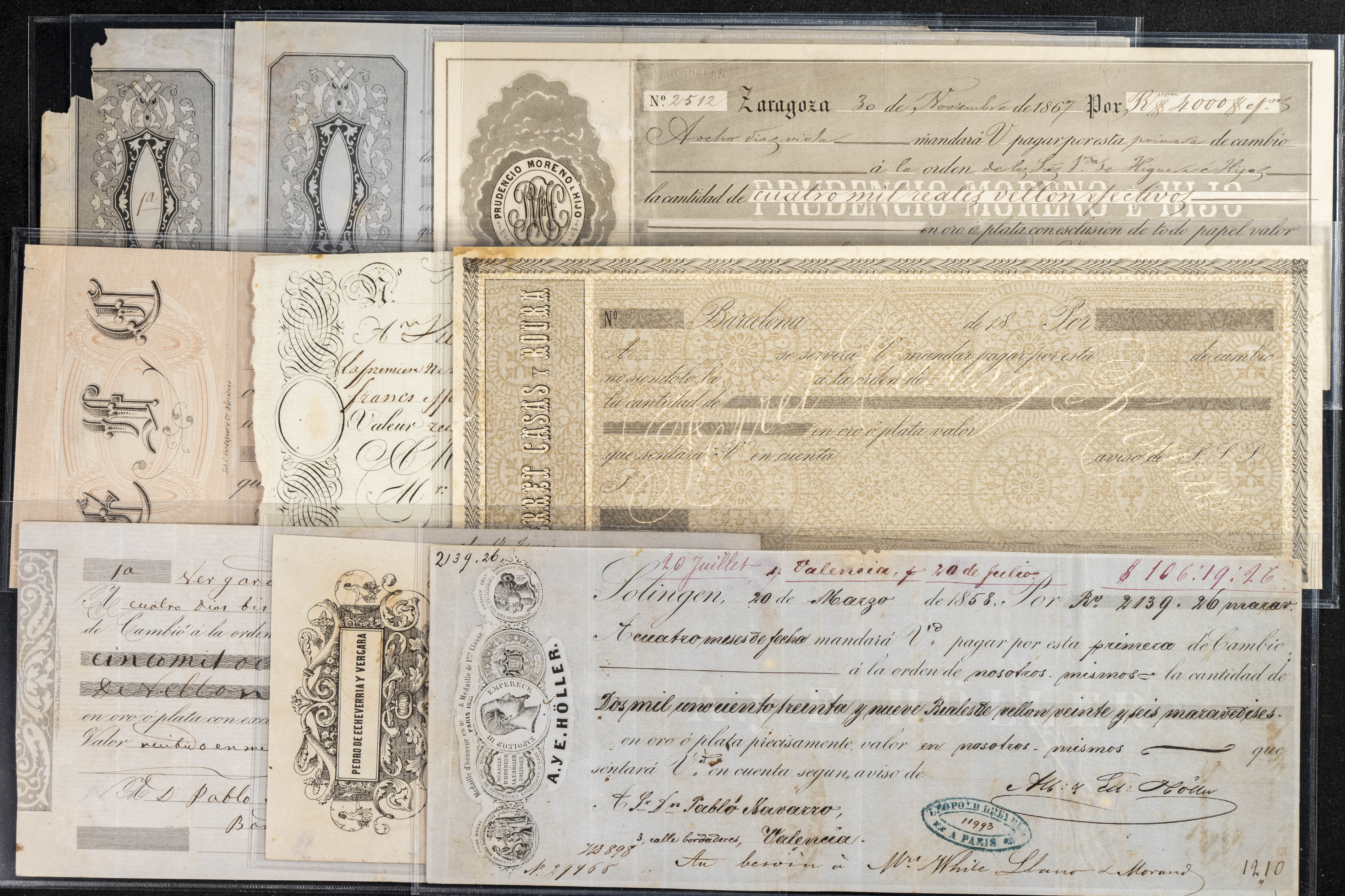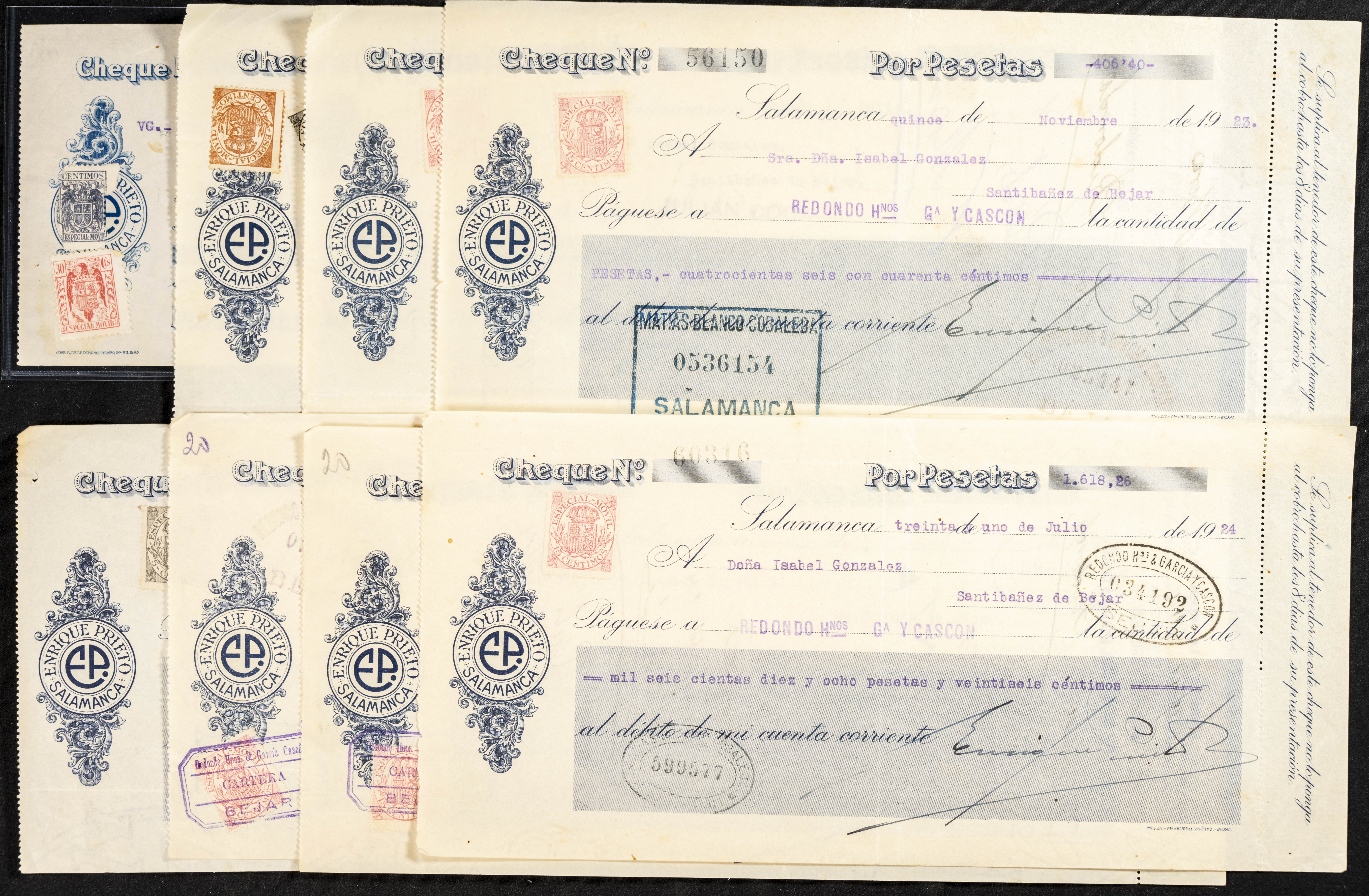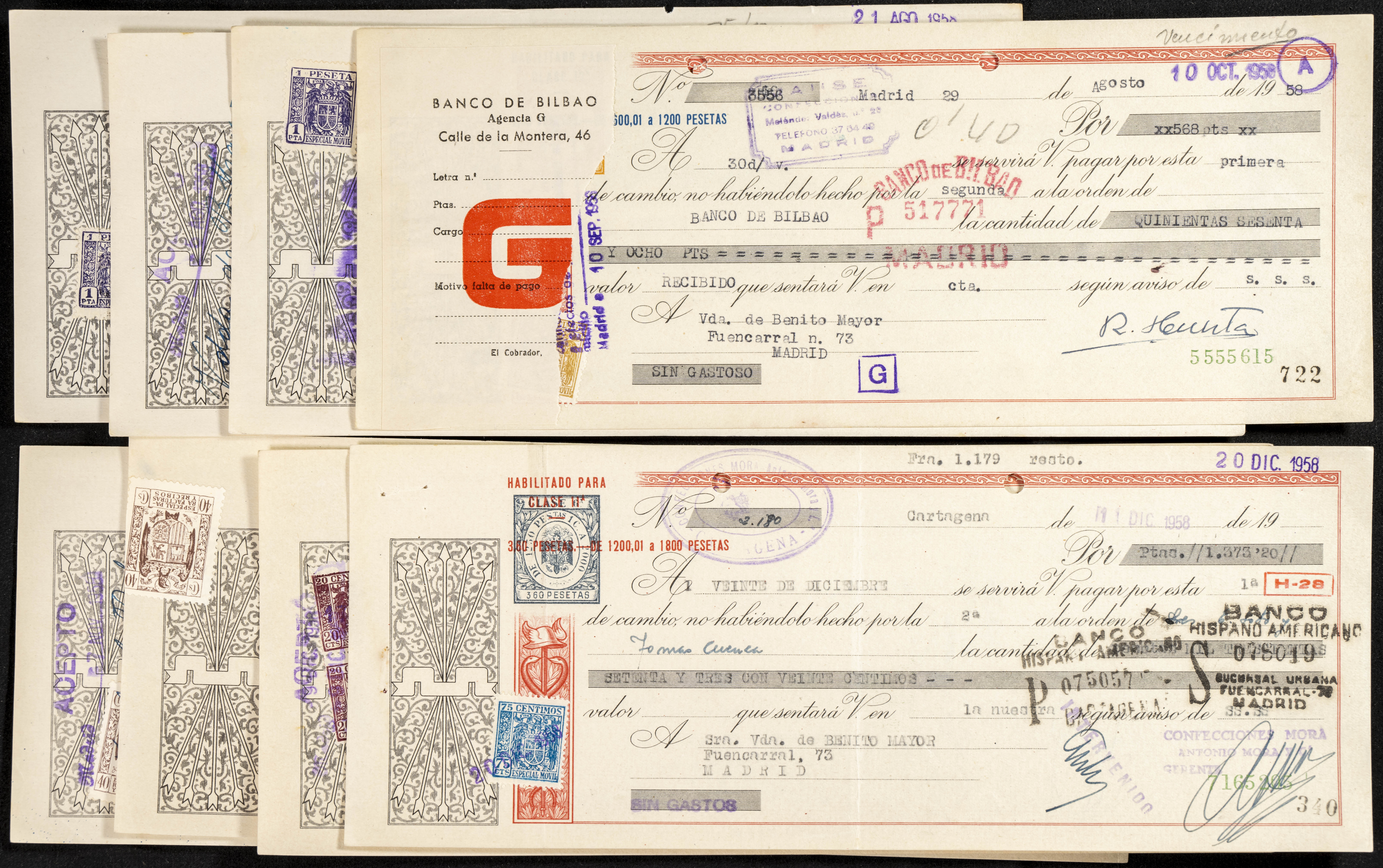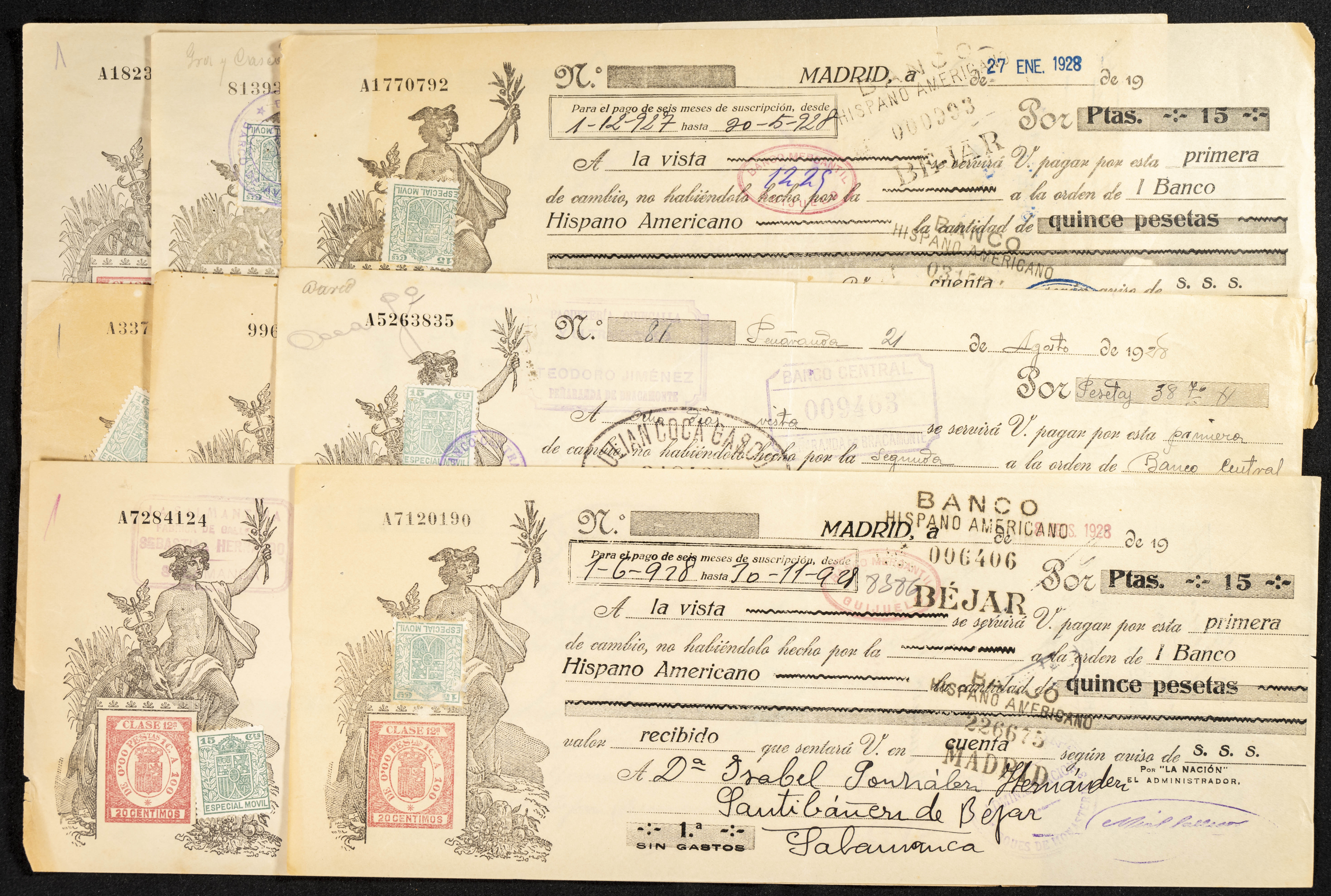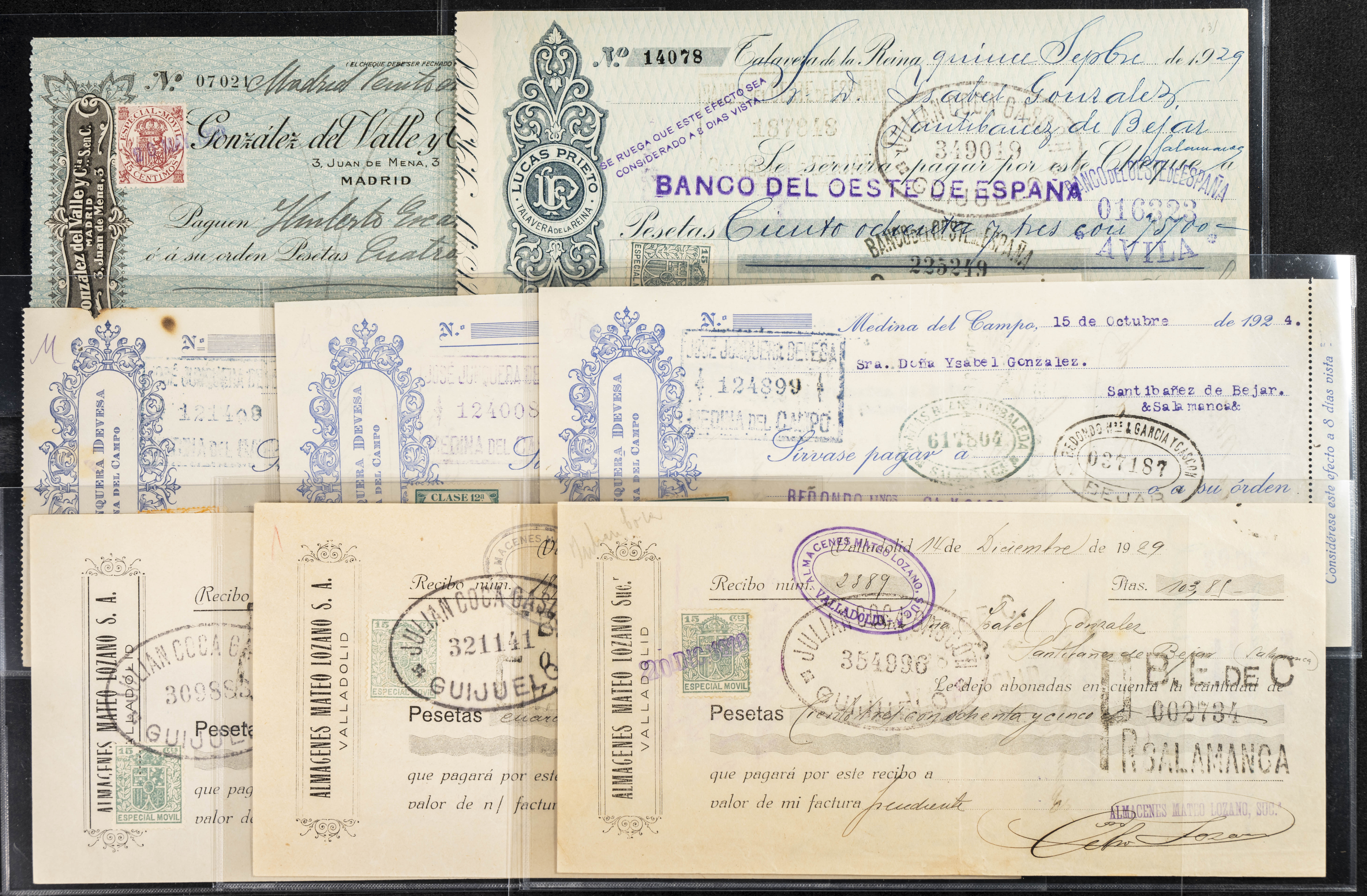 Interesante y muy amplio conjunto formado por cientos de pagarés, letras o cheques emitidos en España a lo largo de los siglos XIX y XX, su emisión corresponde, principalmente, a entidades privadas aunque encontramos también ejemplares emitidos por el Banco de España y presentando, una buena parte de ellos, sellos fiscales impresos o adheridos, diferentes estados de conservación. A EXAMINAR.