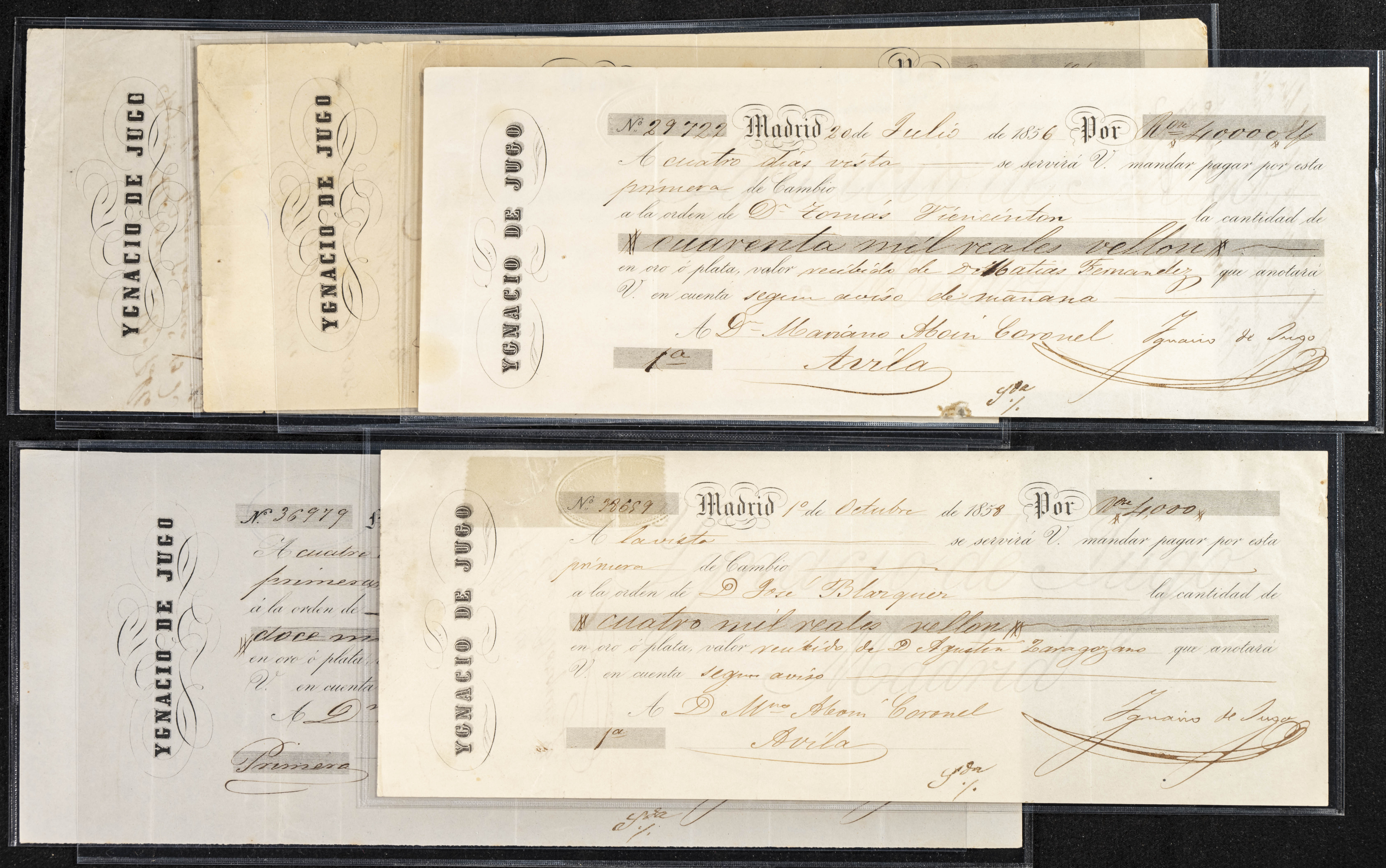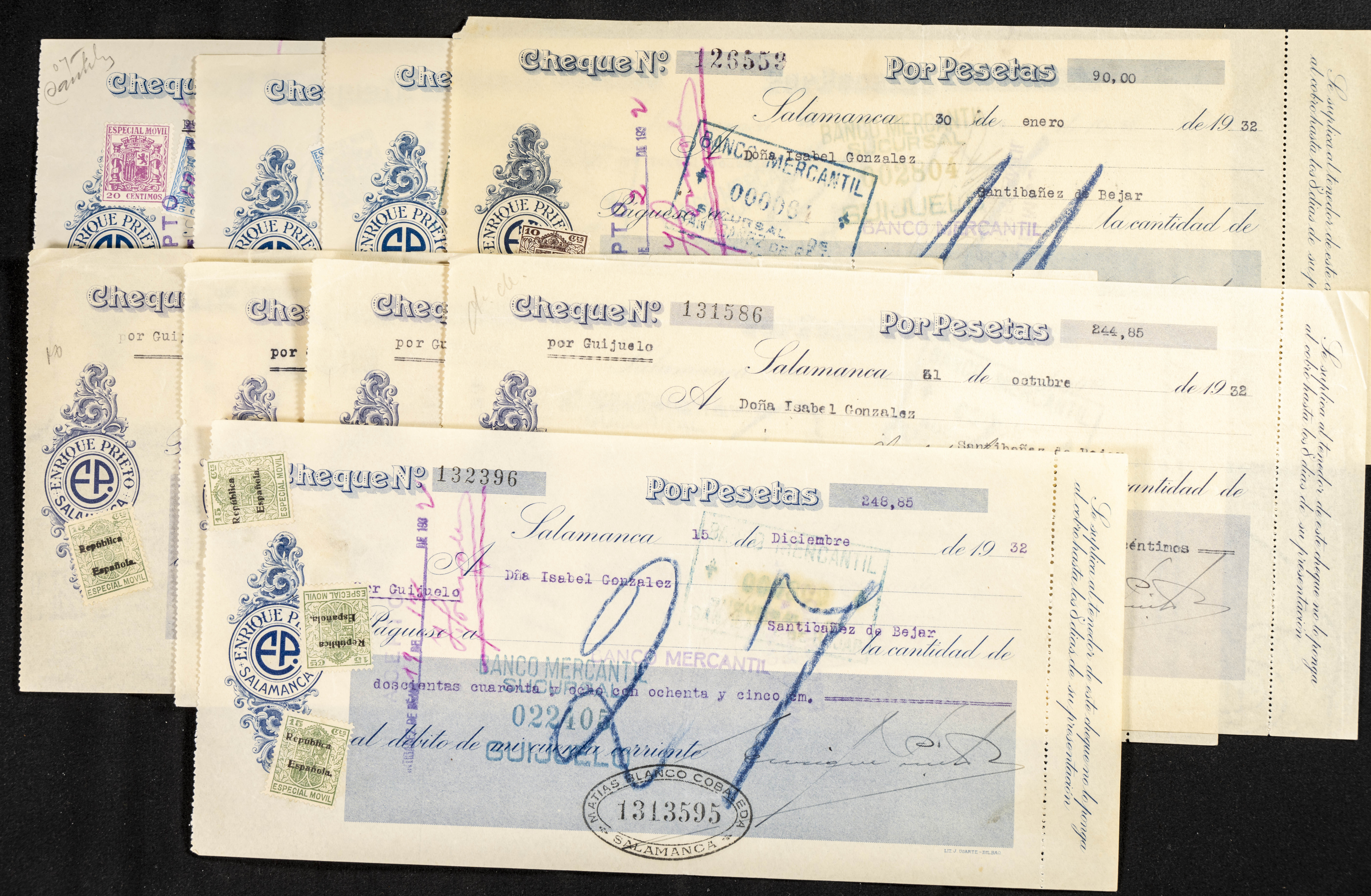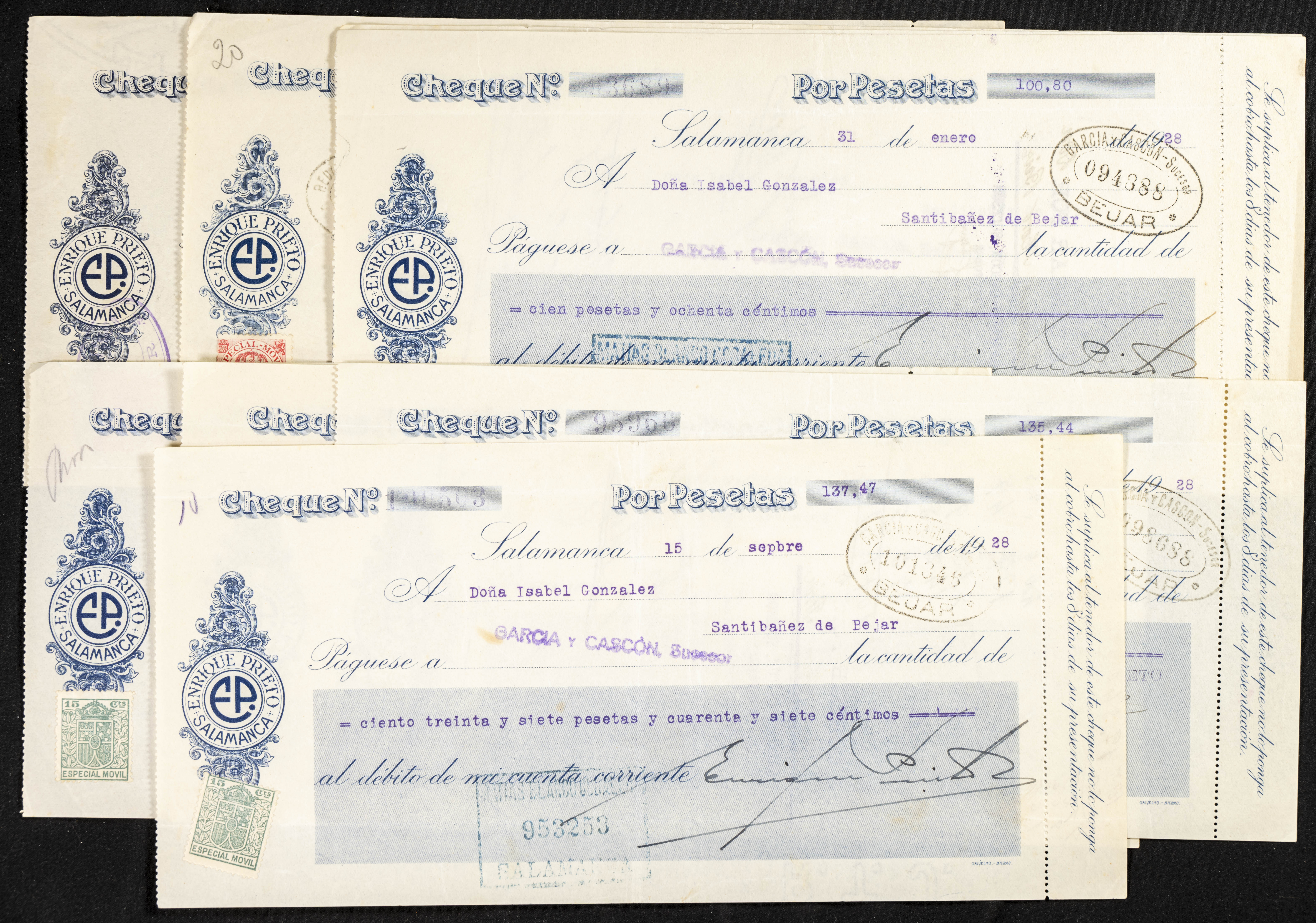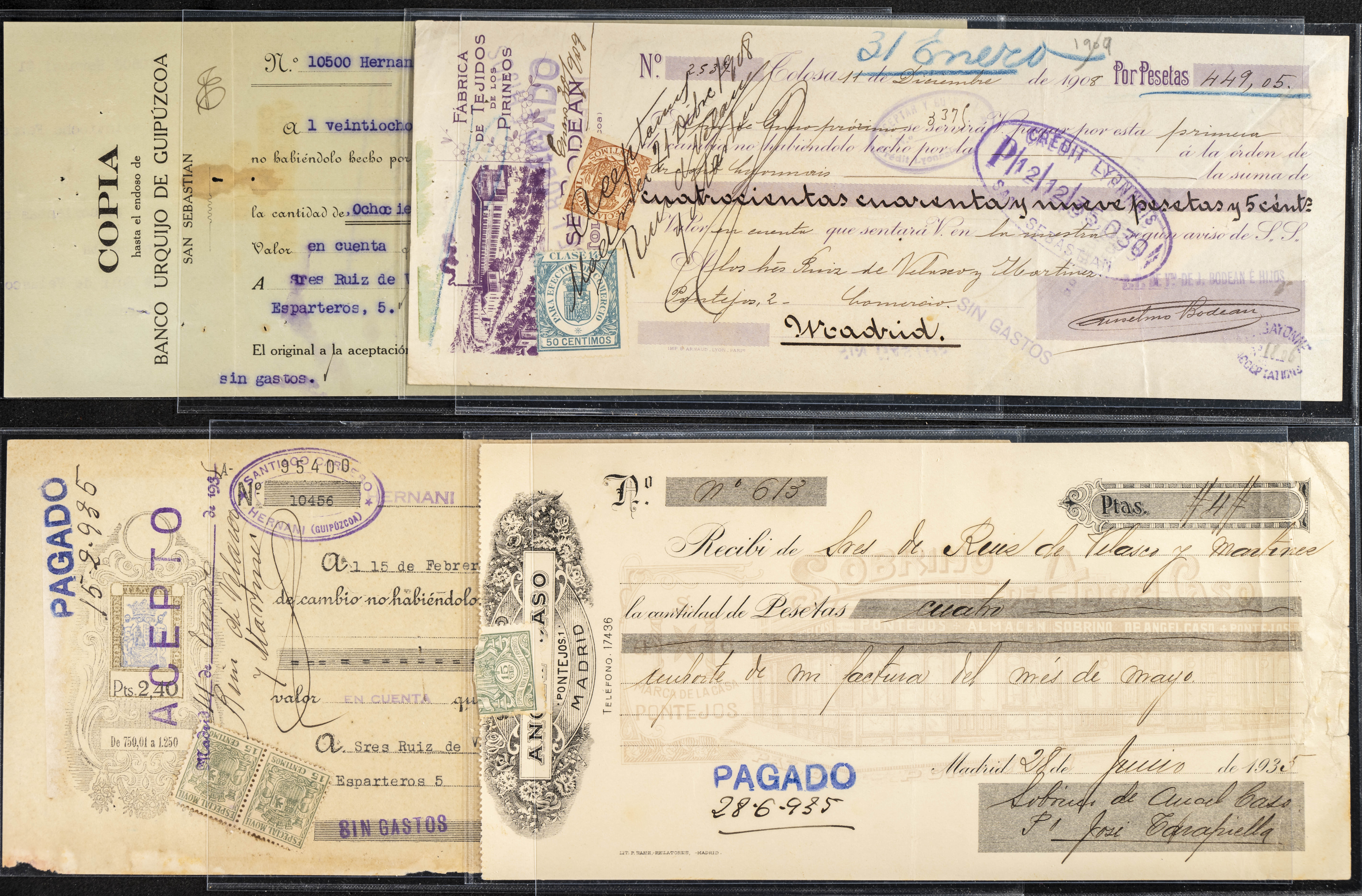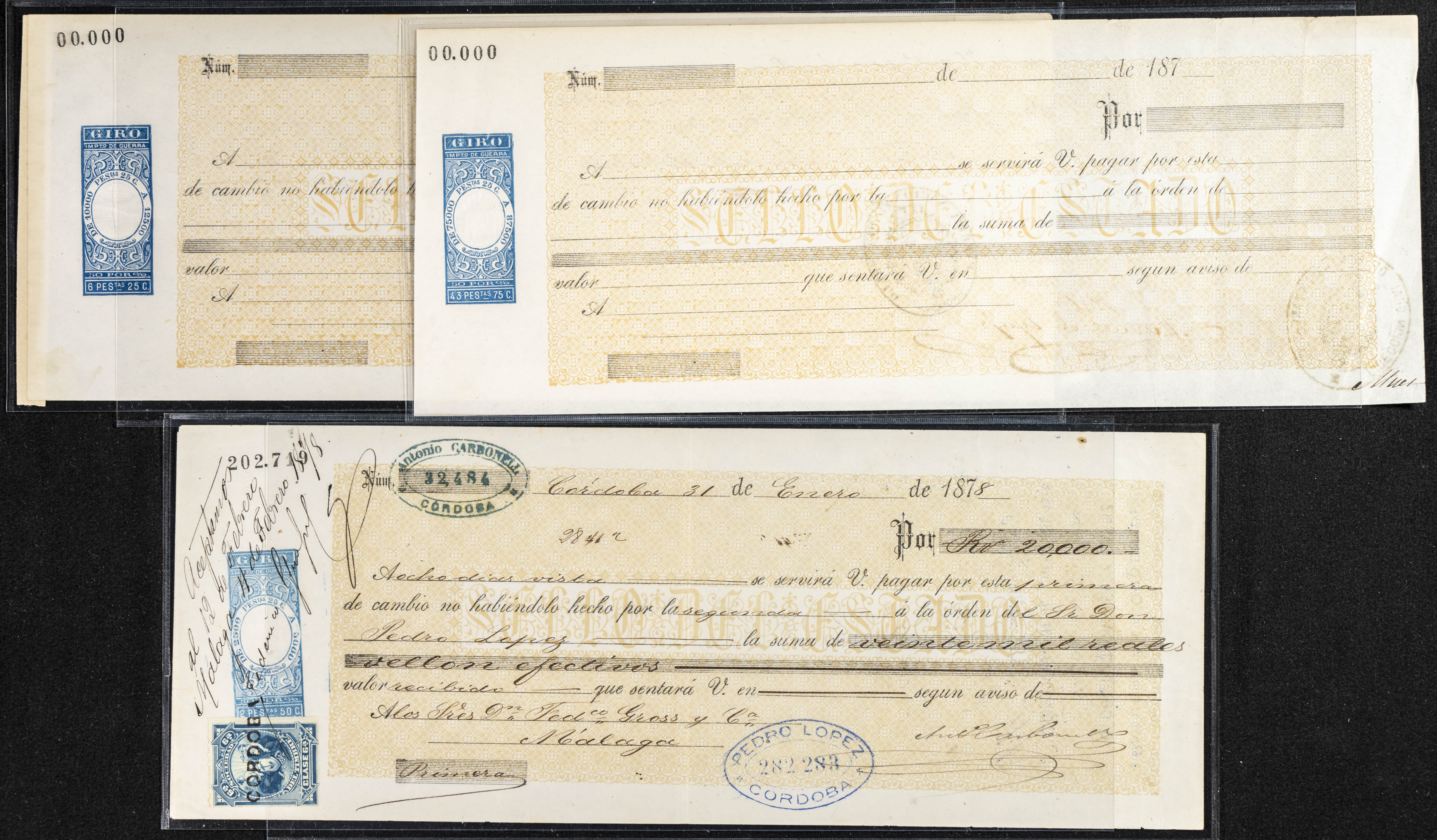 Interesante y muy amplio conjunto formado por cientos de pagarés, letras o cheques emitidos en España a lo largo de los siglos XIX y XX, su emisión corresponde, principalmente, a entidades privadas aunque encontramos también ejemplares emitidos por el Banco de España y presentando, una buena parte de ellos, sellos fiscales impresos o adheridos, diferentes estados de conservación. A EXAMINAR.