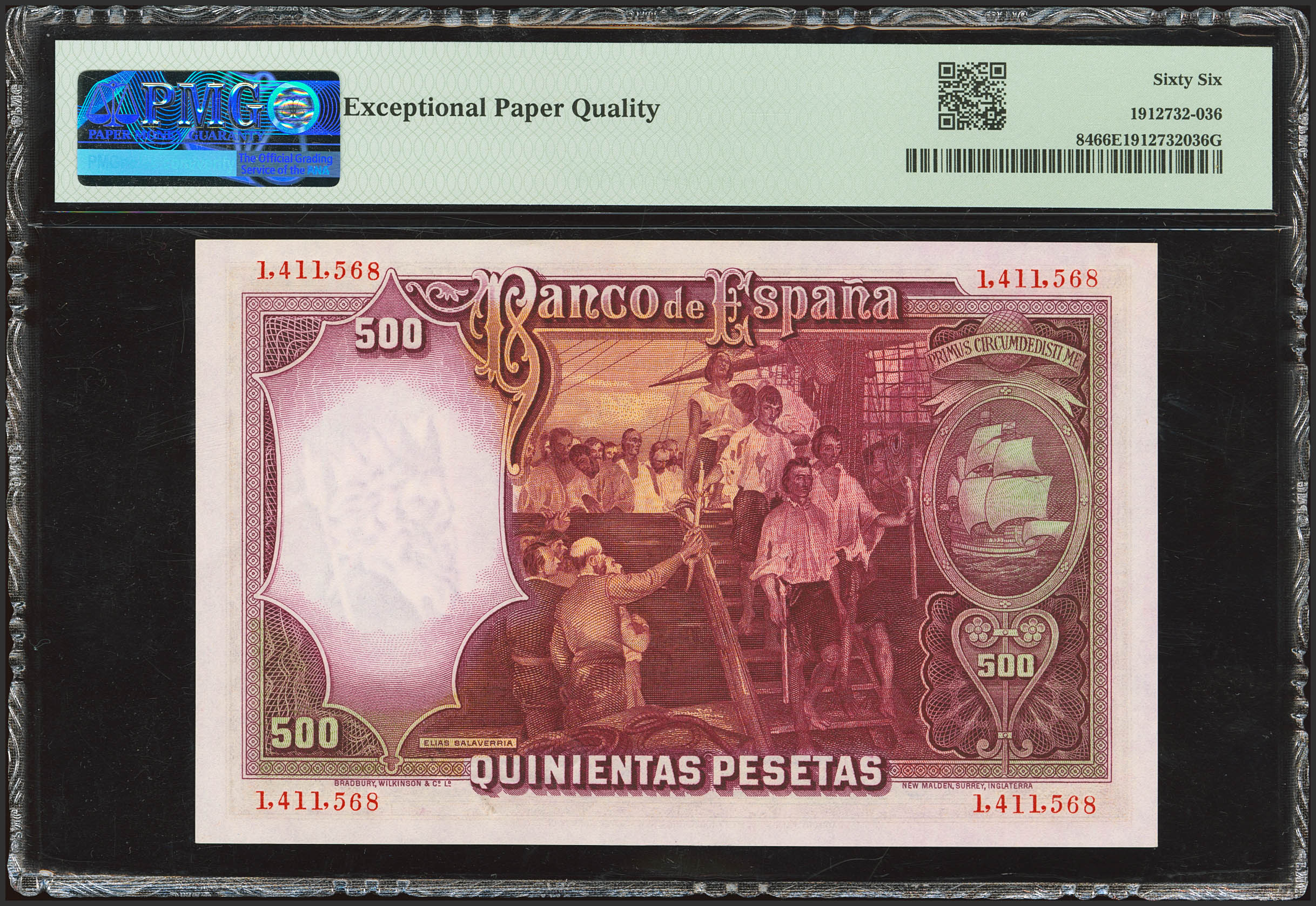 500 Pesetas. 25 de Abril de 1931. Sin serie. (Edifil 2023: 361, Pick: 84). Apresto original. SC. Encapsulado PMG66EPQ.