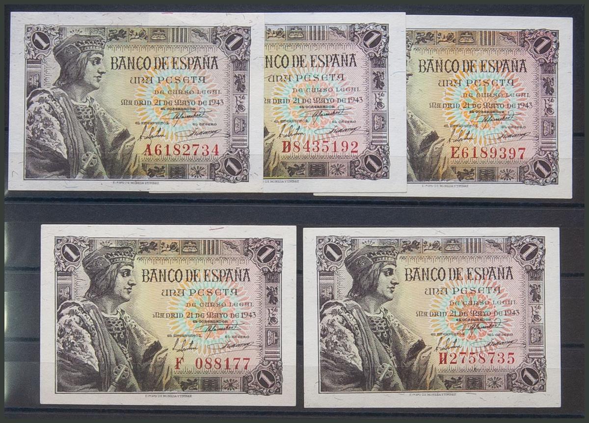 Conjunto de 5 billetes de 1 Peseta emitidos el 21 de Mayo de 1943 de las series A, D, E, F y H (Edifil 2017: 447a), todos ellos con apresto original. SC/SC-.