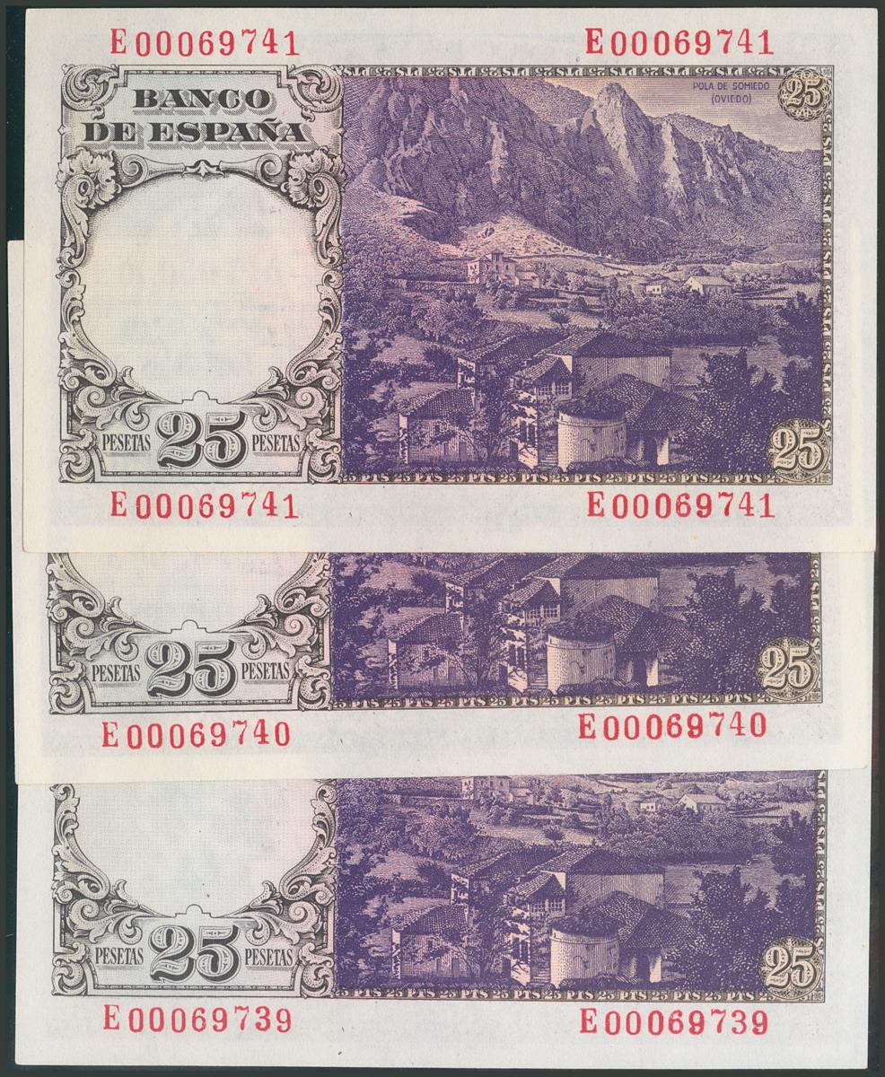 25 Pesetas. 19 de Febrero de 1946. Trío correlativo. Serie E. (Edifil 2017: 450a). Apresto original. SC-.