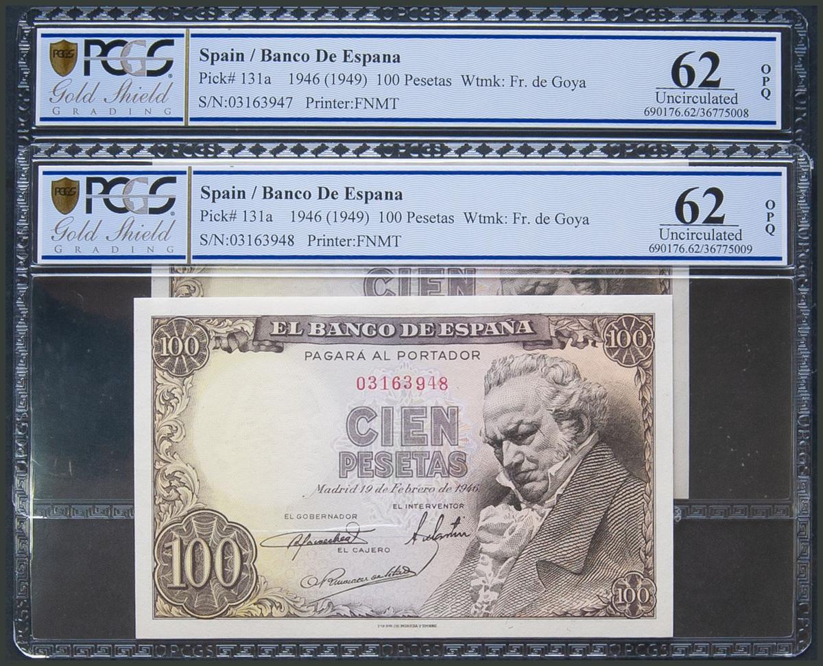100 Pesetas. 19 de Febrero de 1946. Pareja correlativa. Sin serie. (Edifil 2017: 451, Pick: 131a). SC. Encapsulado PCGS62OPQ, ambos.