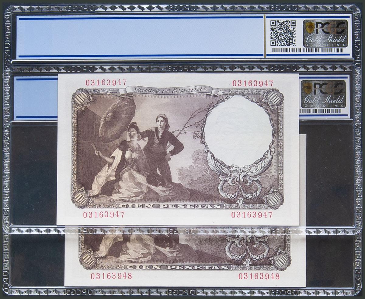 100 Pesetas. 19 de Febrero de 1946. Pareja correlativa. Sin serie. (Edifil 2017: 451, Pick: 131a). SC. Encapsulado PCGS62OPQ, ambos.