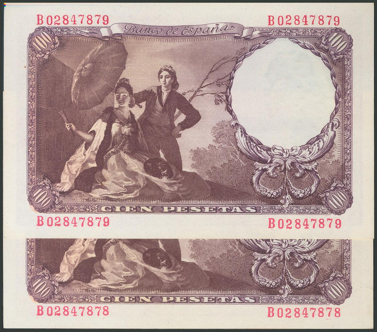 100 Pesetas. 19 de Febrero de 1946. Pareja correlativa. Serie B. (Edifil 2017: 451b). Apresto original. SC-.