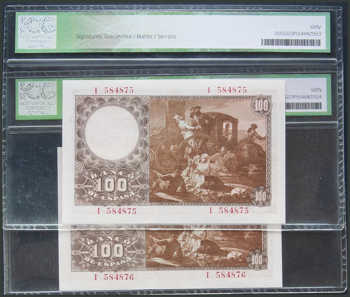 100 Pesetas. 2 de Mayo de 1948. Pareja correlativa. Serie I, última serie emitida. (Edifil 2017: 456a). SC. Encapsulado ICG60, ambos.