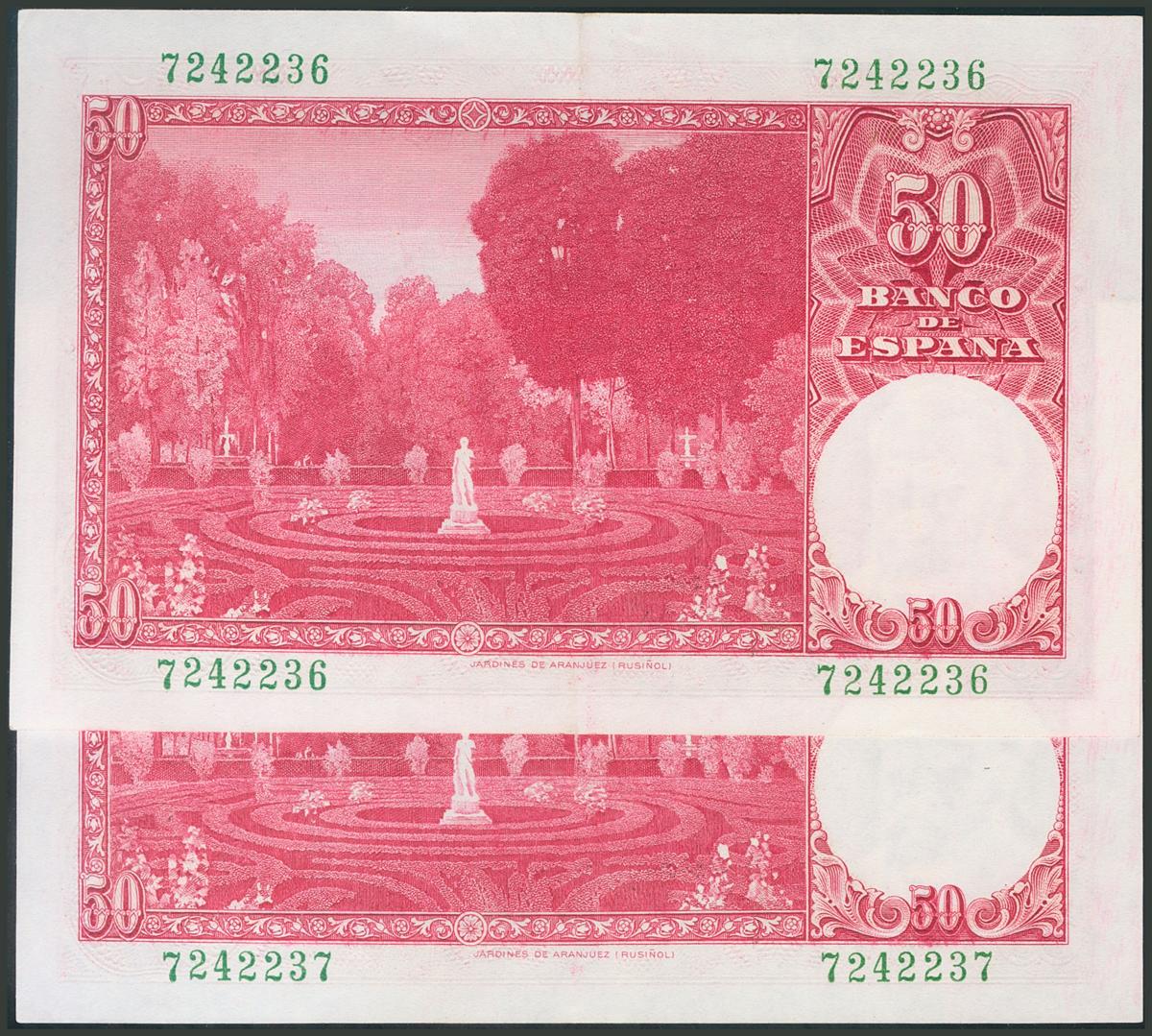50 Pesetas. 31 de diciembre de 1951. Pareja correlativa. Sin serie. (Edifil 2017: 462). Apresto original. Inusual. EBC+.