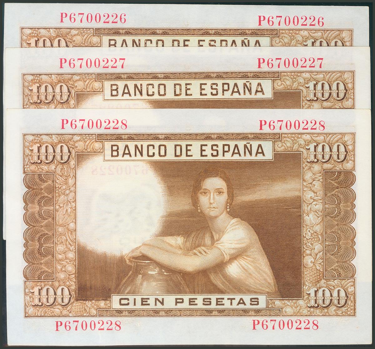 100 Pesetas. 7 de Abril de 1953. Trío correlativo. Serie P. (Edifil 2017: 464b). SC-.