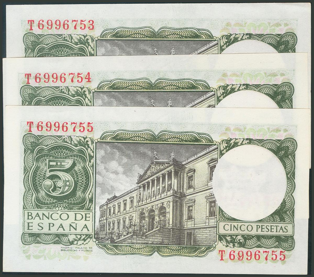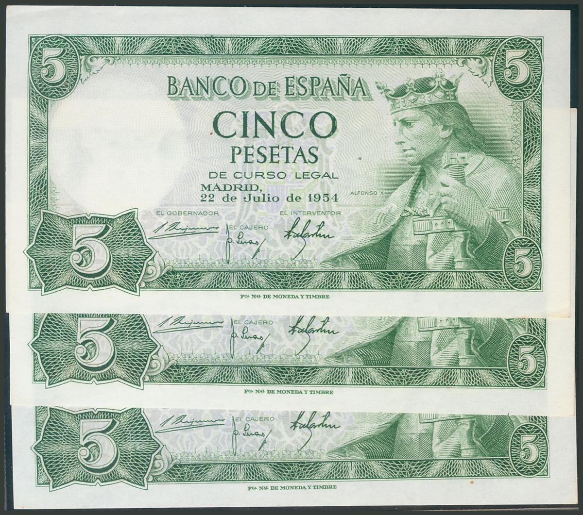 5 Pesetas. 22 de Julio de 1954. Trío correlativo. Serie T. (Edifil 2017: 466a). SC-.
