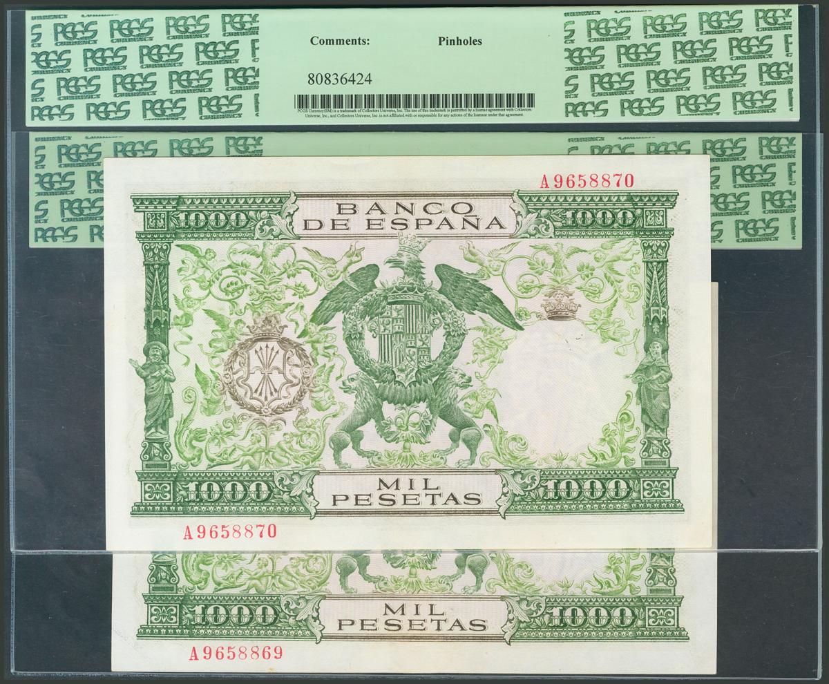 1000 Pesetas. 29 de Noviembre de 1957. Pareja correlativa. Serie A. (Edifil 2017: 469a). Encapsulado PCGS40 y 45. EBC.