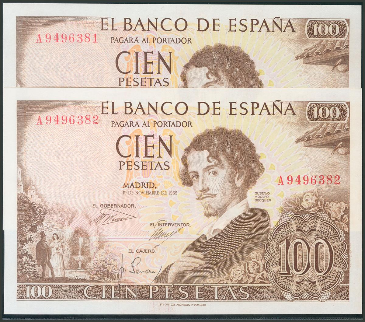 100 Pesetas. 19 de Noviembre de 1965. Pareja correlativa. Serie A. (Edifil 2017: 470a). Apresto original. SC.