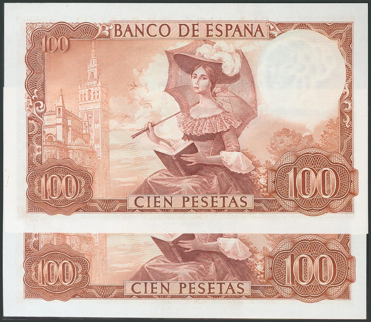 100 Pesetas. 19 de Noviembre de 1965. Pareja correlativa. Serie A. (Edifil 2017: 470a). Apresto original. SC.