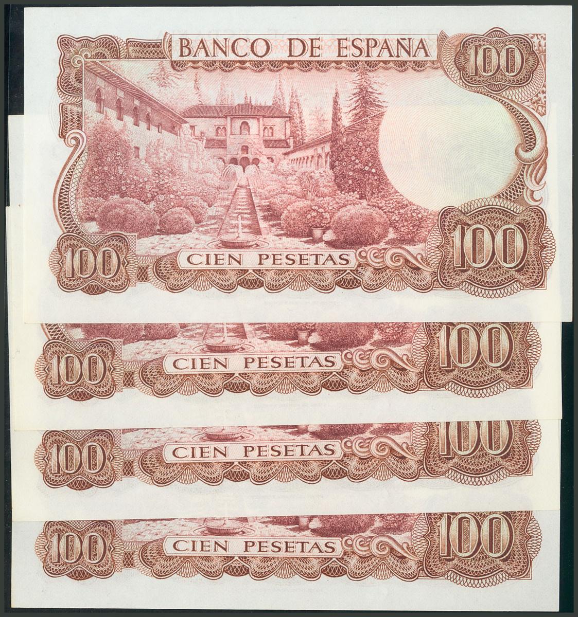 Conjunto de 4 billetes de 100 Pesetas, emitidos el 17 de Noviembre de 1970, todos ellos correlativos y con la serie 9A. Edifil 2017: 472d. SC/SC-.