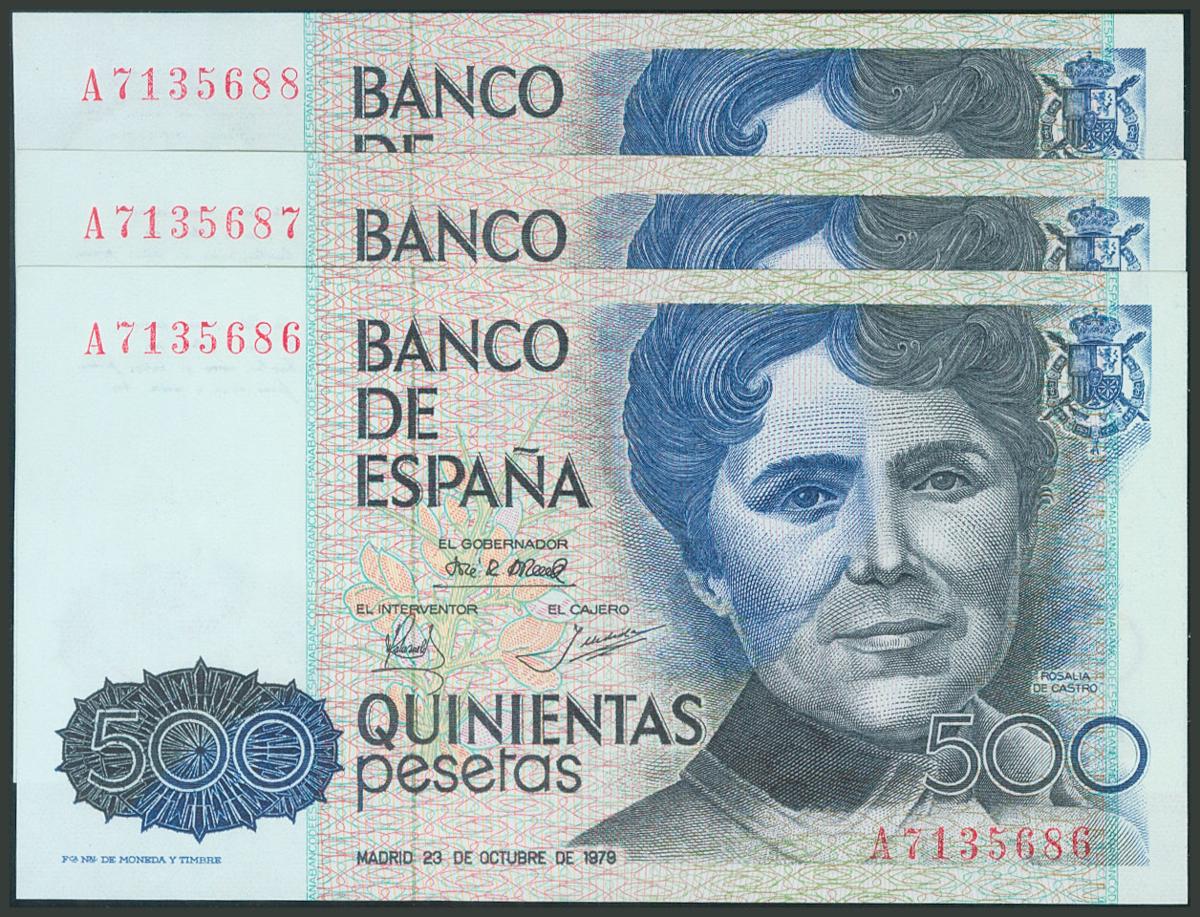 500 Pesetas. 23 de Octubre de 1979. Trío correlativo. Serie A. (Edifil 2017: 476a). Apresto original. SC.