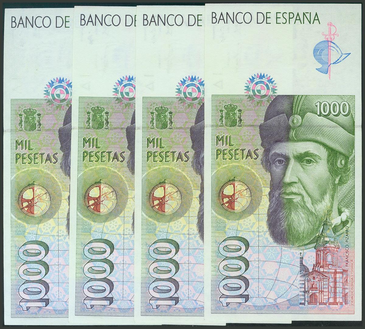 Conjunto de 4 billetes correlativos de 1000 Pesetas emitidos el 12 de Octubre de 1992 sin serie (Edifil 2017: 483), con el apresto original. SC.