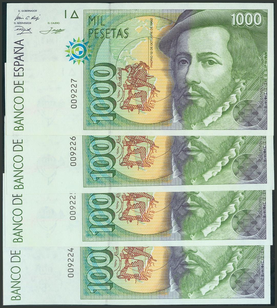 Conjunto de 4 billetes correlativos de 1000 Pesetas emitidos el 12 de Octubre de 1992 sin serie (Edifil 2017: 483), con el apresto original. SC.
