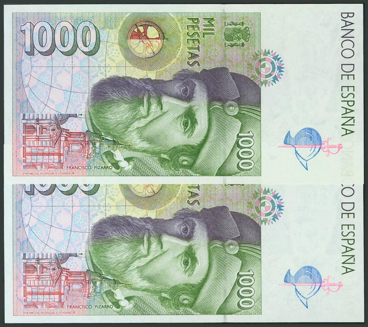 1000 Pesetas. 12 de Octubre de 1992. Pareja correlativa. Serie A. (Edifil 2017: 483a). Apresto original. SC.