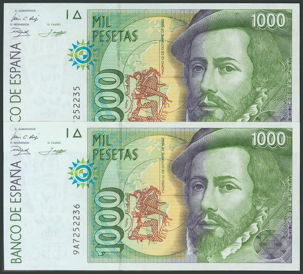 1000 Pesetas. 12 de Octubre de 1992. Pareja correlativa. Serie especial 9A. (Edifil 2017: 483c). Apresto original. SC.