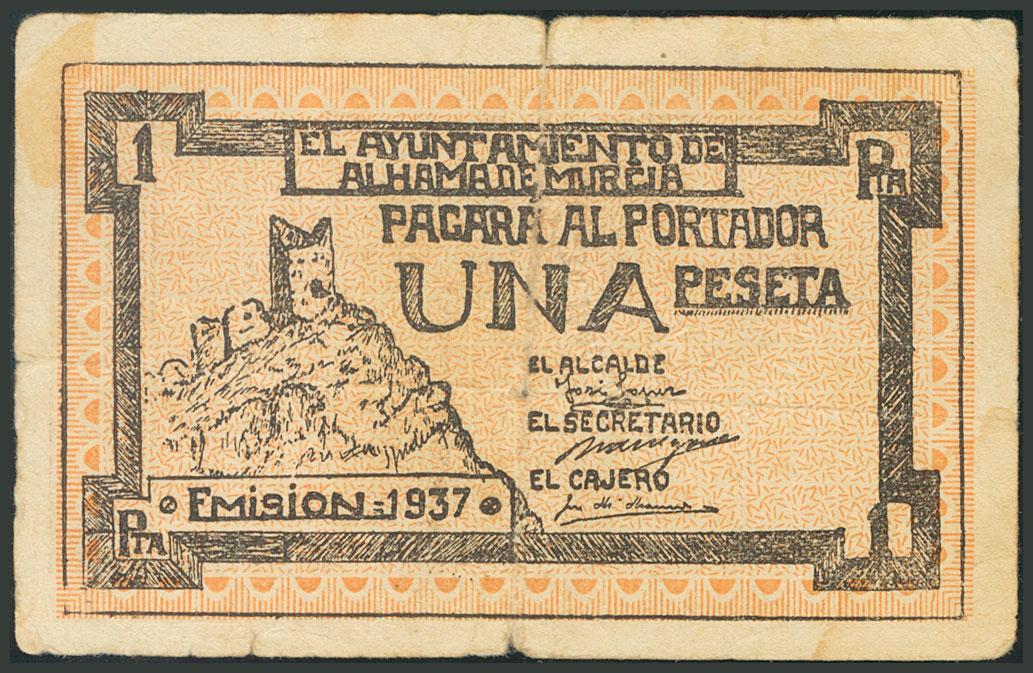 ALHAMA DE MURCIA (MURCIA). 1 Peseta. 1937. Serie B. (González: 496). BC.
