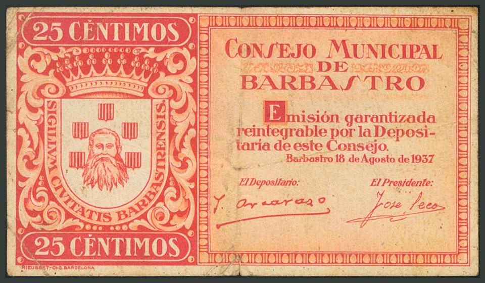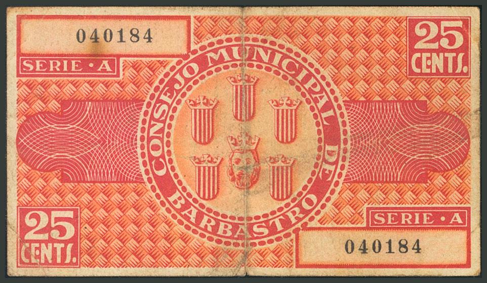 BARBASTRO (HUESCA). 25 Céntimos. 18 de Agosto de 1937. (González: 880). RC.