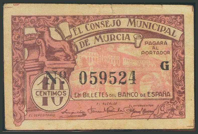 MURCIA. 10 Céntimos. 1938. Serie G. (González: 3770). MBC.