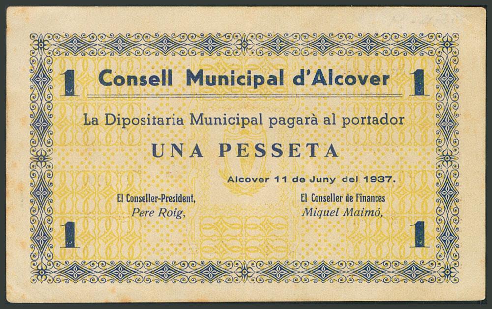 ALCOVER (TARRAGONA). 1 Peseta. 11 de Junio de 1937. Serie A. (González: 6147). EBC-.