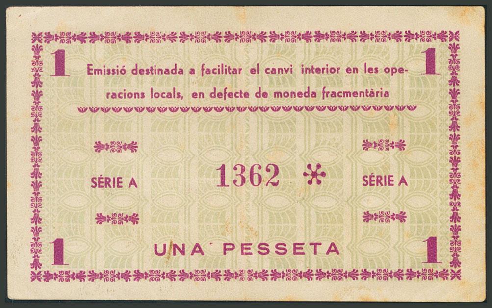ALCOVER (TARRAGONA). 1 Peseta. 11 de Junio de 1937. Serie A. (González: 6147). EBC-.