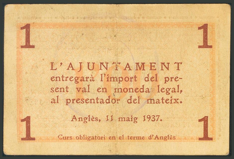 ANGLES (GERONA). 1 Peseta. 11 de Mayo de 1937. Serie A. (González: 6288). MBC.