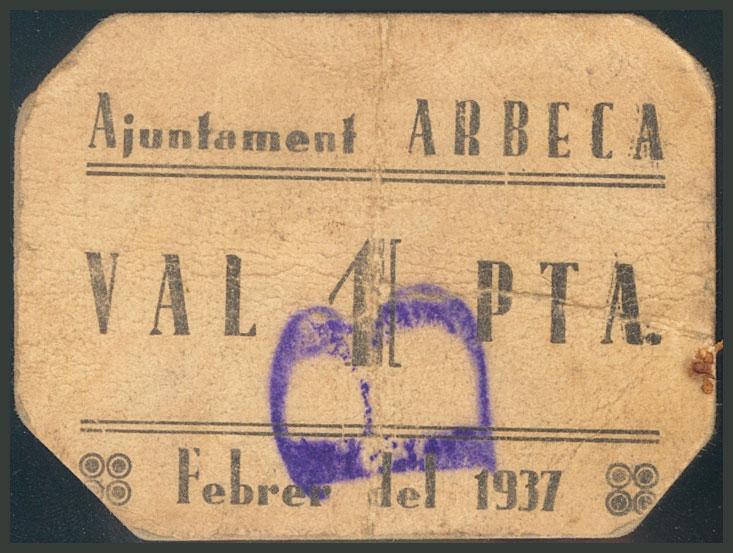 ARBECA (LERIDA). 1 Peseta. Febrero 1937. Serie B. (González: 6309). BC.