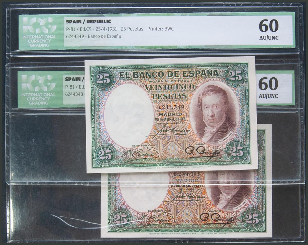 25 Pesetas. 25 de Abril de 1931. Pareja correlativa. Sin serie. (Edifil 2017: 358). SC. Encapsulado ICG60, ambos.