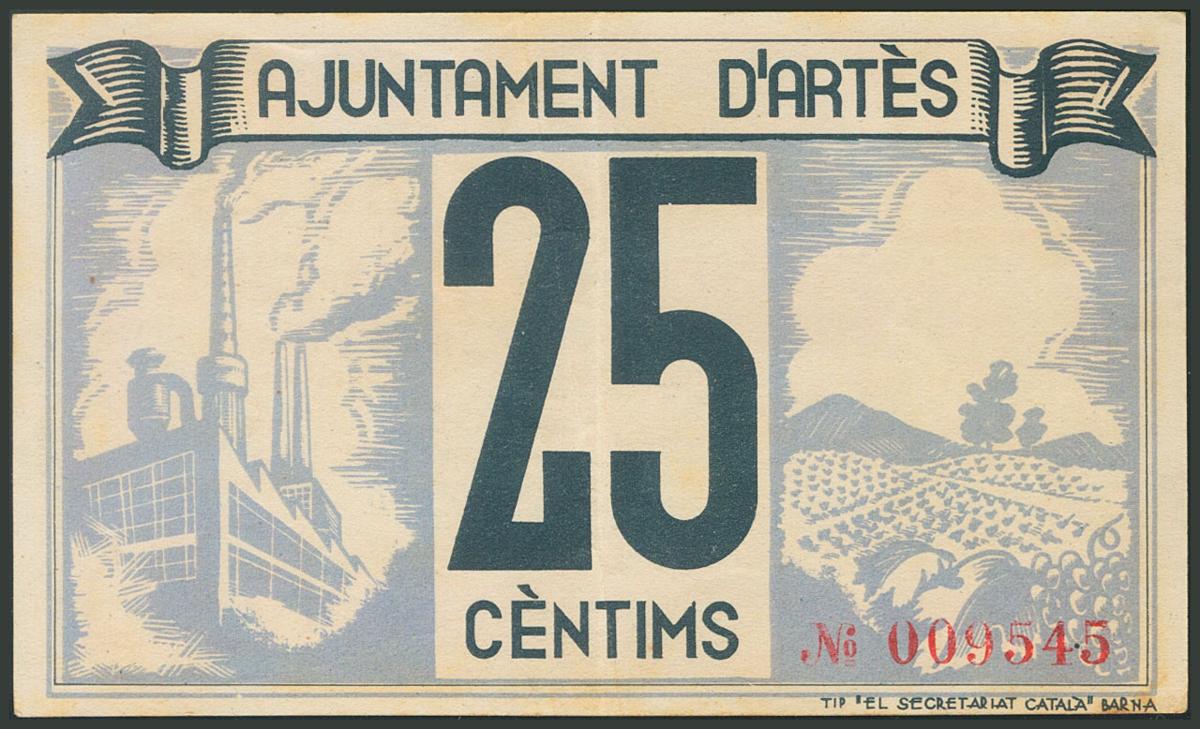ARTES (BARCELONA). 25 Céntimos. (1938ca). (González: 6415). EBC.