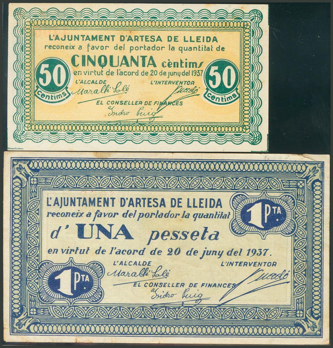 ARTESA DE LLEIDA (LERIDA). 50 Céntimos y 1 Peseta. 20 de Junio de 1937. (González: 6424/25). MBC/BC.