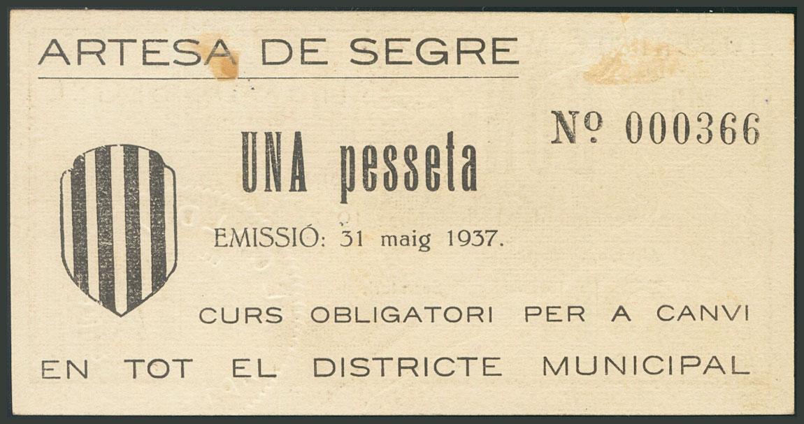 ARTESA DE SEGRE (LERIDA). 1 Peseta. 31 de Mayo de 1937. (González: 6432). EBC.