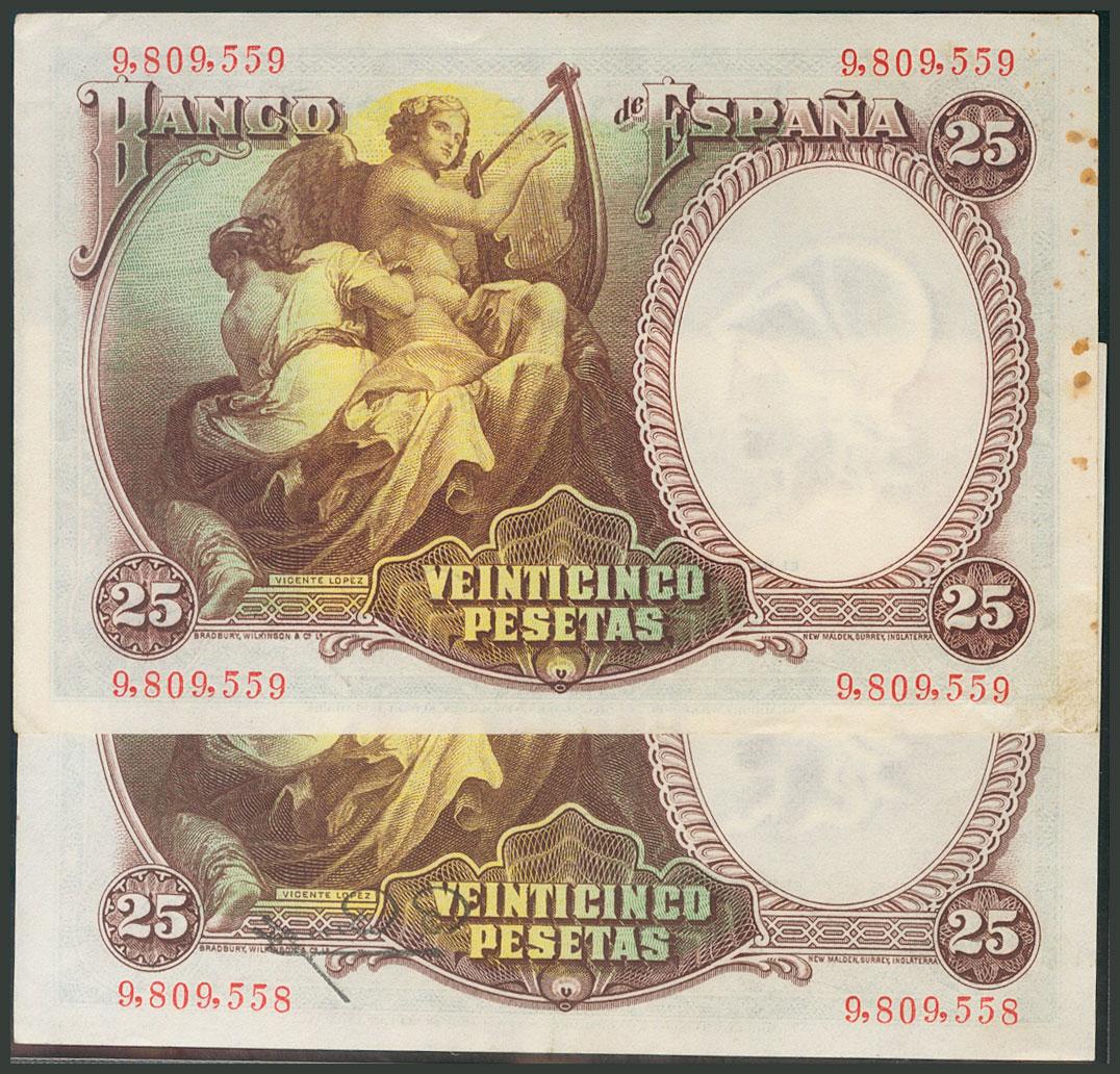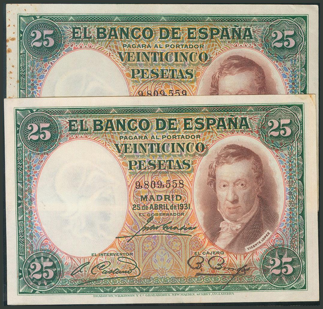 25 Pesetas. 25 de Abril de 1931. Pareja correlativa. Sin serie. Uno de los billetes con manchitas de óxido. (Edifil 2017: 358). Apresto original. EBC/EBC-.